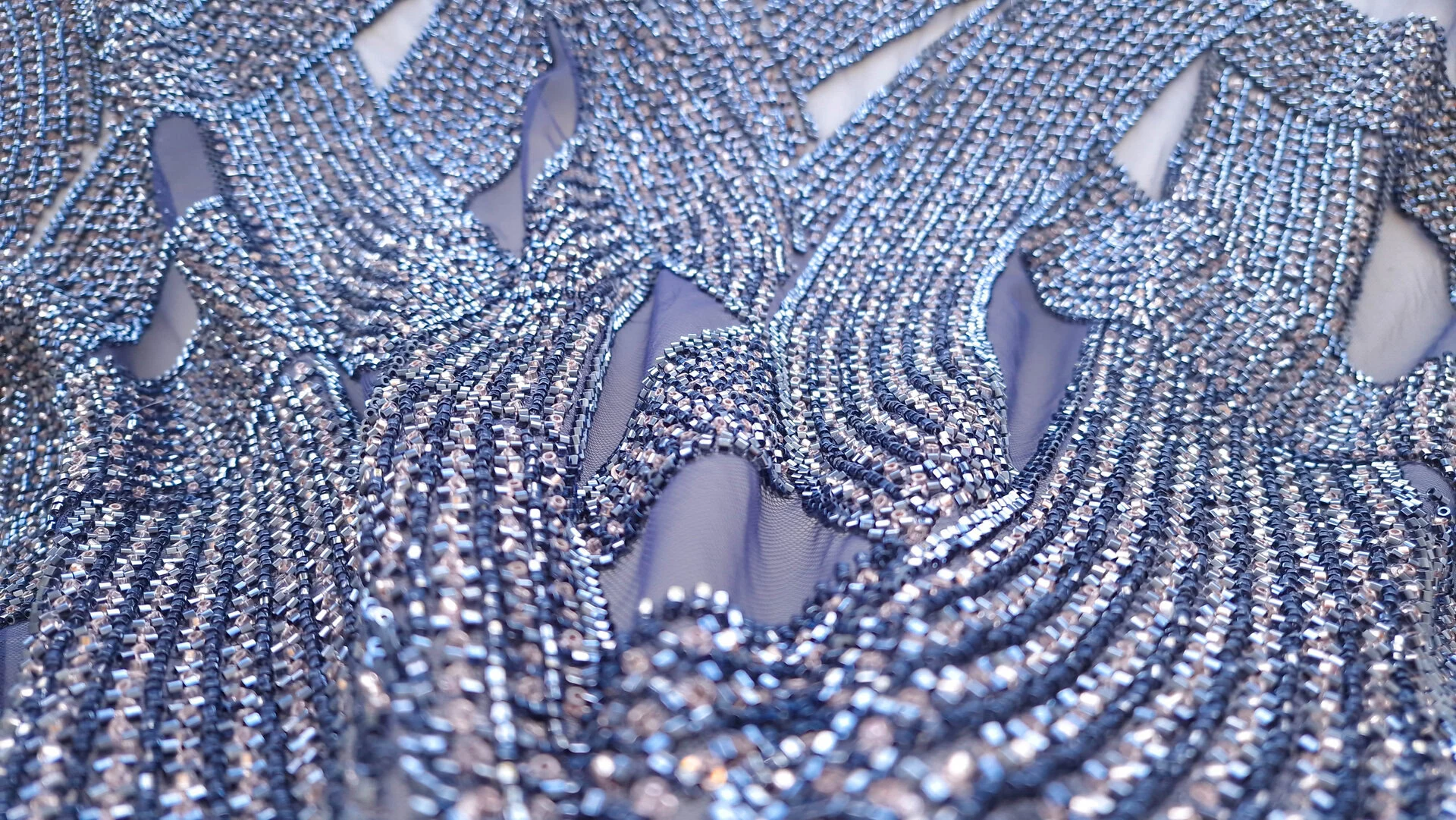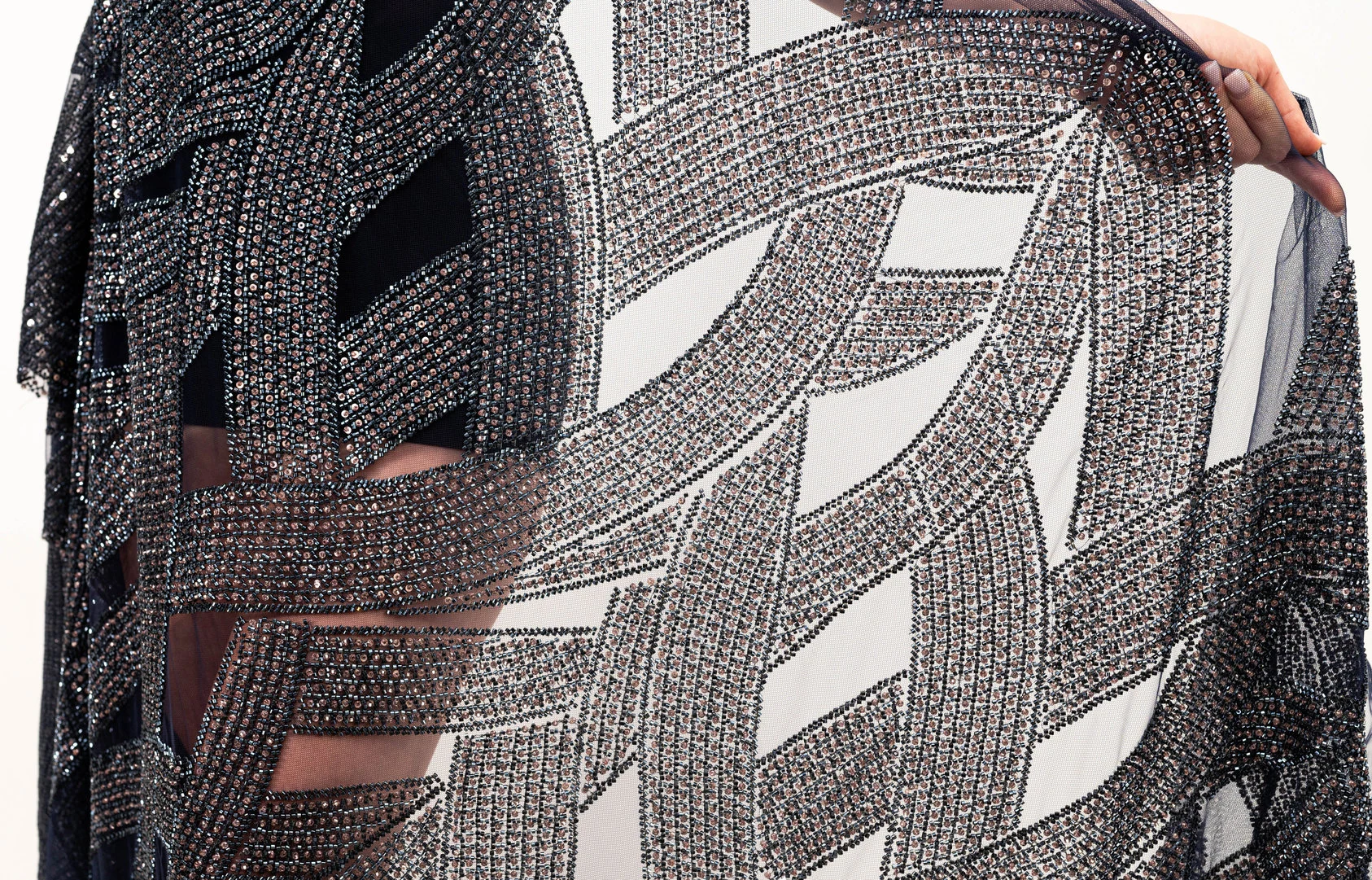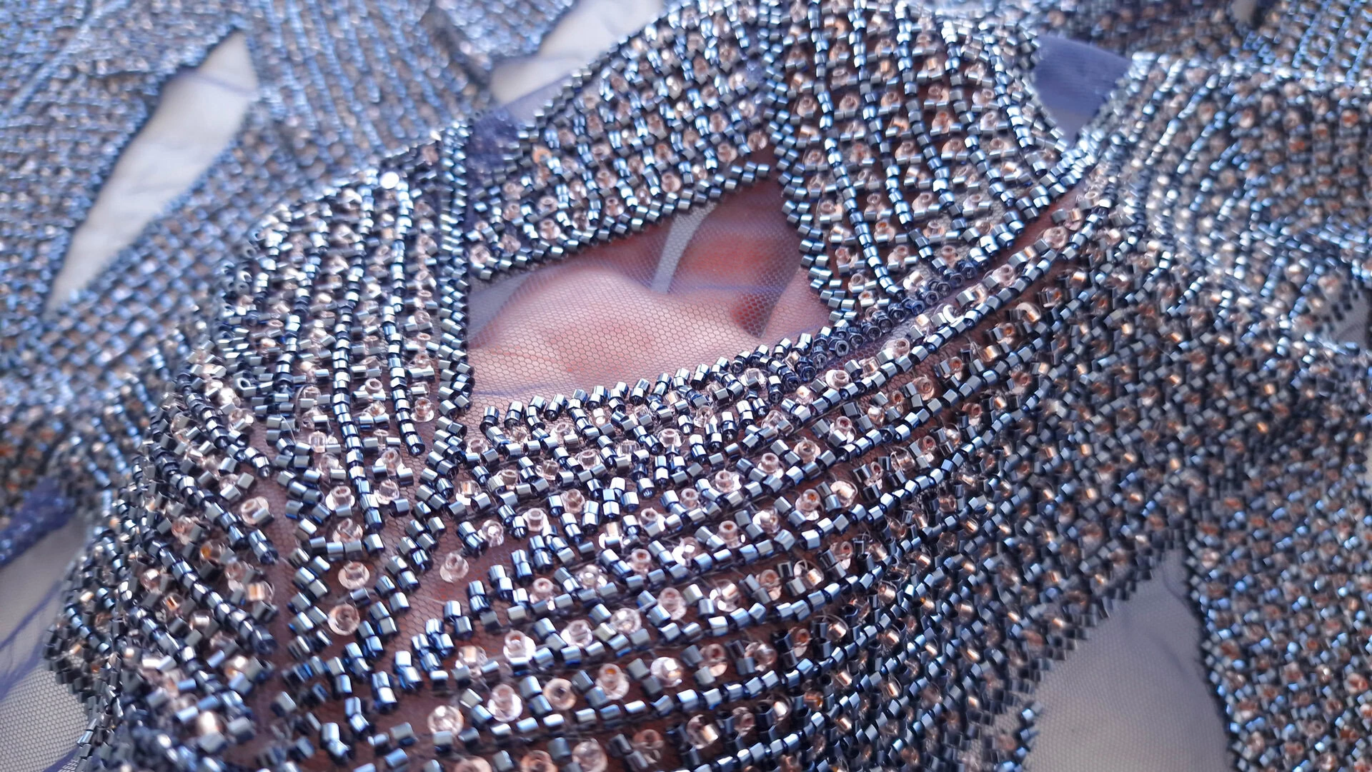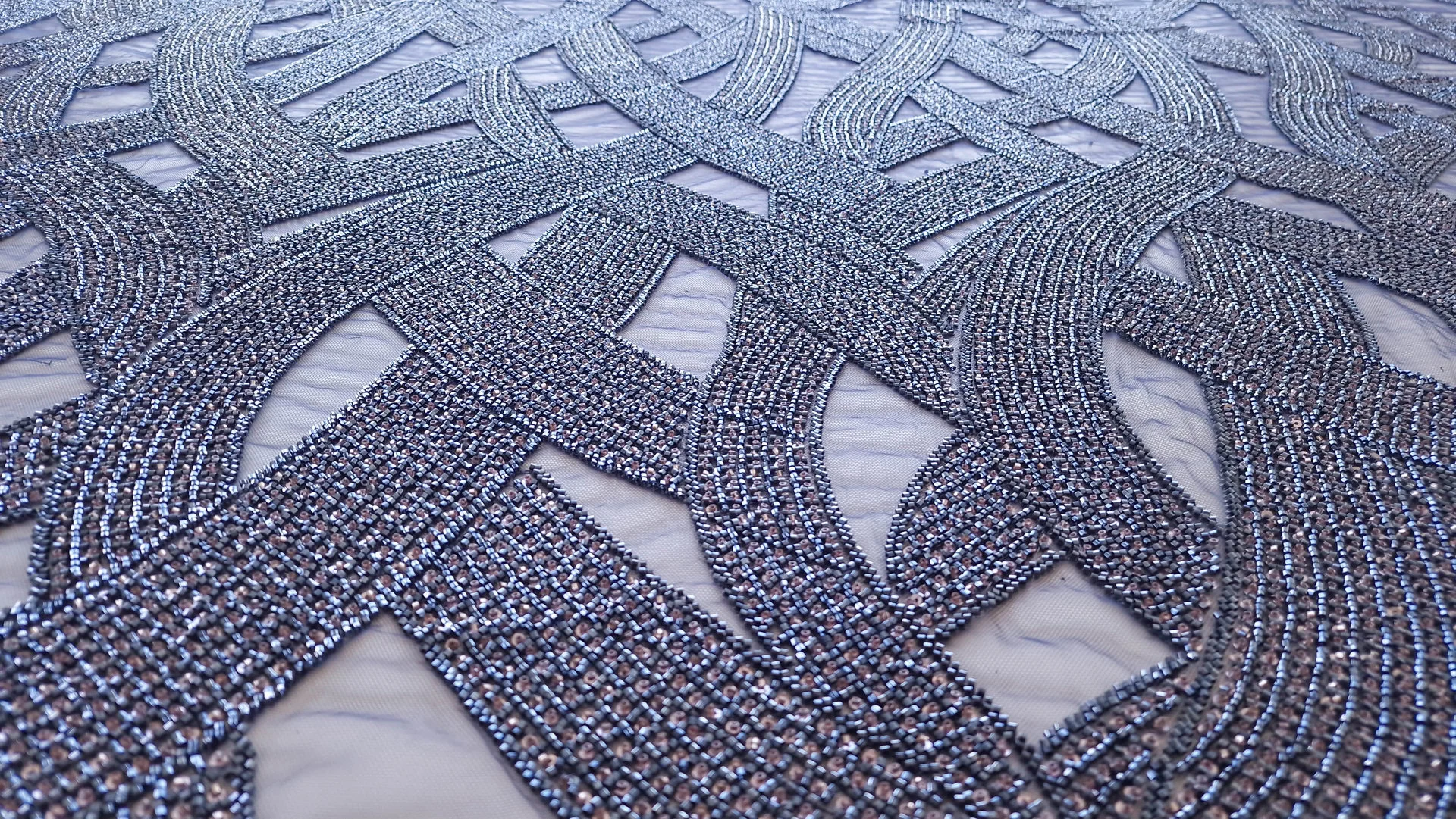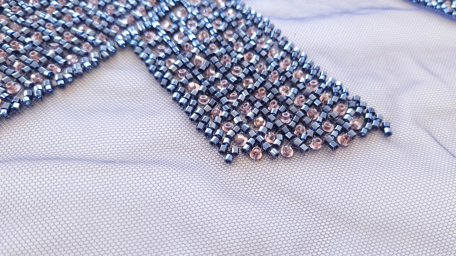 Broderie navy auriu pe tulle bleumarin , decorată cu mărgele si micropaiete navy si aurii cusute pe tulle bleumarin usor elastic. Fiecare detaliu al broderiei transformă orice ținută într-o operă de artă autentică. Microaietele strălucesc delicat, captând lumina și creând reflexii care adaugă eleganță. Mărgelele, atent selectate și plasate, aduc o notă de rafinament și complexitate. Această piesă emană feminitate și rafinament, fiind perfectă pentru ocazii speciale unde se dorește un look deosebit și memorabil.