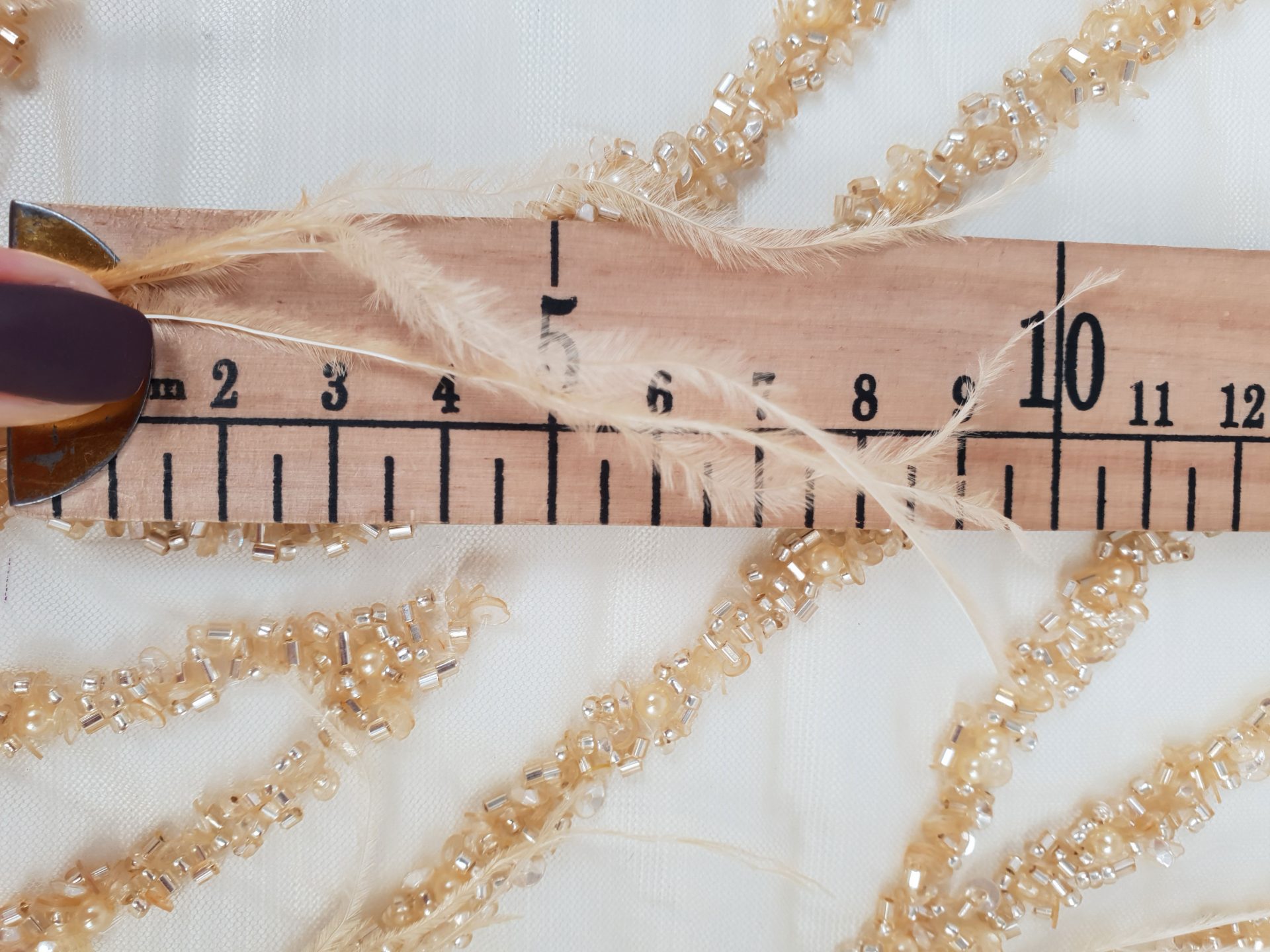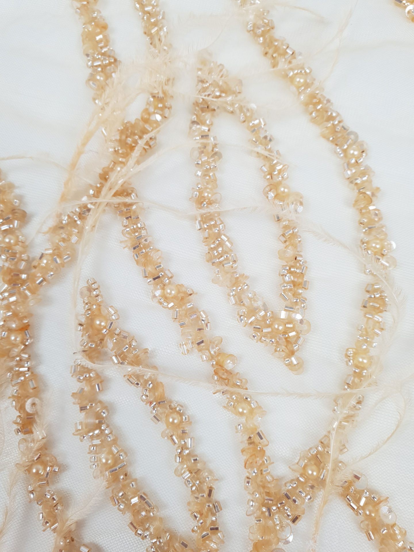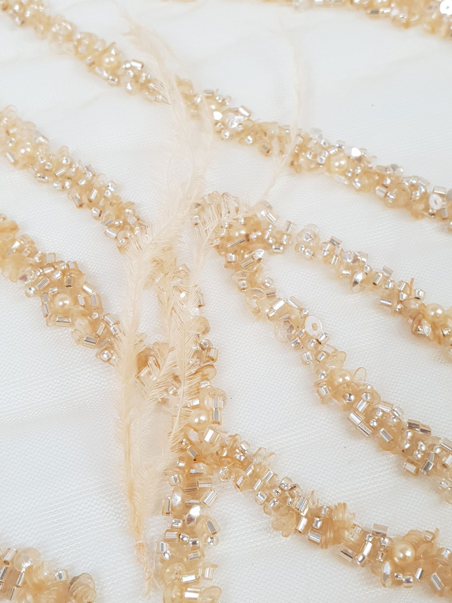 Margelele aurii sunt cusute sub forma unor siraguri neregulate, pe tul in ton cu accesorizarea si usor elastic.