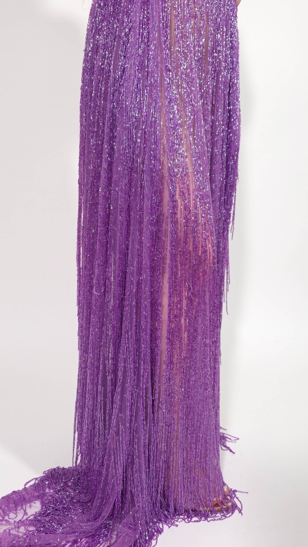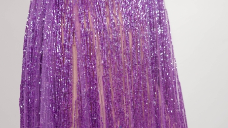 Broderie purple cu franjuri din margele, cusute pe tulle mov, usor elastic.