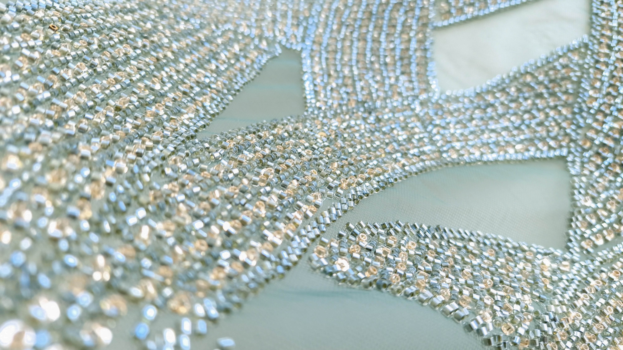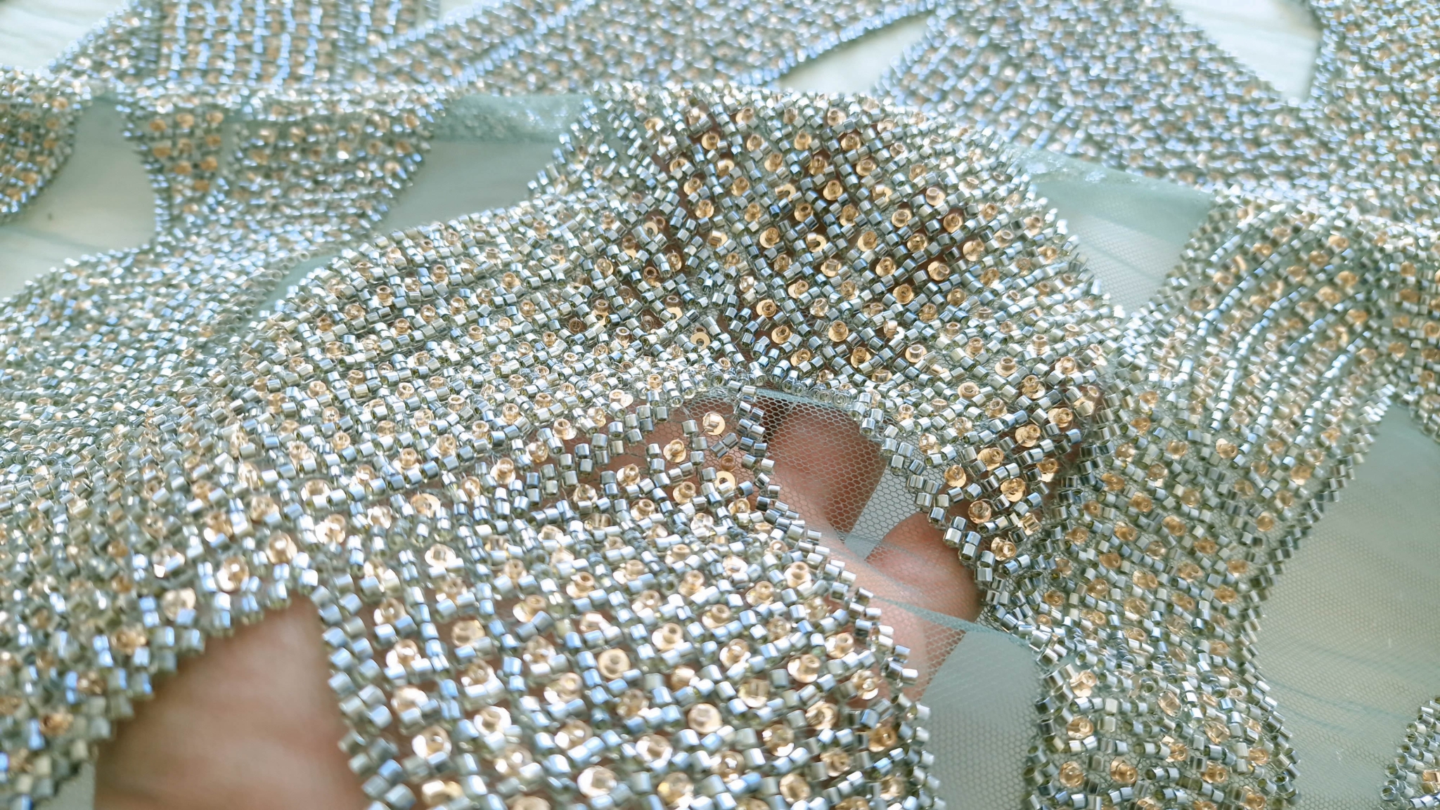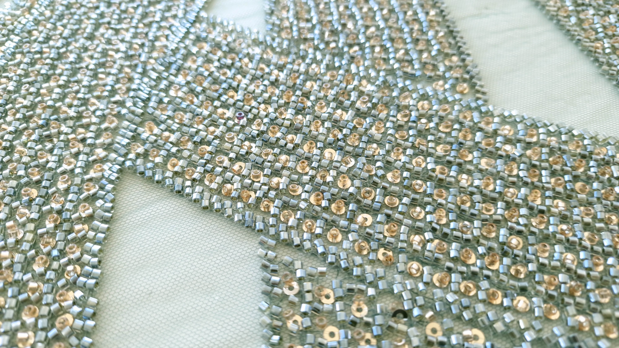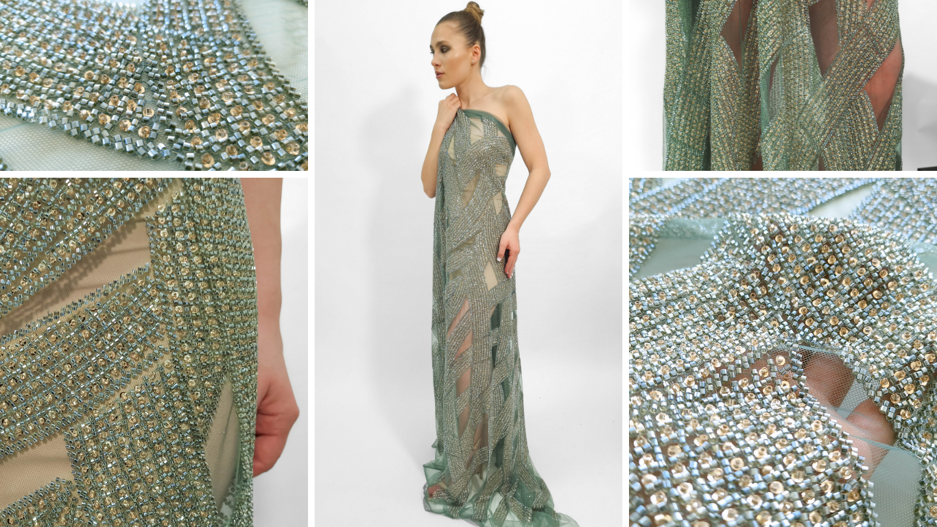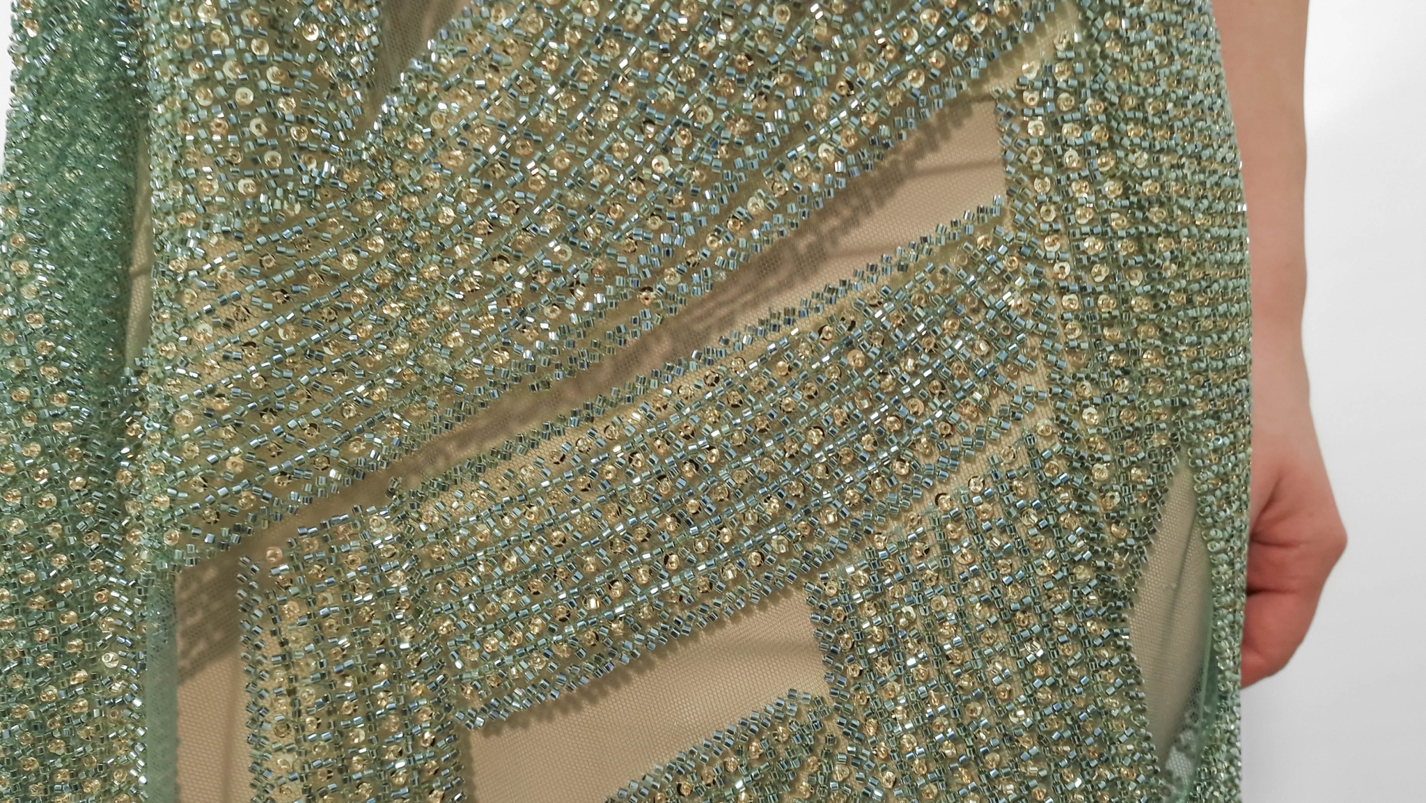 Broderie verde marin pe tulle jade , decorată cu mărgele si micropaiete în nuanțe verde si auriu cusute pe tulle mint usor elastic. Fiecare detaliu al broderiei transformă orice ținută într-o operă de artă autentică. Microaietele strălucesc delicat, captând lumina și creând reflexii care adaugă eleganță. Mărgelele, atent selectate și plasate, aduc o notă de rafinament și complexitate. Această piesă emană feminitate și rafinament, fiind perfectă pentru ocazii speciale unde se dorește un look deosebit și memorabil.
