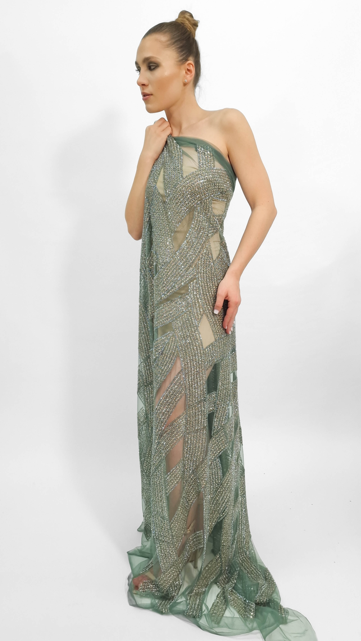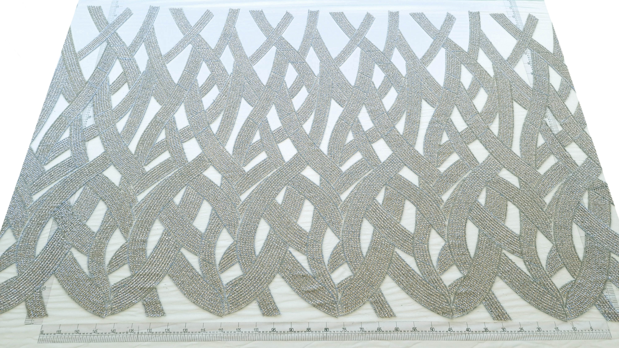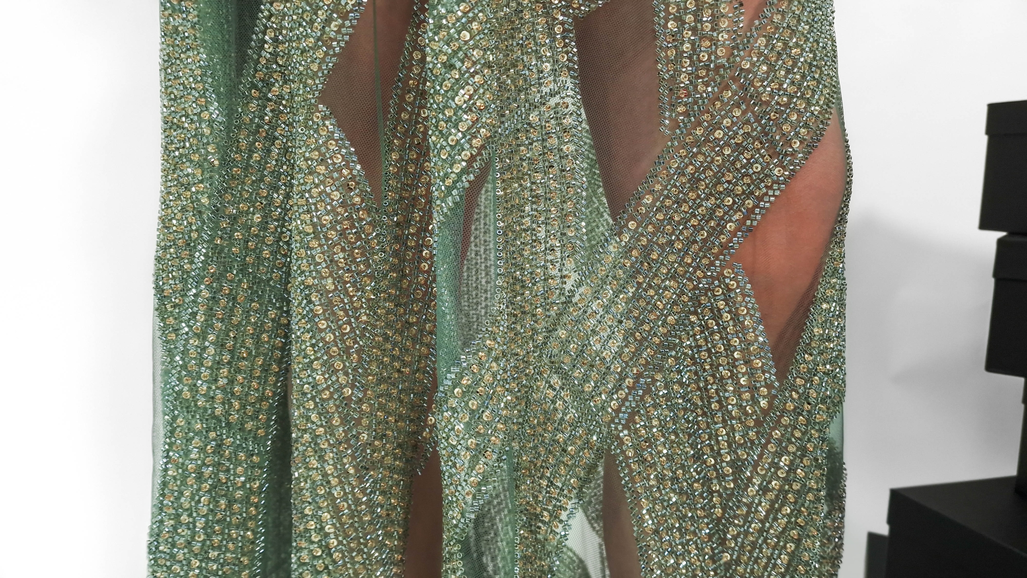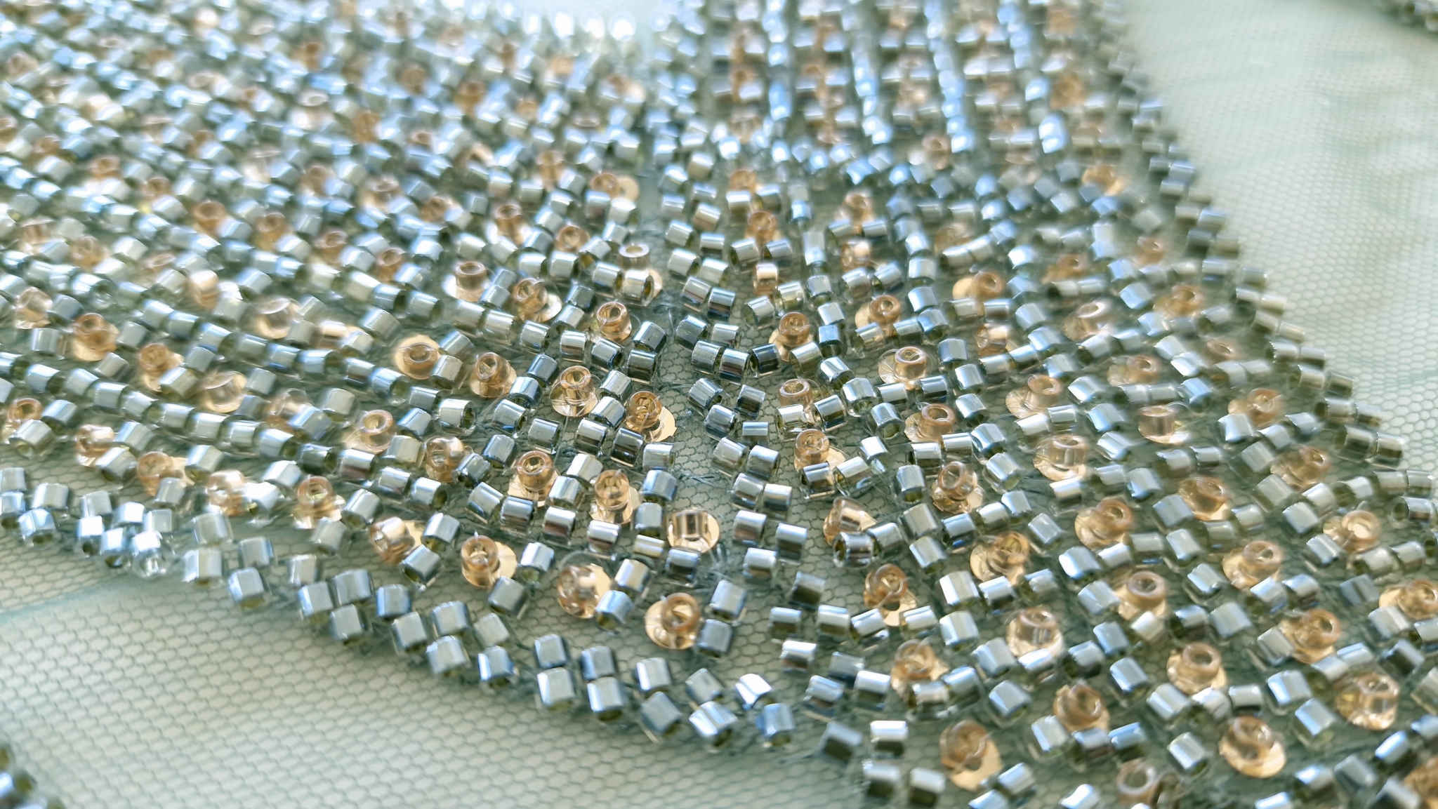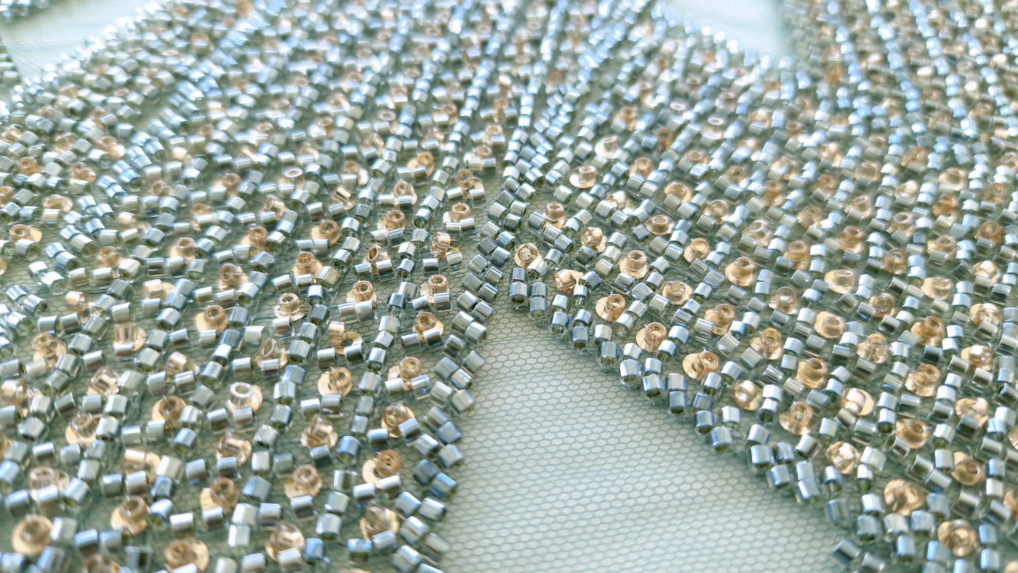 Broderie verde marin pe tulle jade , decorată cu mărgele si micropaiete în nuanțe verde si auriu cusute pe tulle mint usor elastic. Fiecare detaliu al broderiei transformă orice ținută într-o operă de artă autentică. Microaietele strălucesc delicat, captând lumina și creând reflexii care adaugă eleganță. Mărgelele, atent selectate și plasate, aduc o notă de rafinament și complexitate. Această piesă emană feminitate și rafinament, fiind perfectă pentru ocazii speciale unde se dorește un look deosebit și memorabil.