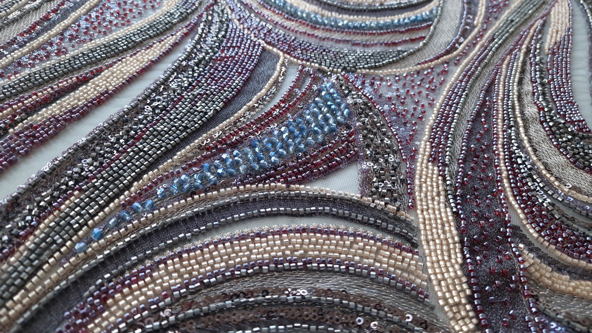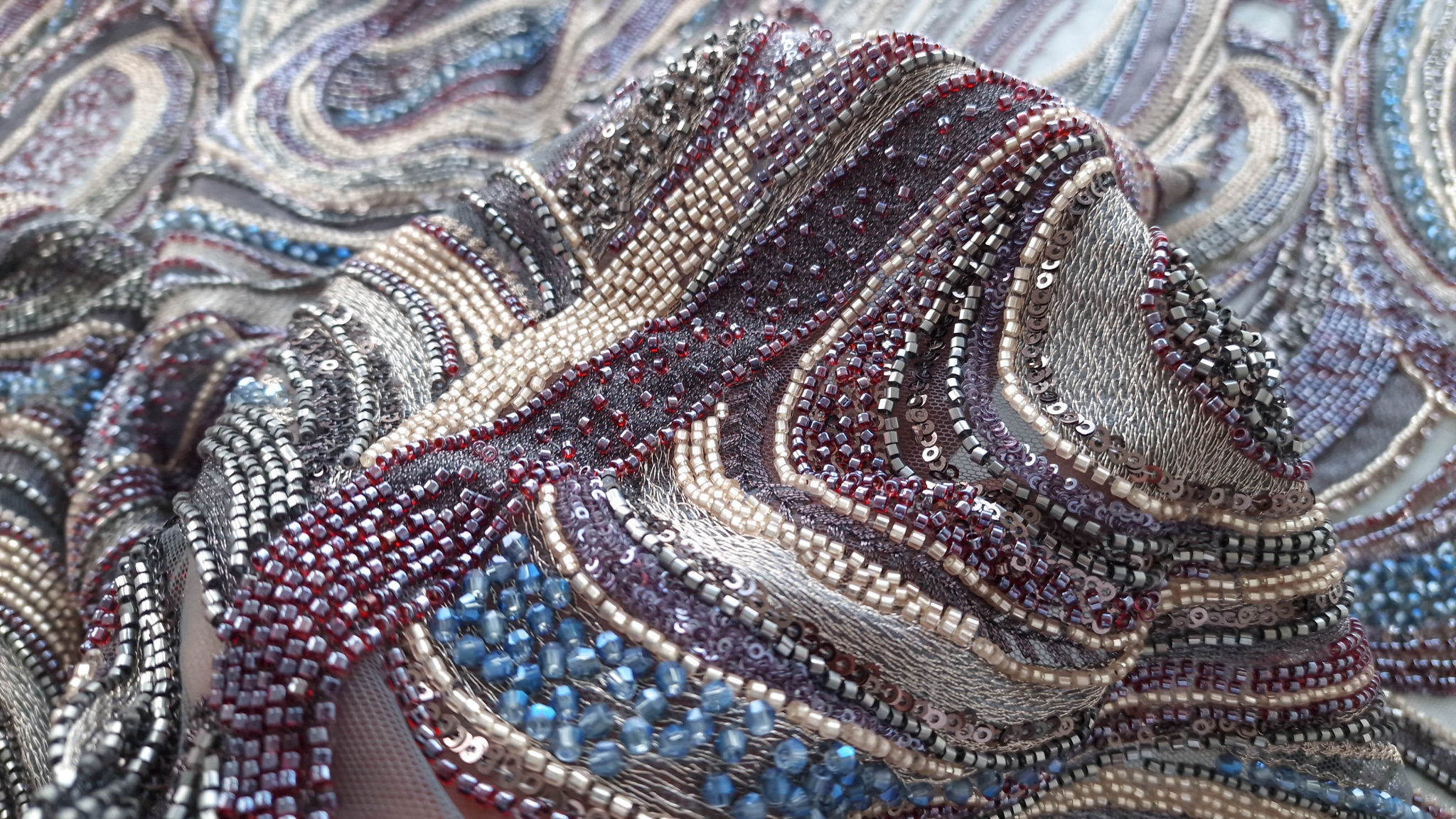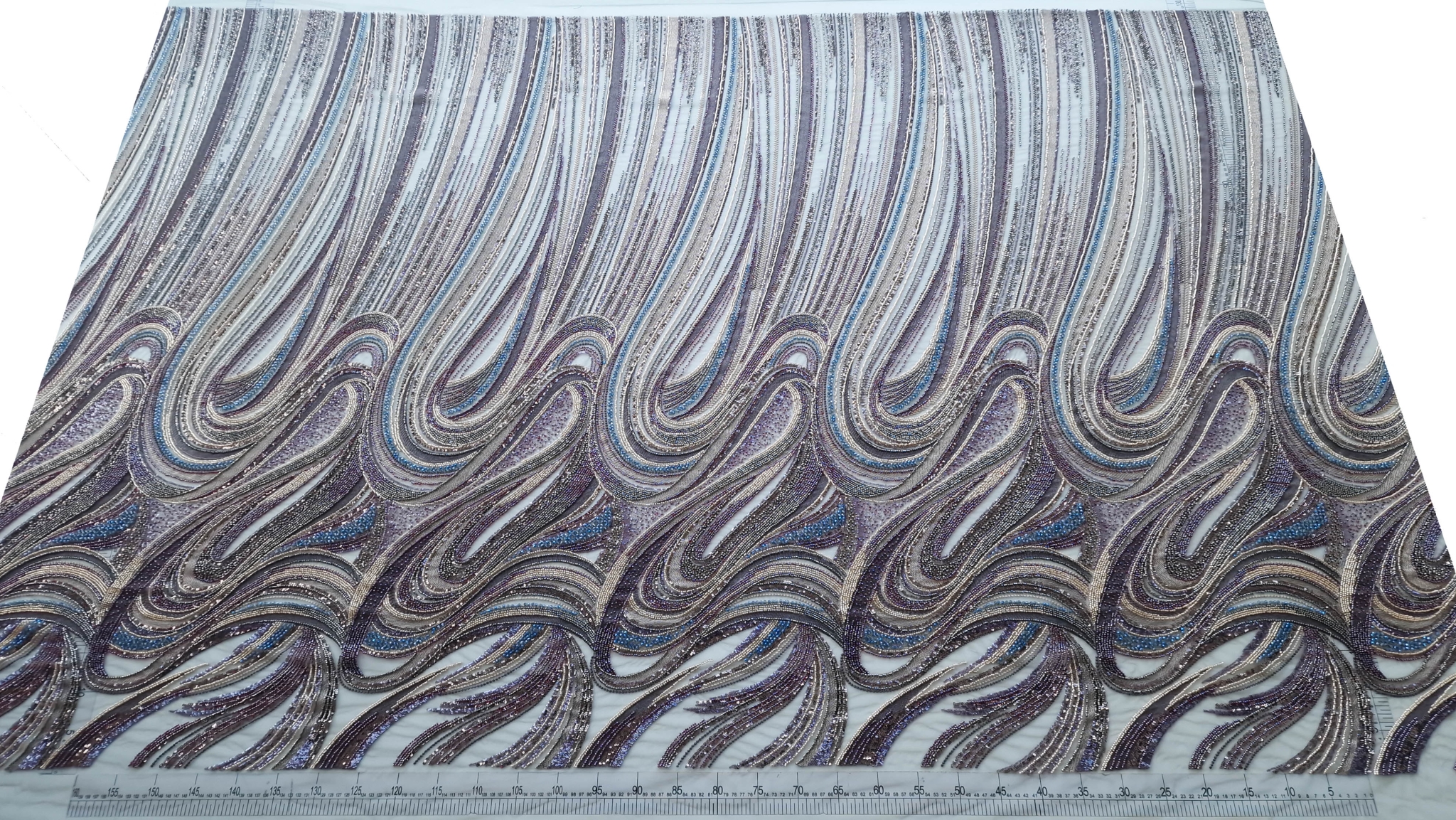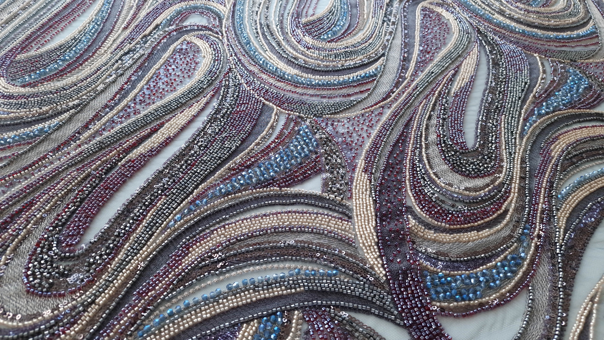 Dantela brodata pe tulle gri antracit , cu fir metalizat, mărgele si micropaiete în nuanțe pastelate cusute pe tulle usor elastic. Fiecare detaliu al broderiei transformă orice ținută într-o operă de artă autentică. Microaietele strălucesc delicat, captând lumina și creând reflexii care adaugă eleganță. Mărgelele, atent selectate și plasate, aduc o notă de rafinament și complexitate. Această piesă emană feminitate și rafinament, fiind perfectă pentru ocazii speciale unde se dorește un look deosebit și memorabil.