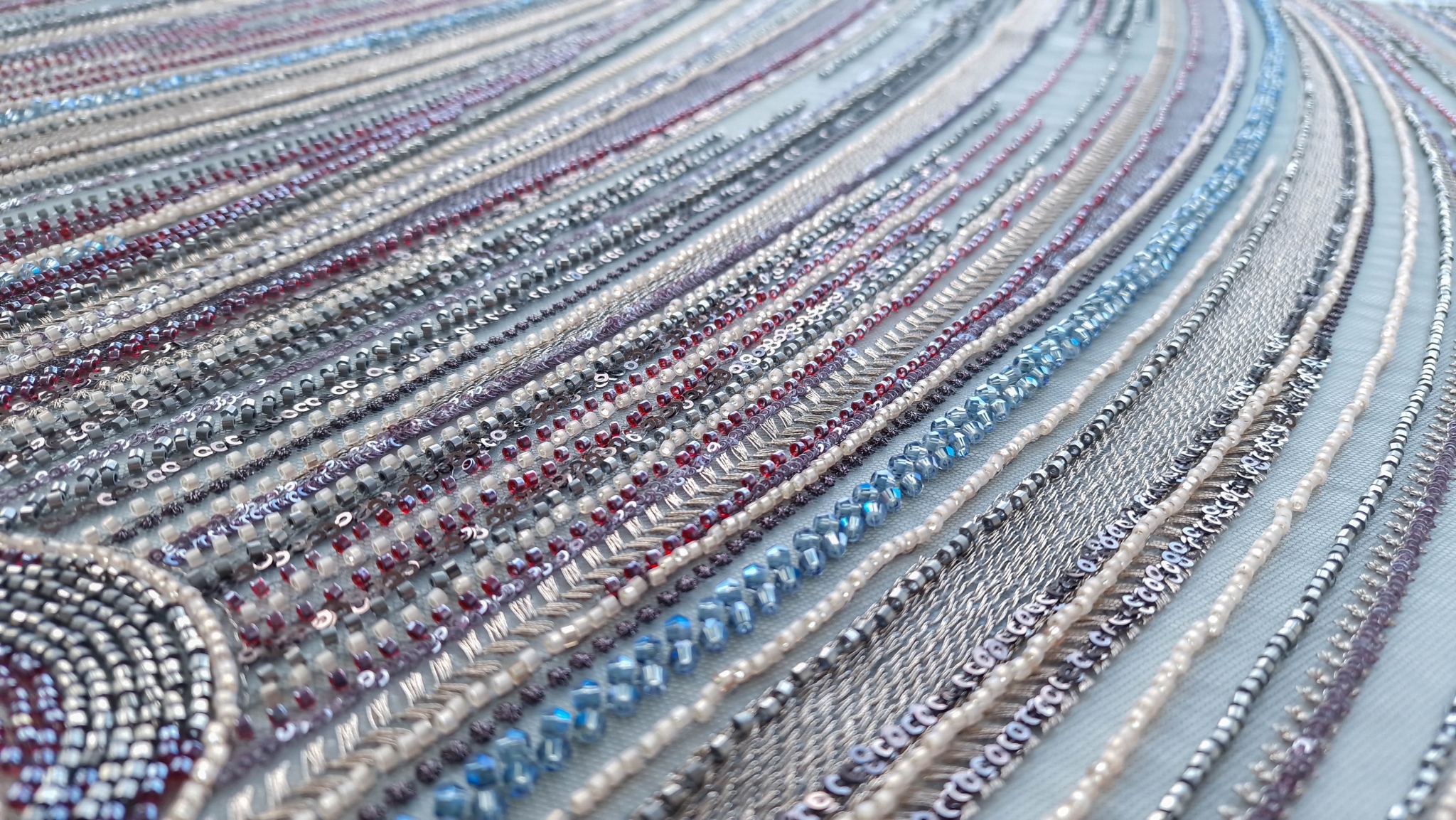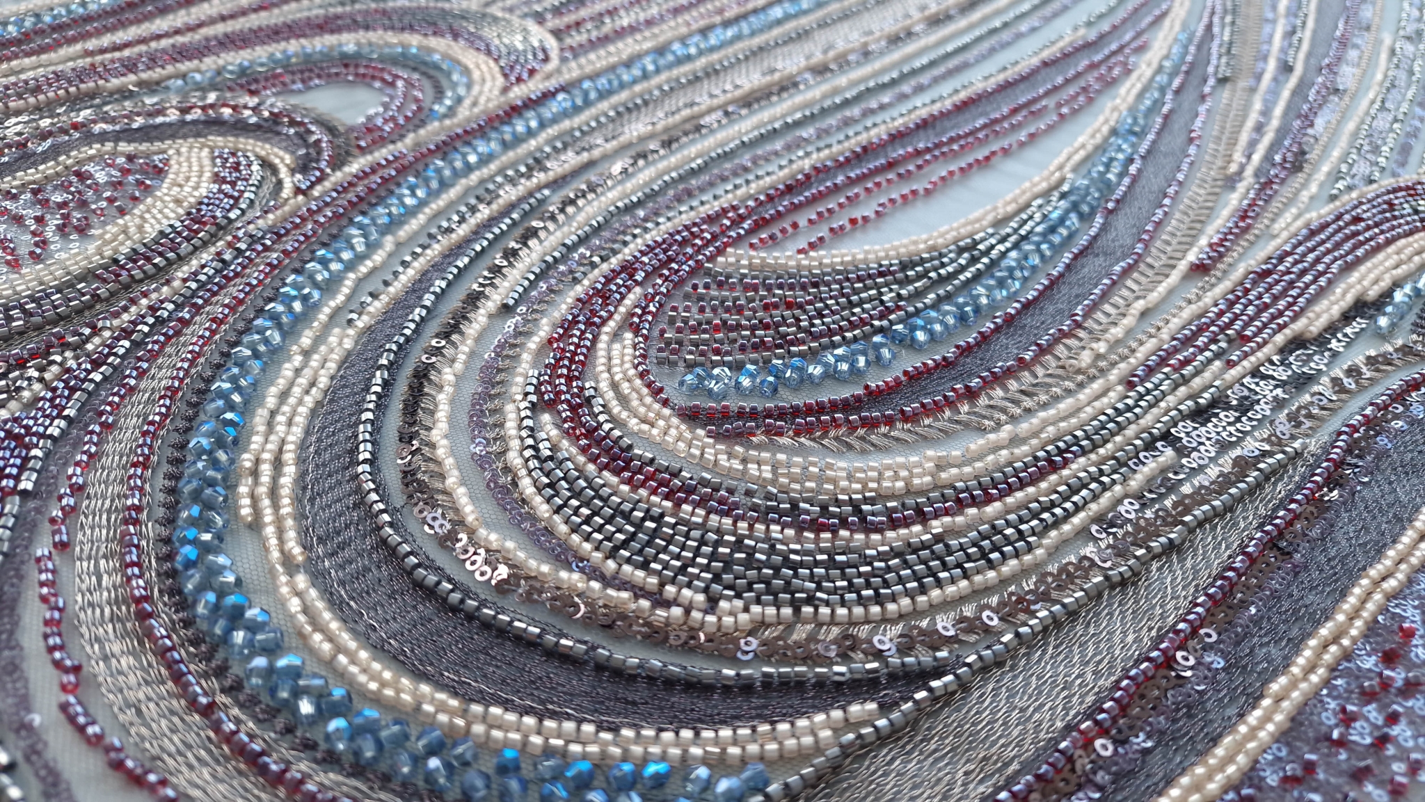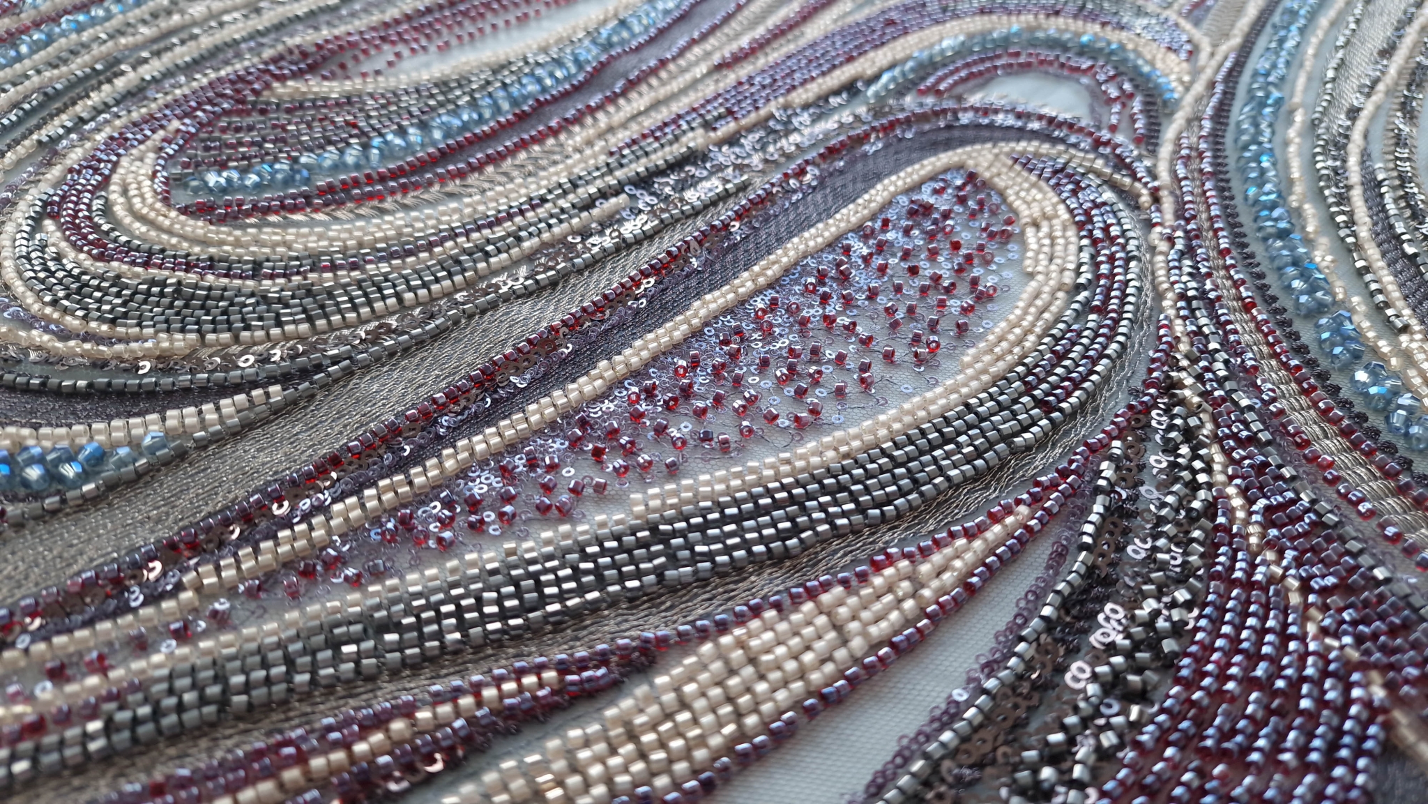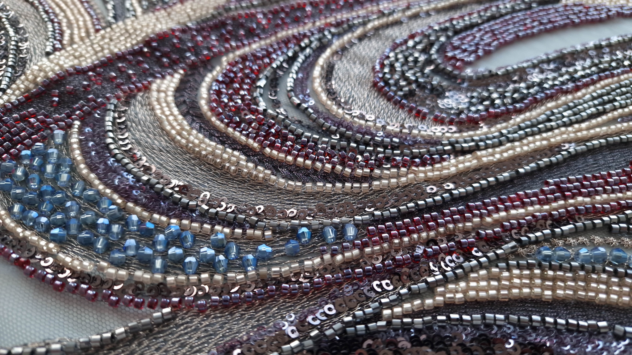 Dantela brodata pe tulle gri antracit , cu fir metalizat, mărgele si micropaiete în nuanțe pastelate cusute pe tulle usor elastic. Fiecare detaliu al broderiei transformă orice ținută într-o operă de artă autentică. Microaietele strălucesc delicat, captând lumina și creând reflexii care adaugă eleganță. Mărgelele, atent selectate și plasate, aduc o notă de rafinament și complexitate. Această piesă emană feminitate și rafinament, fiind perfectă pentru ocazii speciale unde se dorește un look deosebit și memorabil.