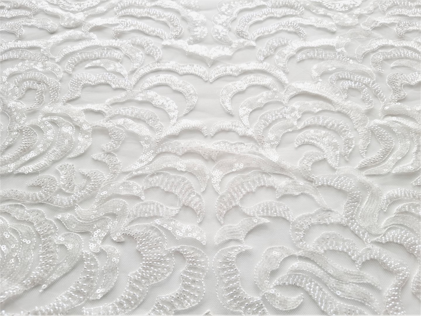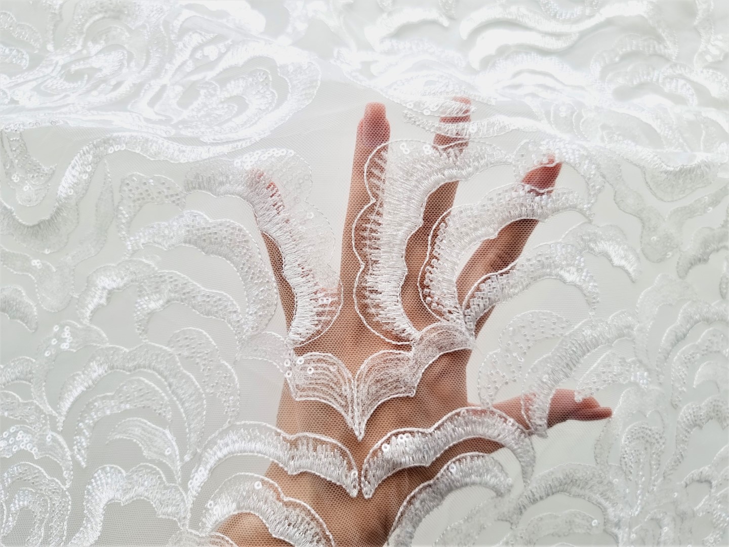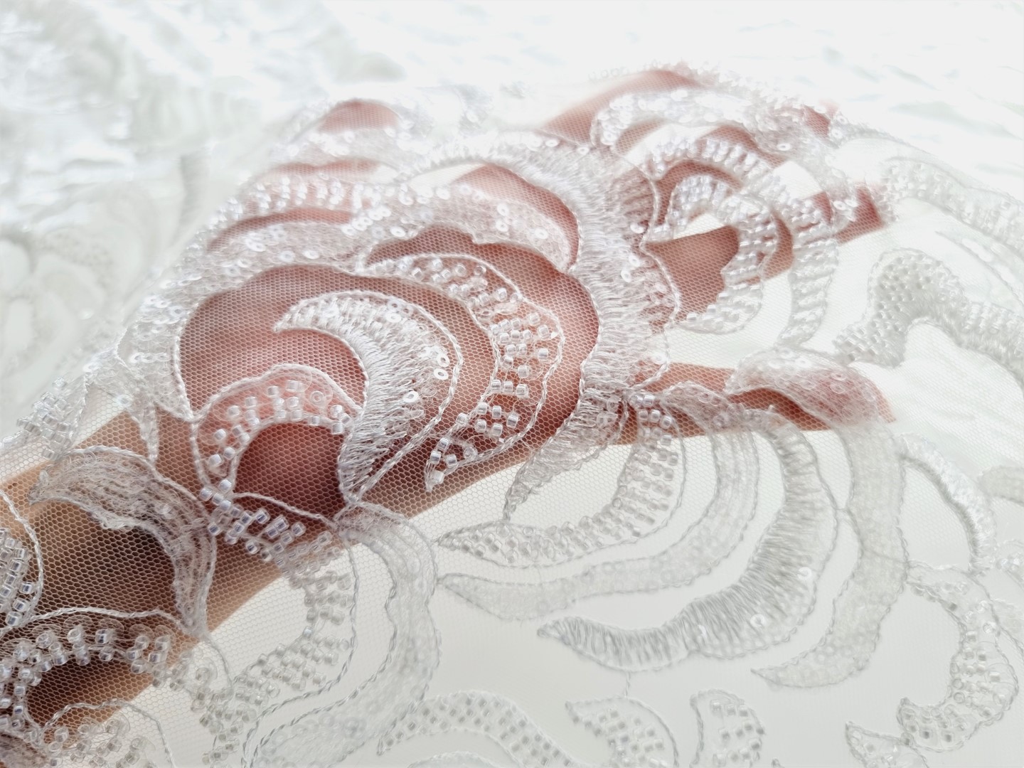 Broderie alba cu micropaiete transparente si margele tubulare semitransparente , cusute pe baza din tulle usor elastic, de culoare alba.