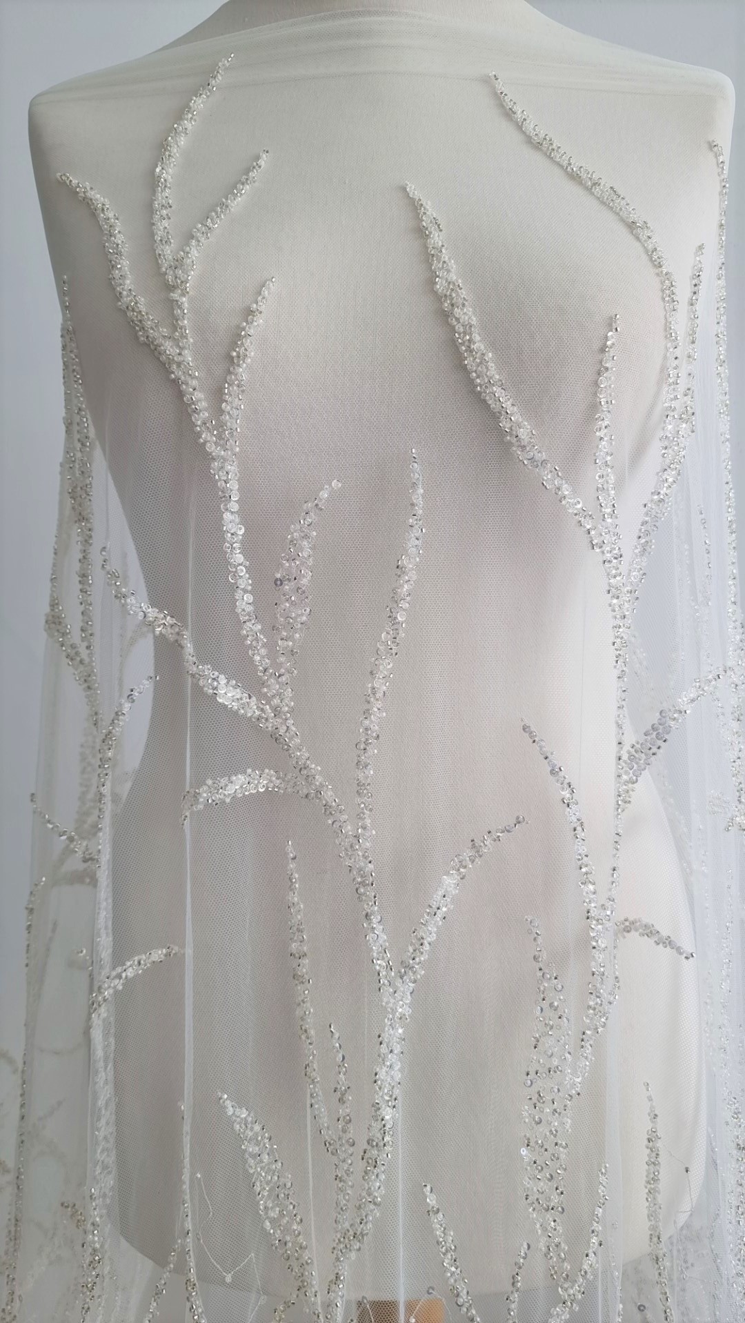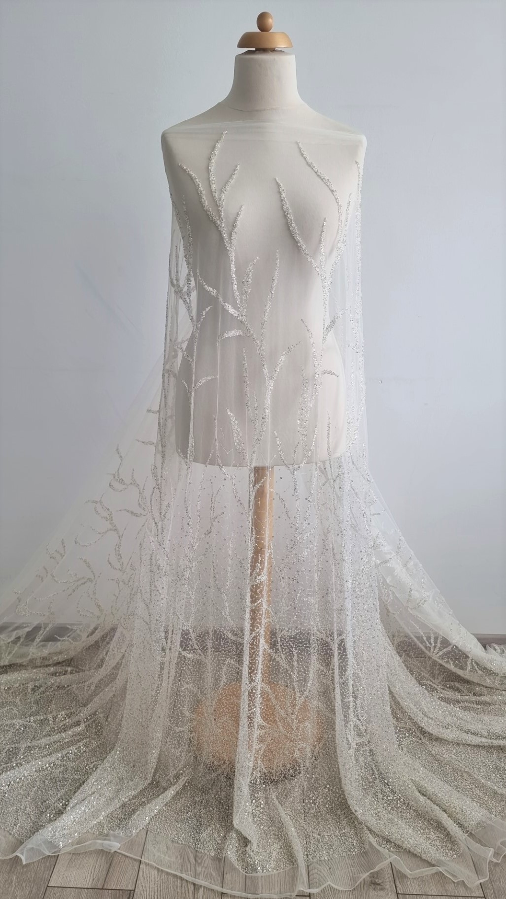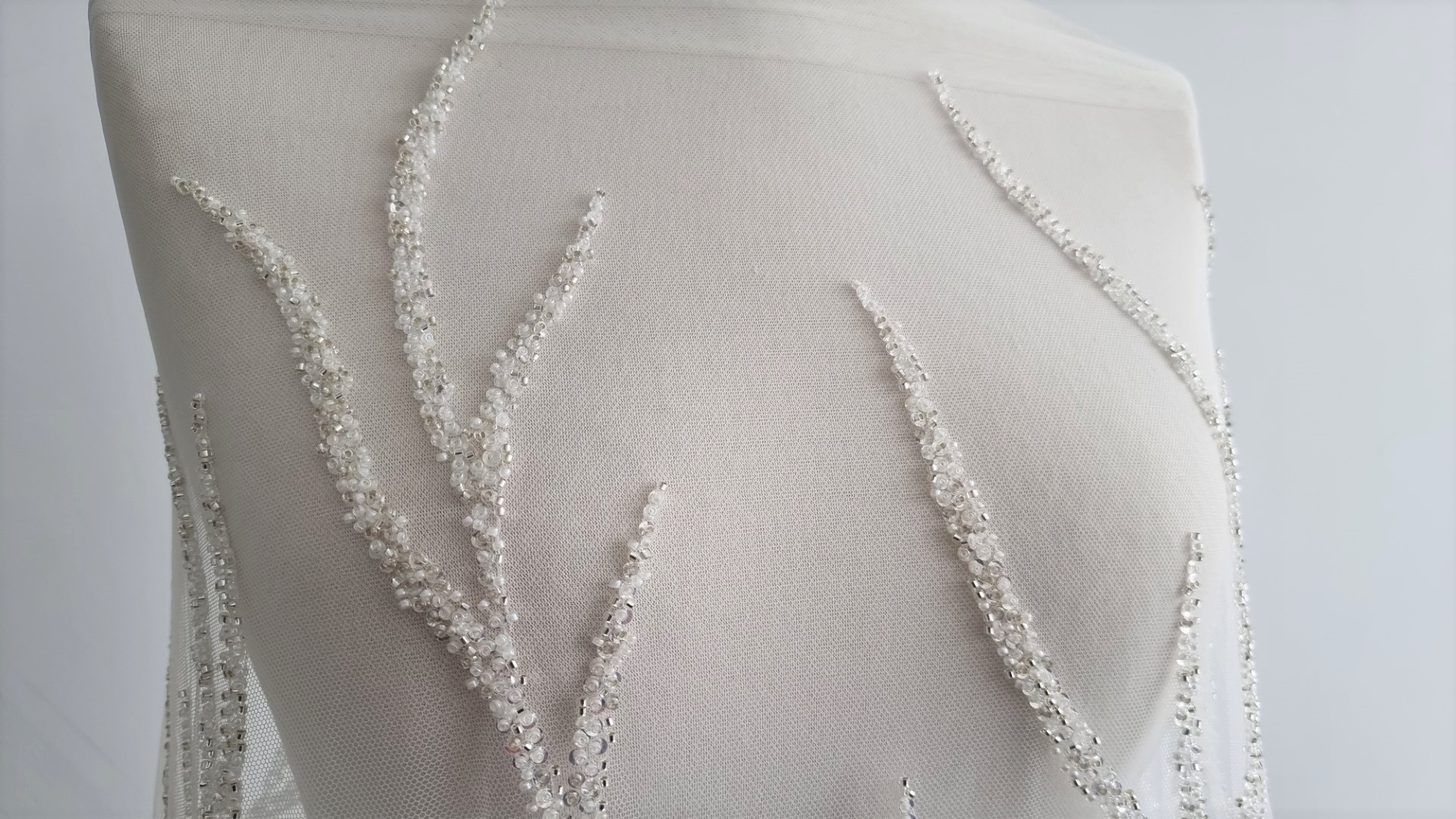 Broderie ivoire accesorizata cu micropaiete Penelope, transparente si ivoire si margele tubulare realizata 100% manual, cusute pe tulle in acelasi ton cu broderia, usor elastic.