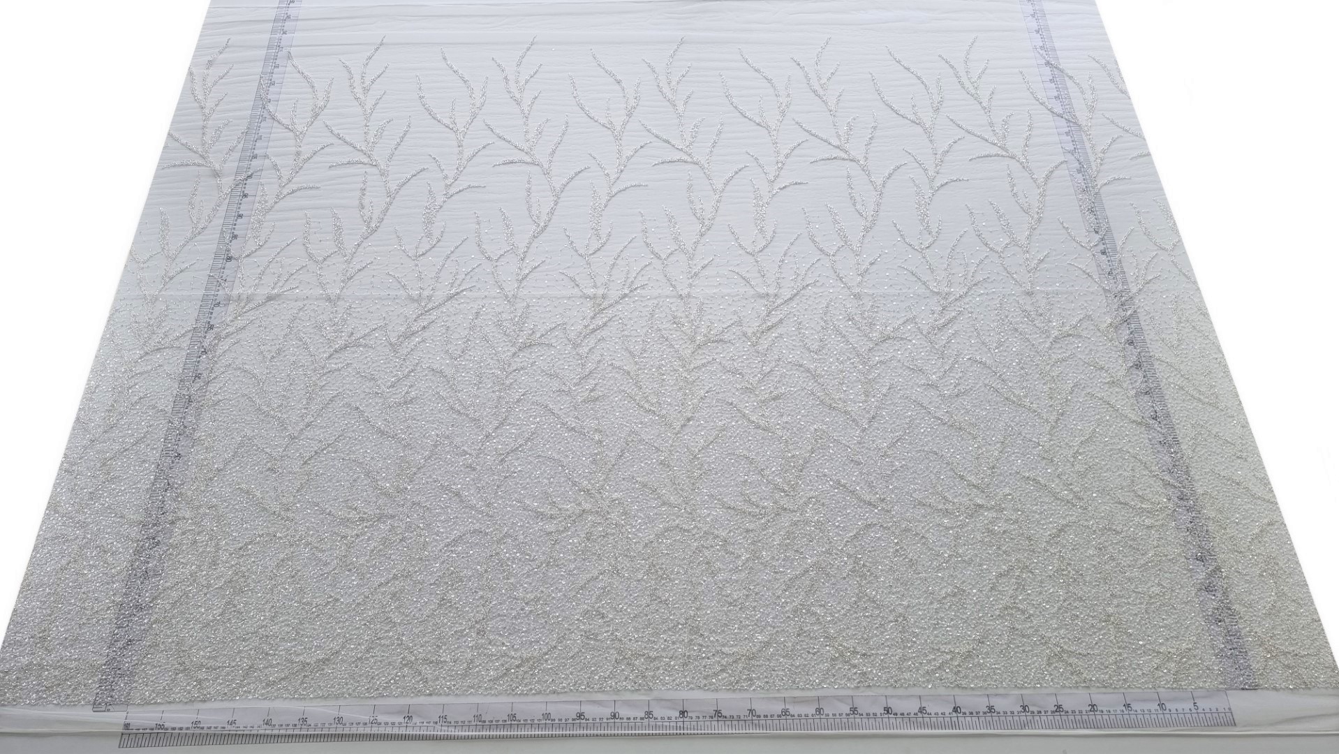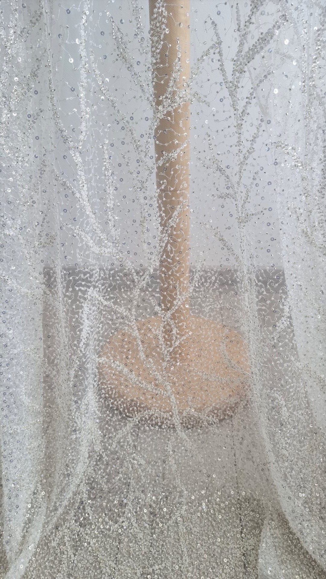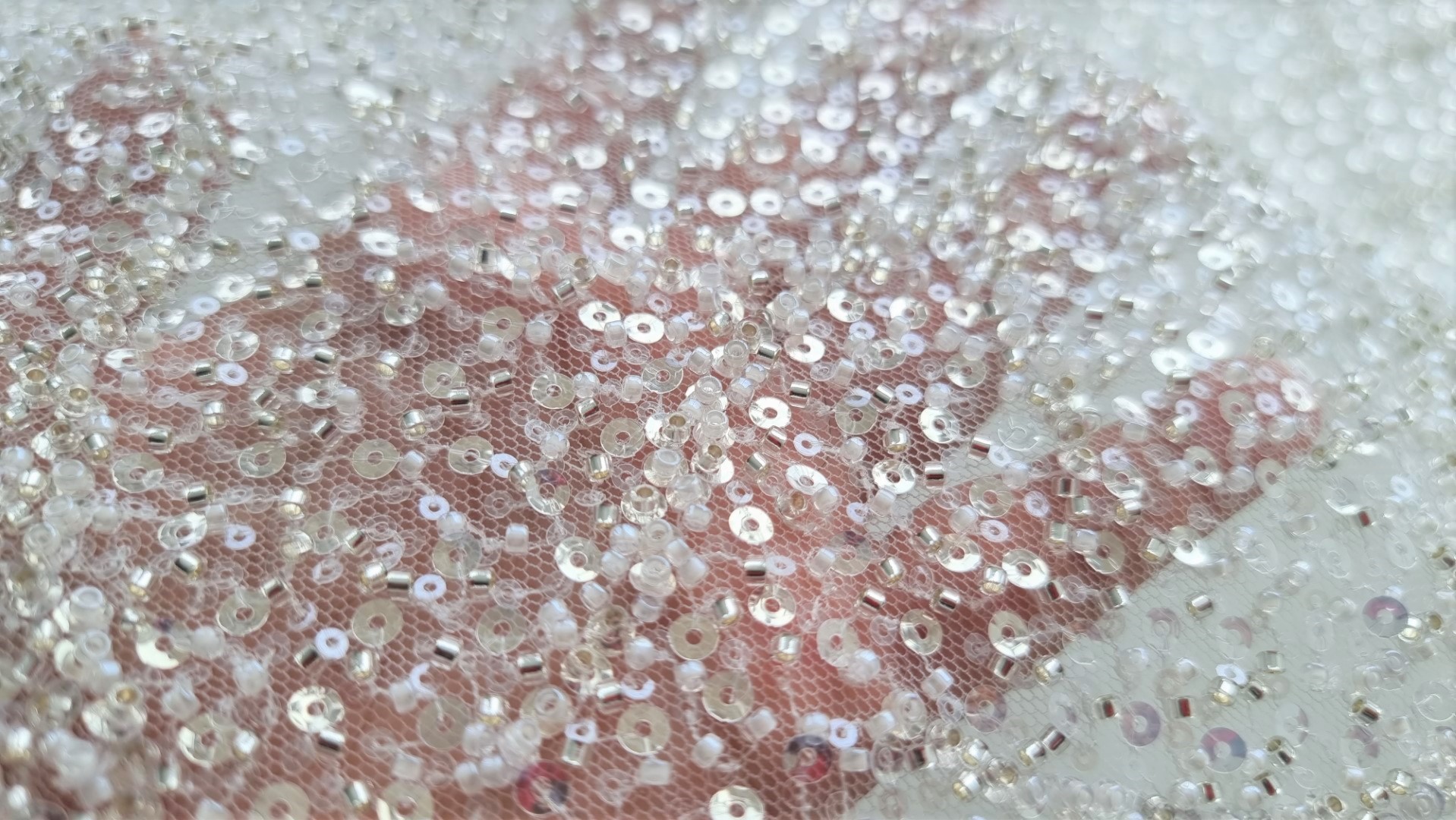 Broderie ivoire accesorizata cu micropaiete Penelope, transparente si ivoire si margele tubulare realizata 100% manual, cusute pe tulle in acelasi ton cu broderia, usor elastic.