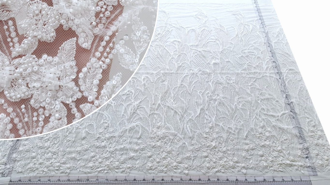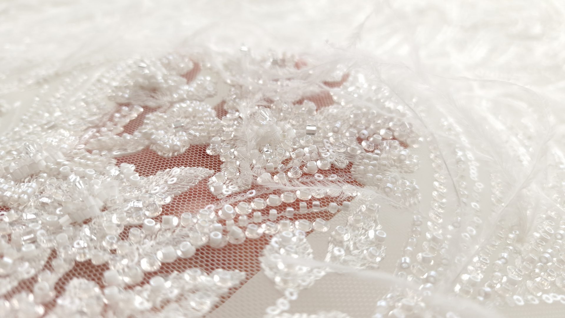 Broderie ivoire accesorizata manual Margot cu micropaiete, margelute tubulare transparente si ivoire si aplicatii de fulgi naturali, cusuti pe tulle ivoire, usor elastic.