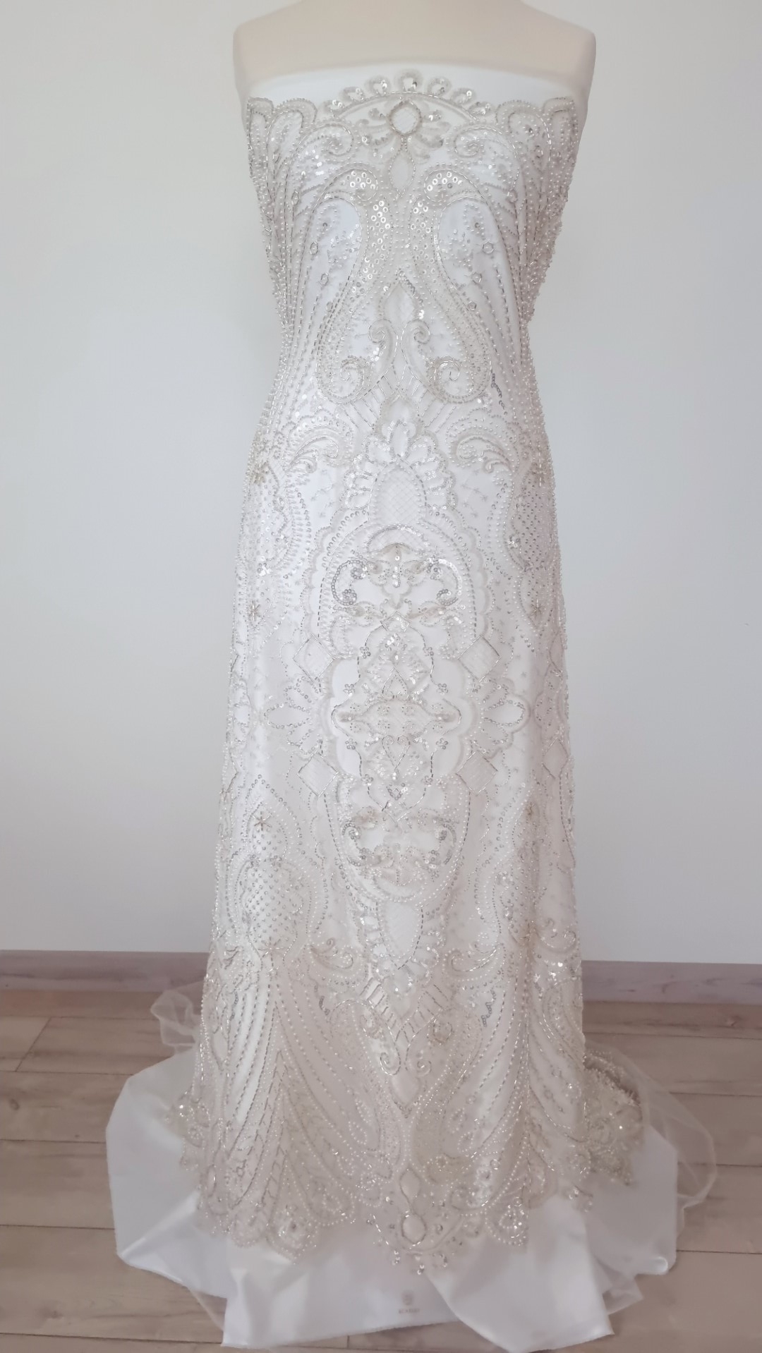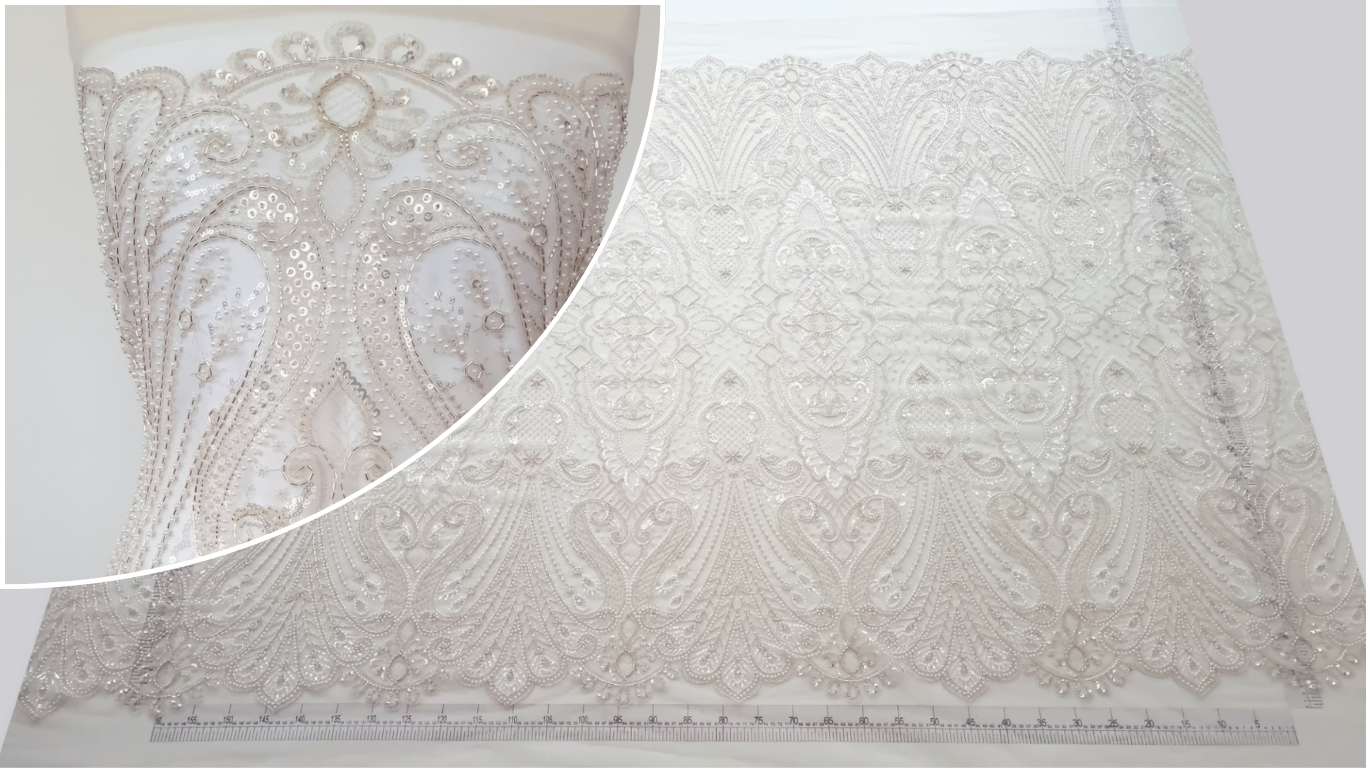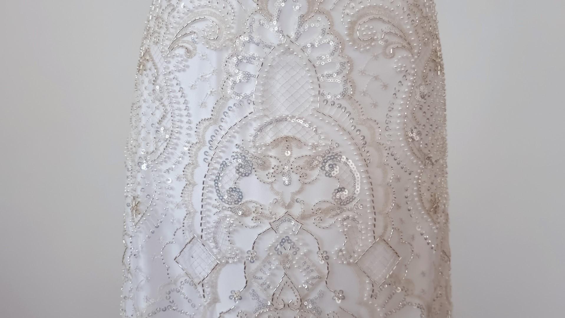 Broderie cu micropaiete transparente si argintii, margele tubulare si rotunde argintii, perle ivoire si insertii de fir metalizat, cusute pe tulle ivoire, usor elastic.