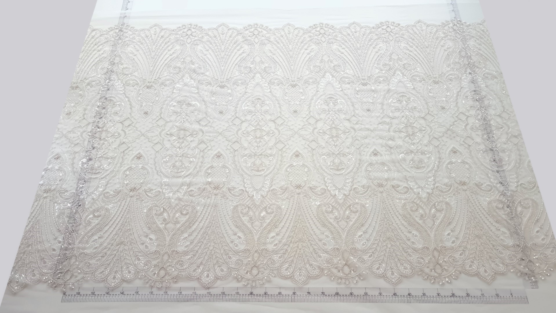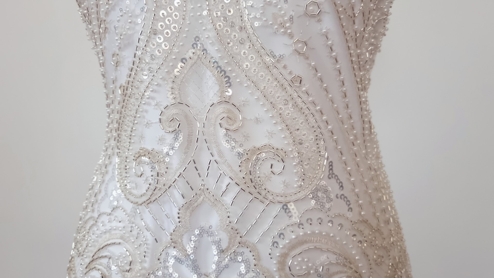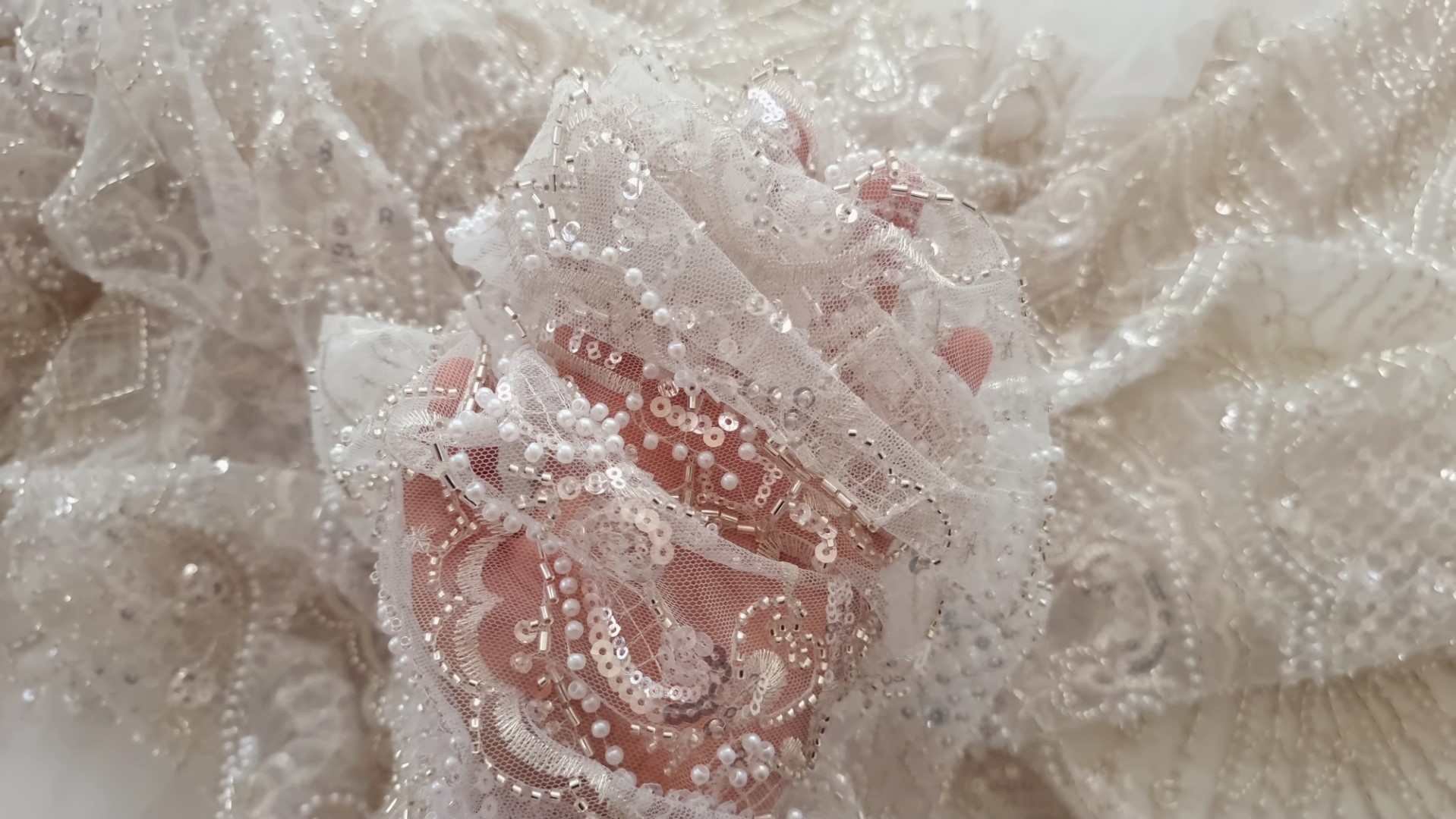 Broderie cu micropaiete transparente si argintii, margele tubulare si rotunde argintii, perle ivoire si insertii de fir metalizat, cusute pe tulle ivoire, usor elastic.