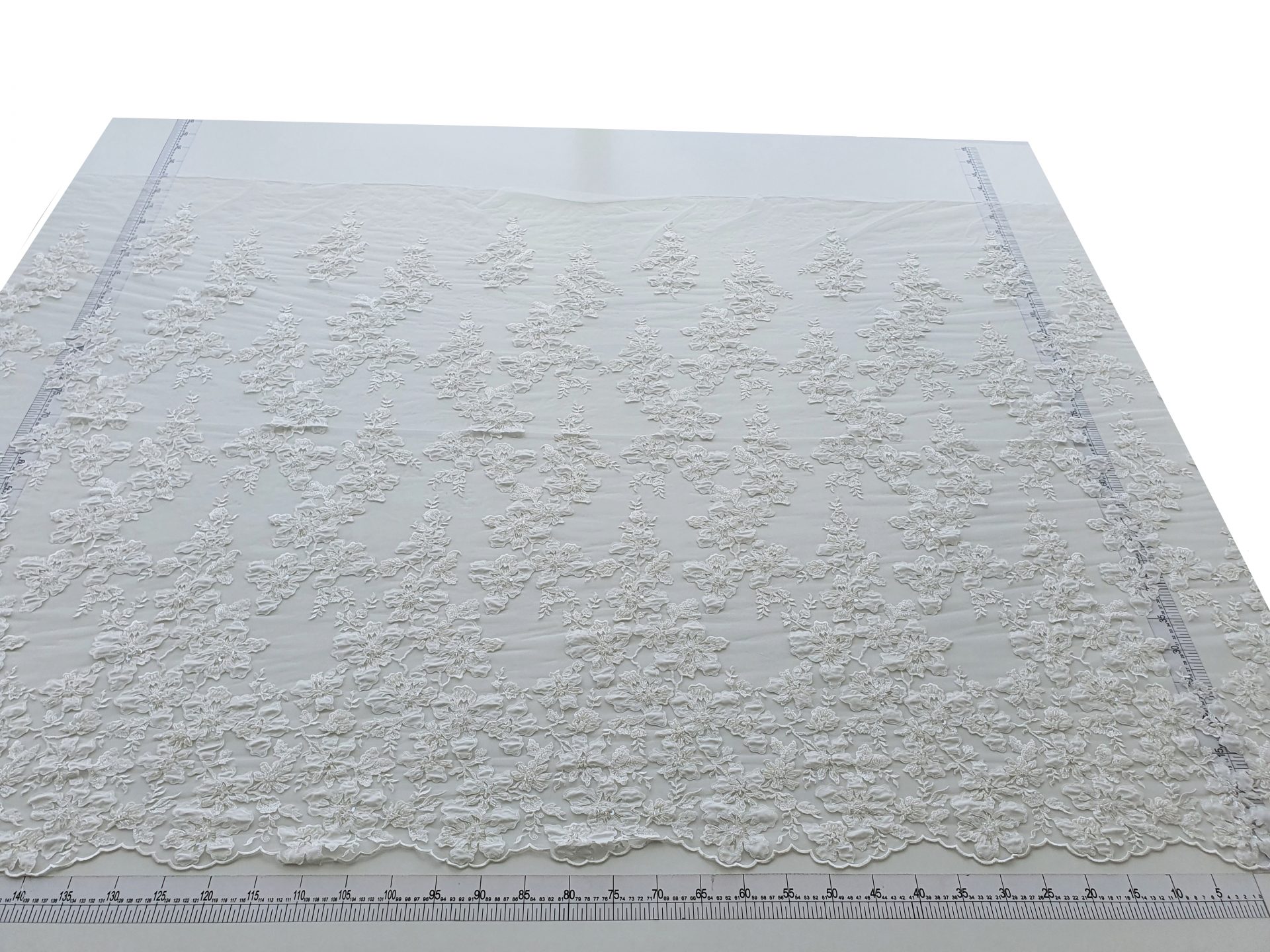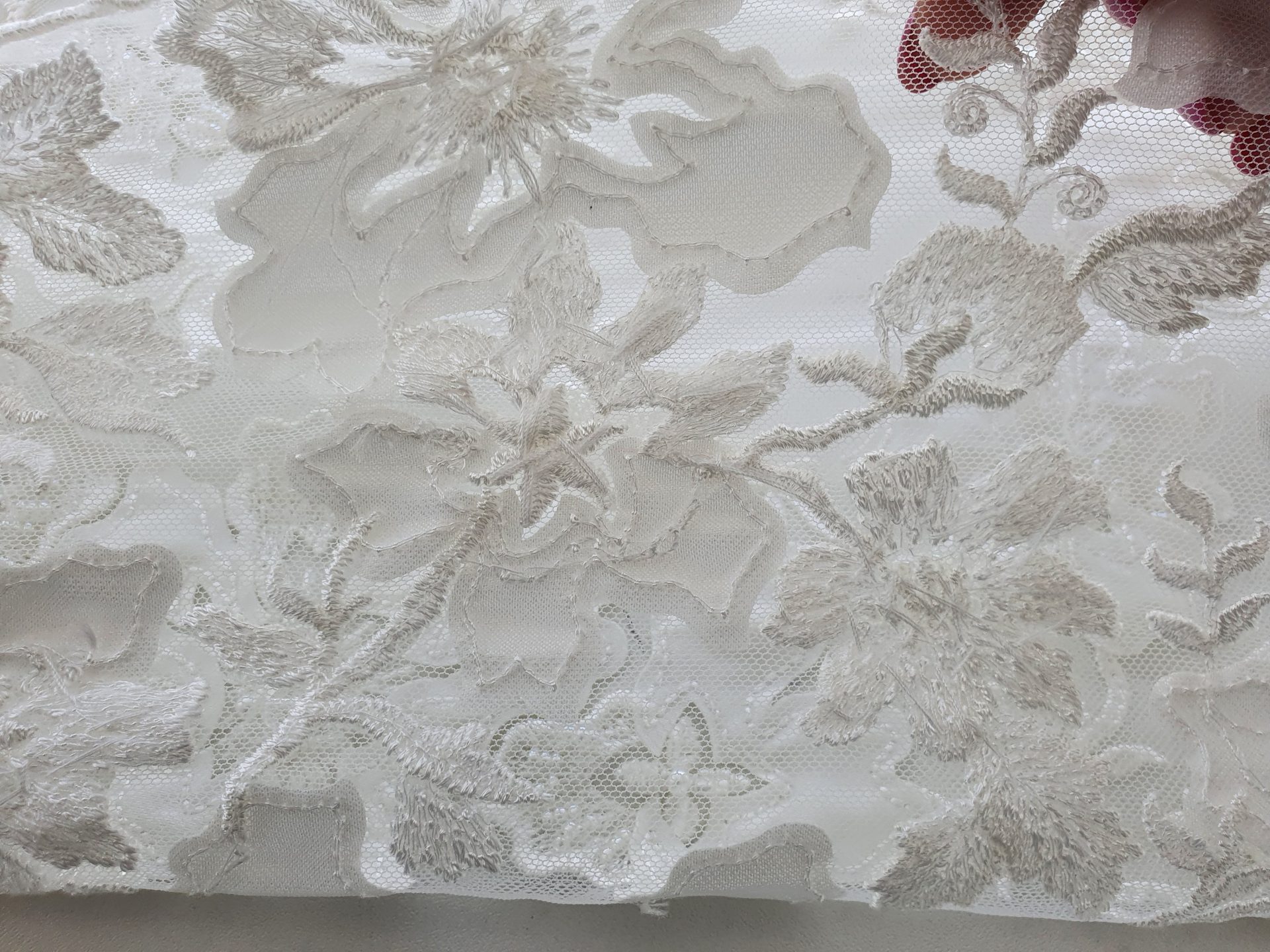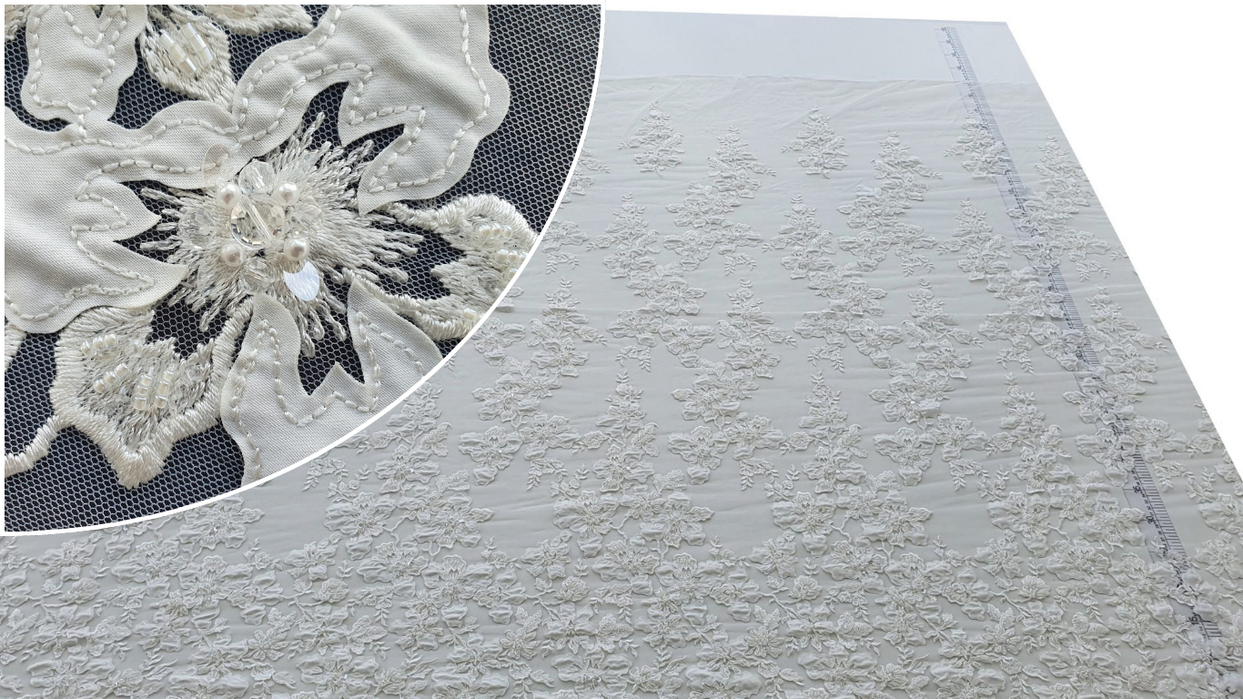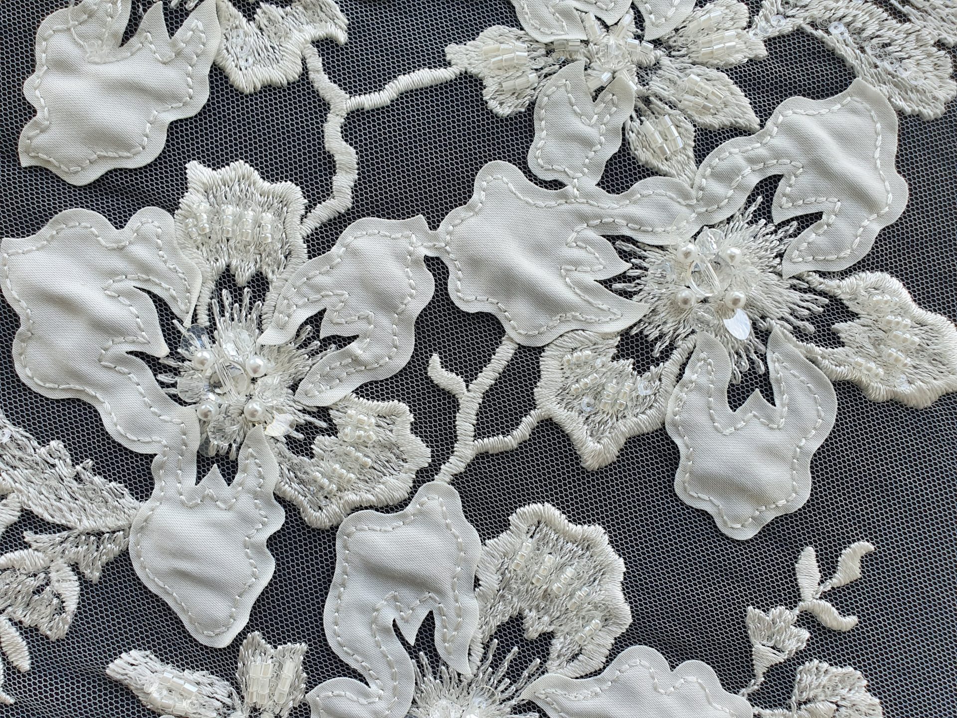 Broderie ivory cu flori , accesorizate cu margele si paiete, cusute pe baza din tulle usor elastic, de culoare ivory.