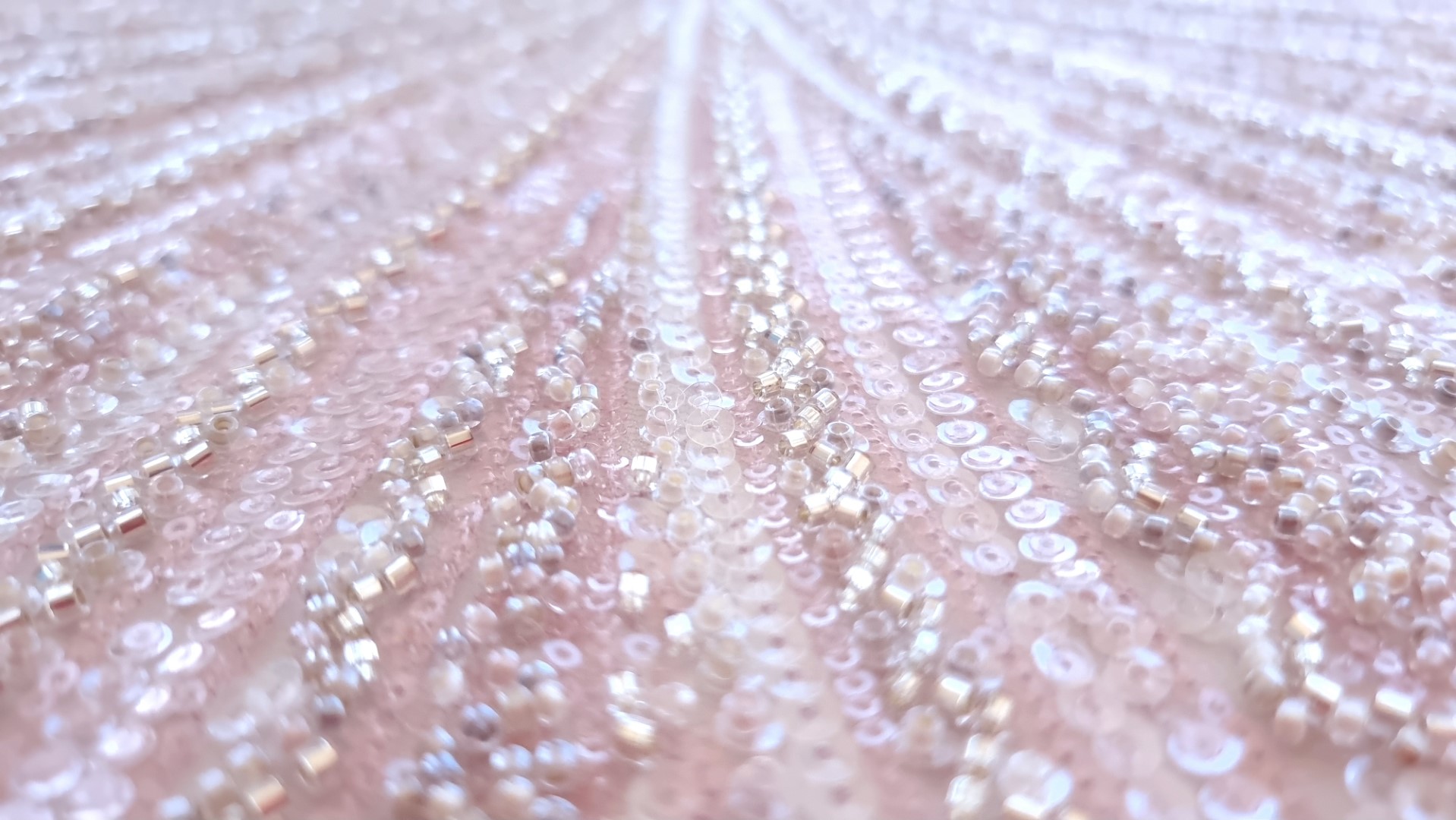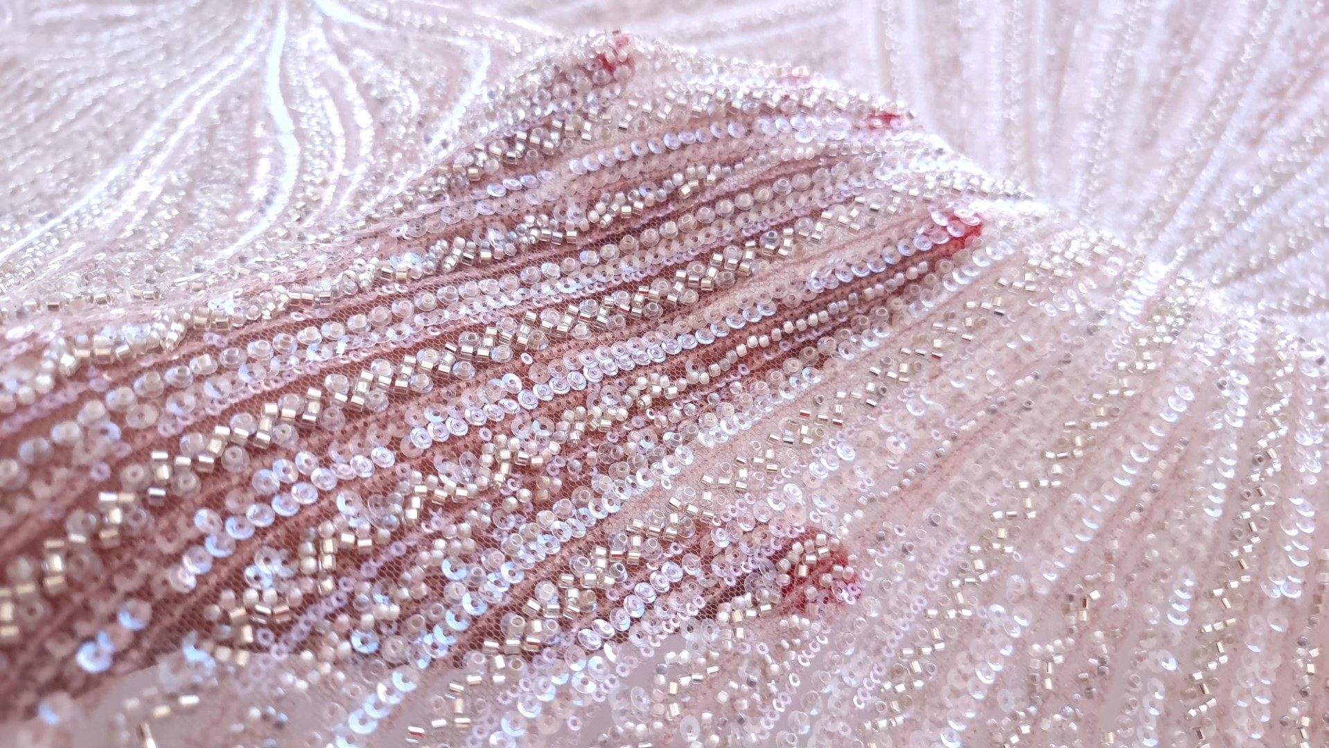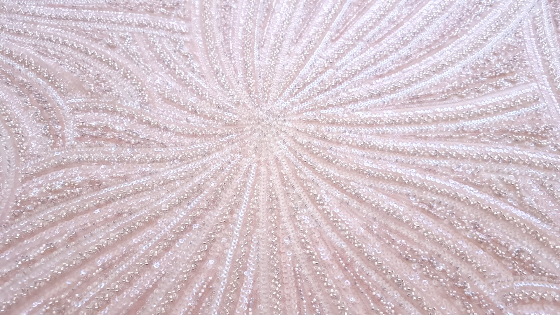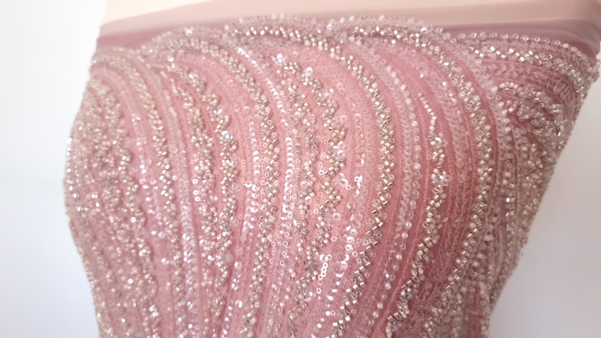 Broderie accesorizata Sweet Pink cu micropaiete de diferite dimensiuni si margele tubulare cusute pe tulle roz deschis, usor elastic.