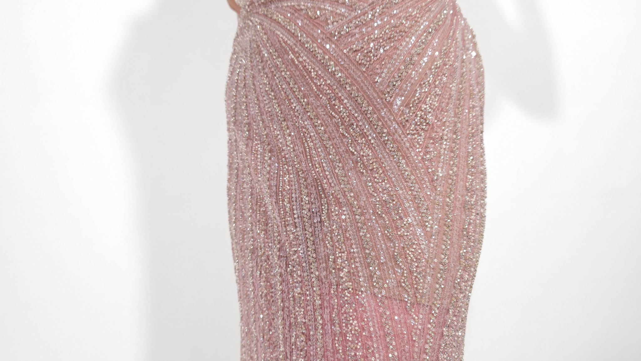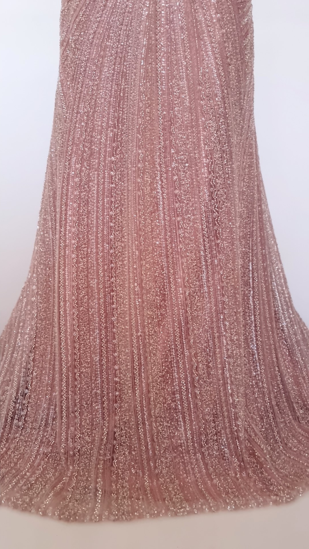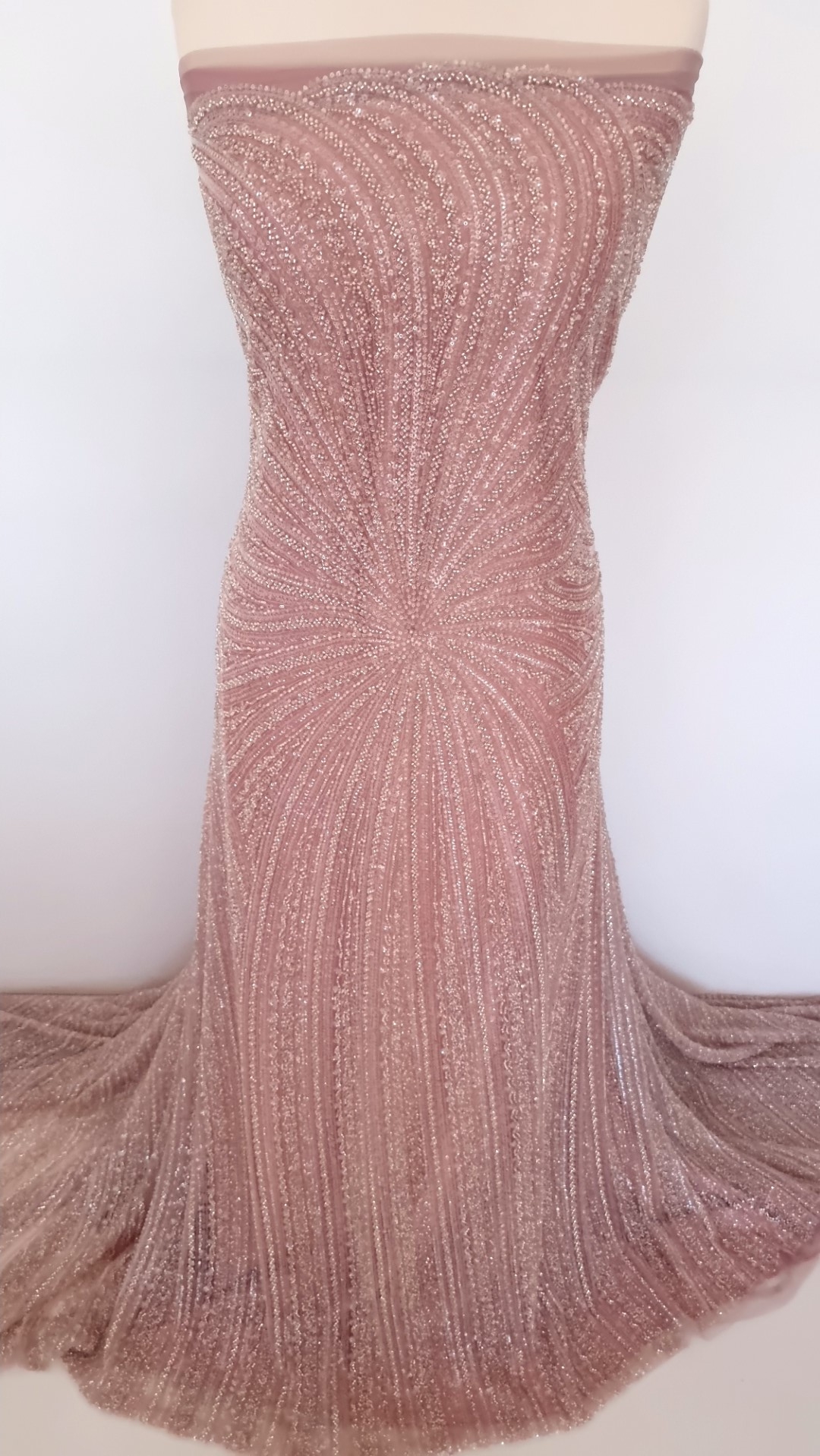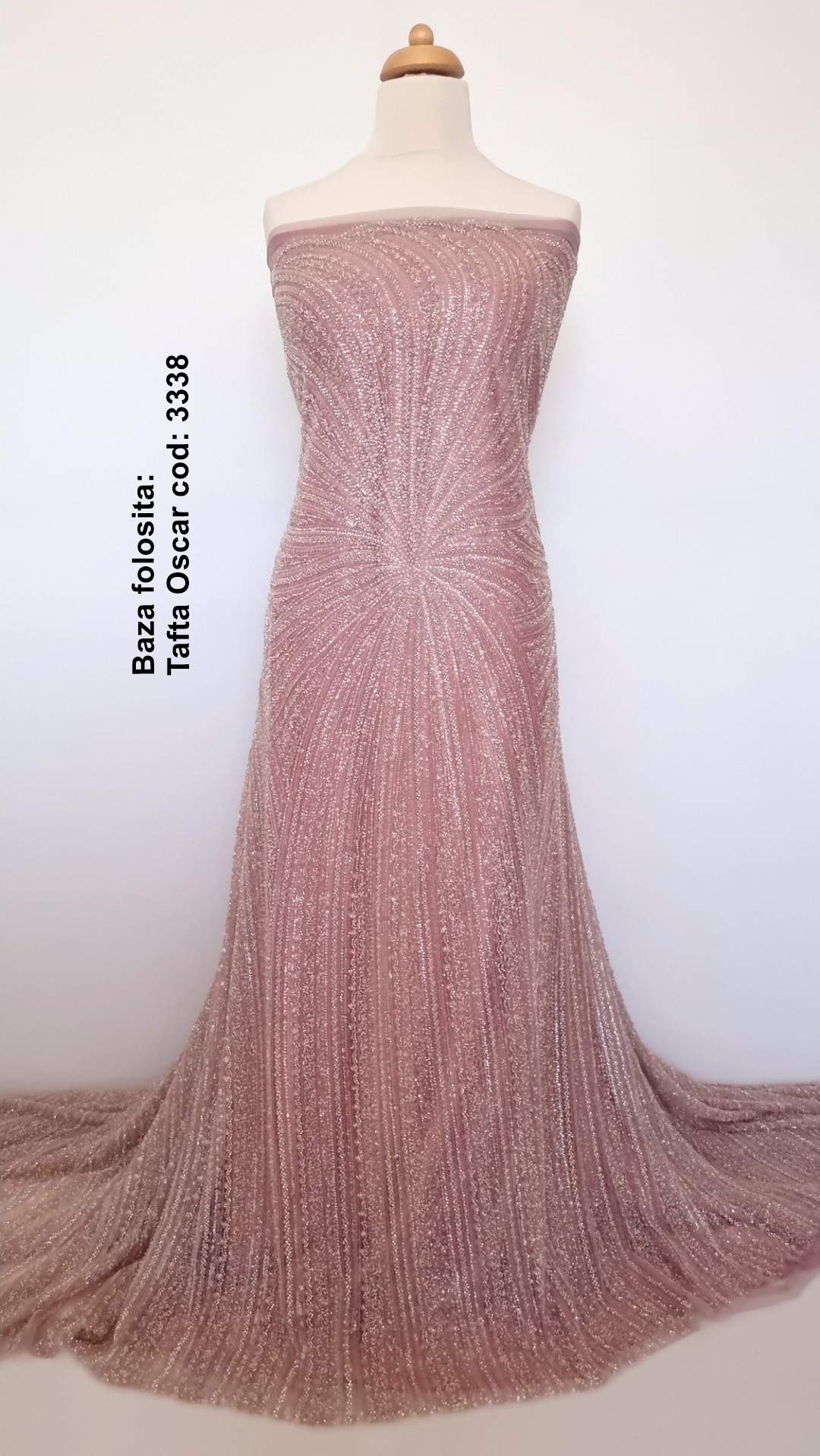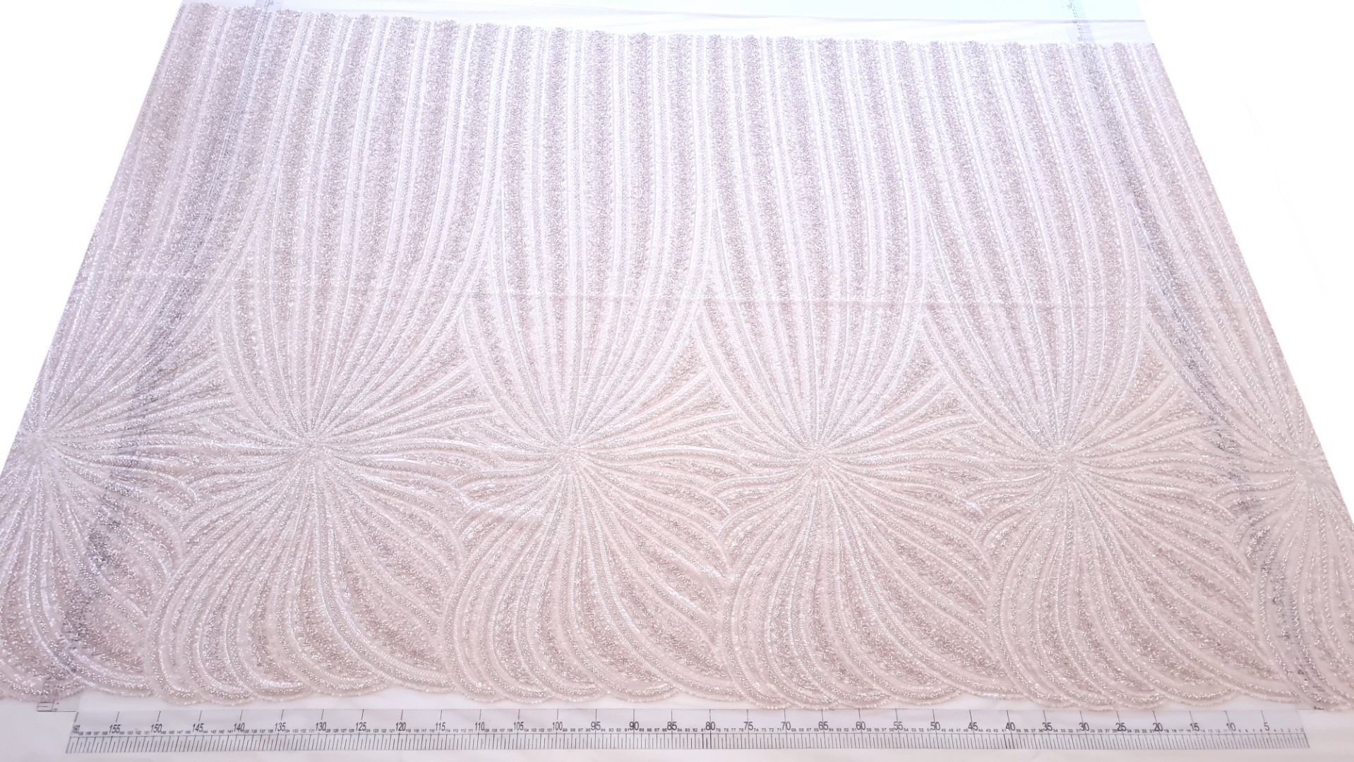 Broderie accesorizata Sweet Pink cu micropaiete de diferite dimensiuni si margele tubulare cusute pe tulle roz deschis, usor elastic.