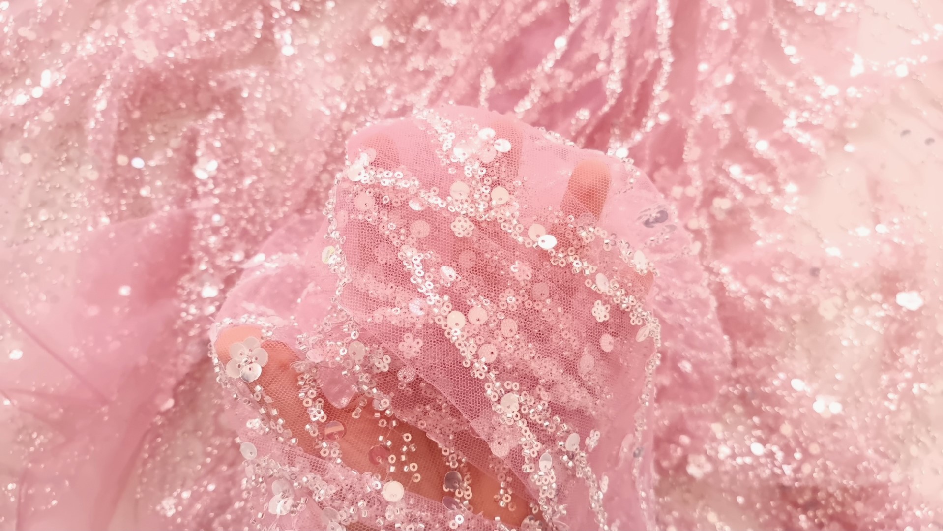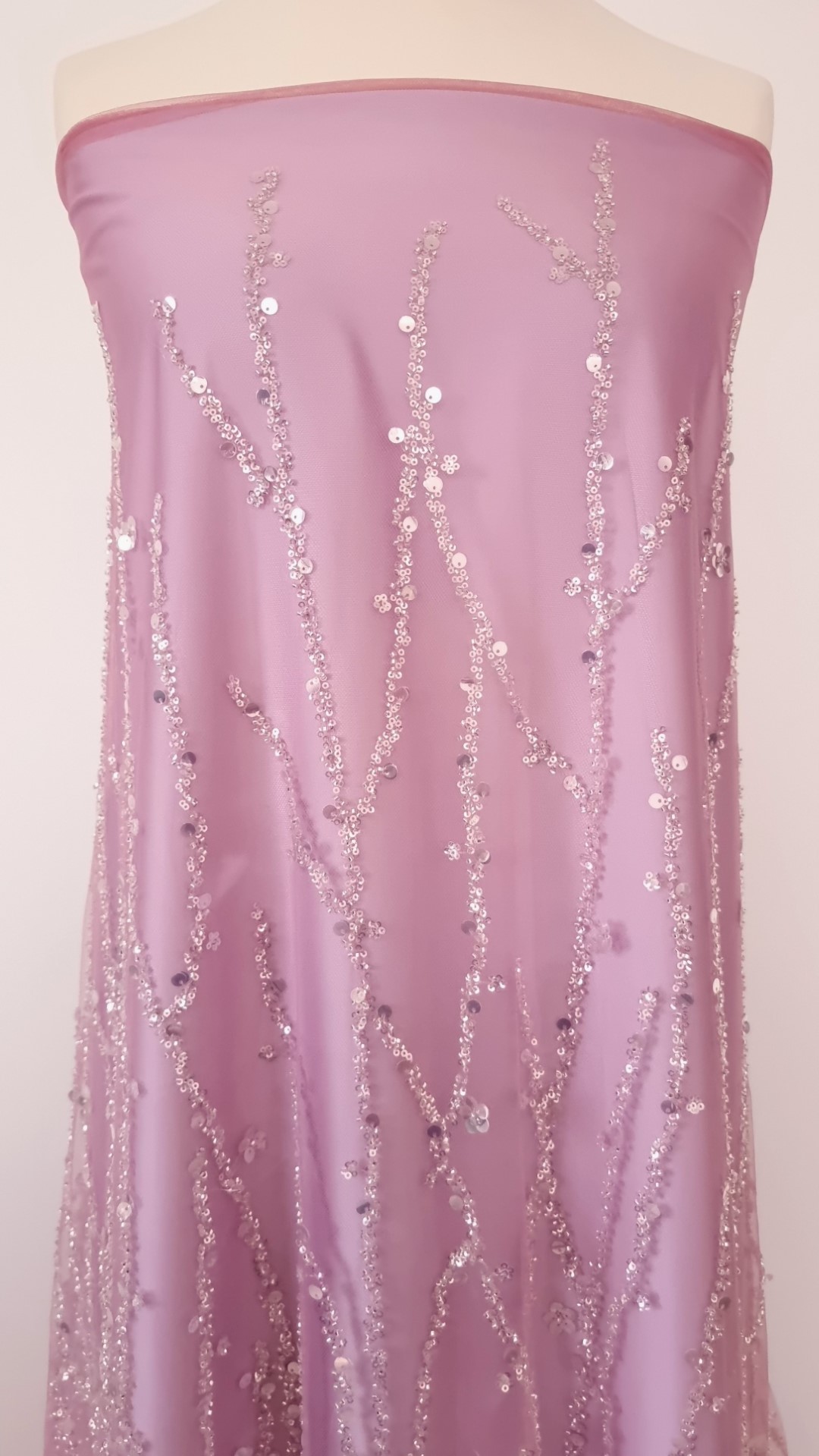 Broderie argintie cu siraguri pe tulle roz pudra, usor elastic.