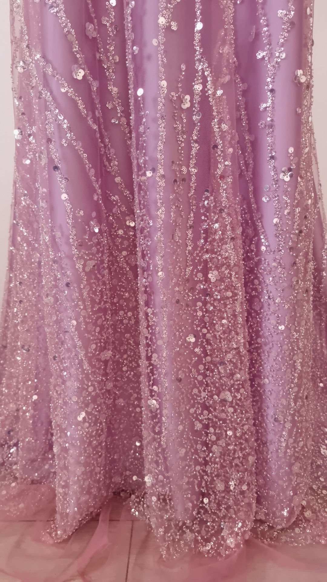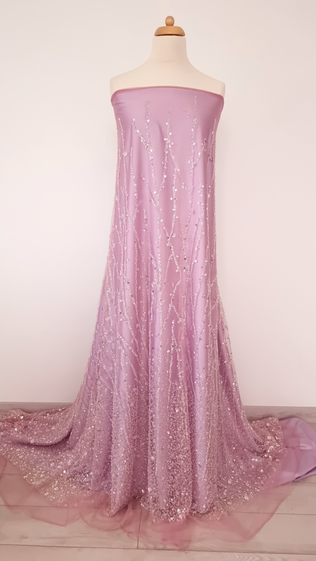 Accesoriile sunt dispuse in forma unor siraguri formate din micropaiete argintii, pe intreaga suprafata a broderiei si creeaza un aspect luminos si spectaculos tinutei.
