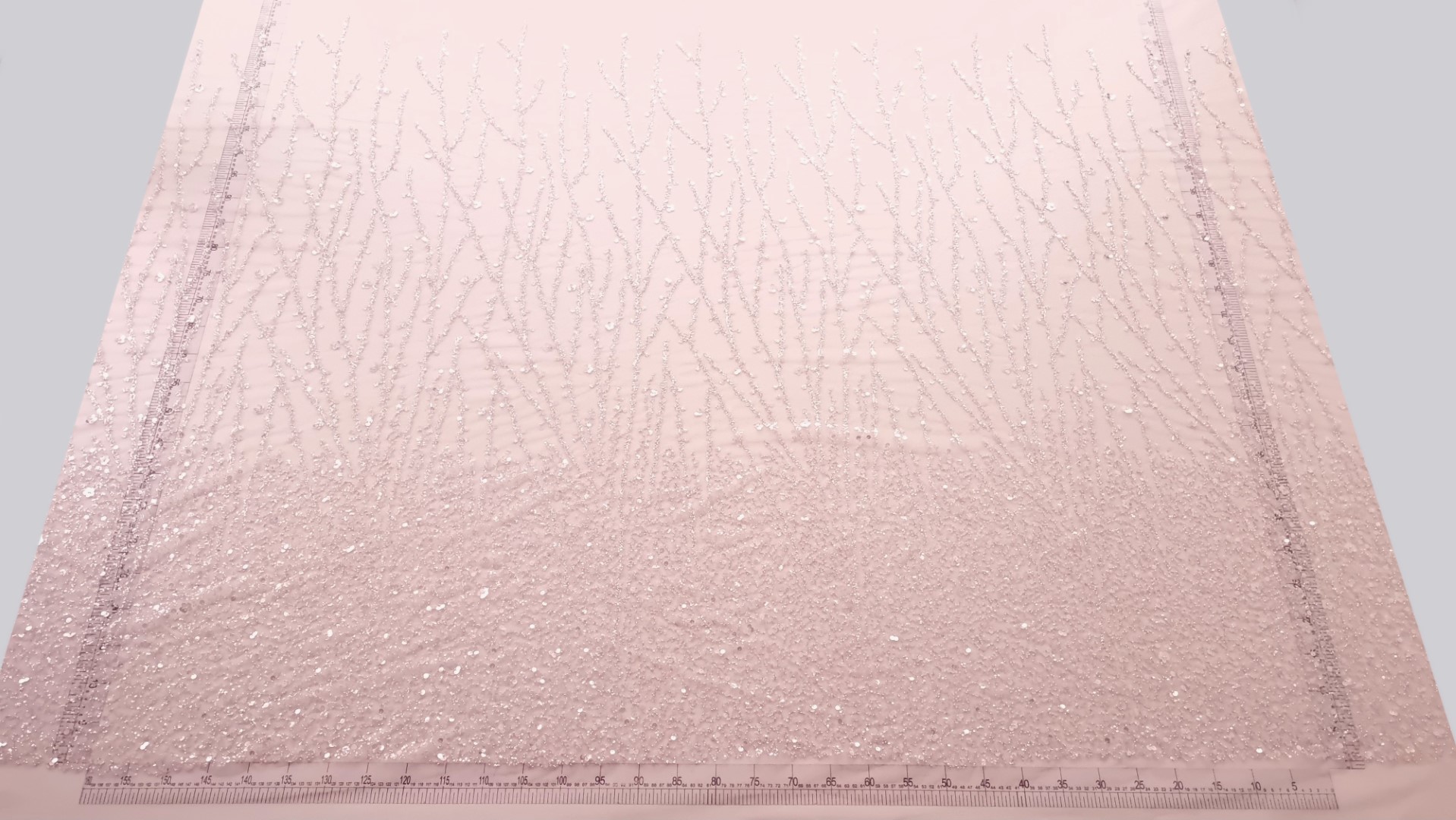 Caracteristici Broderie argintie cu siraguri pe tulle roz pudra: