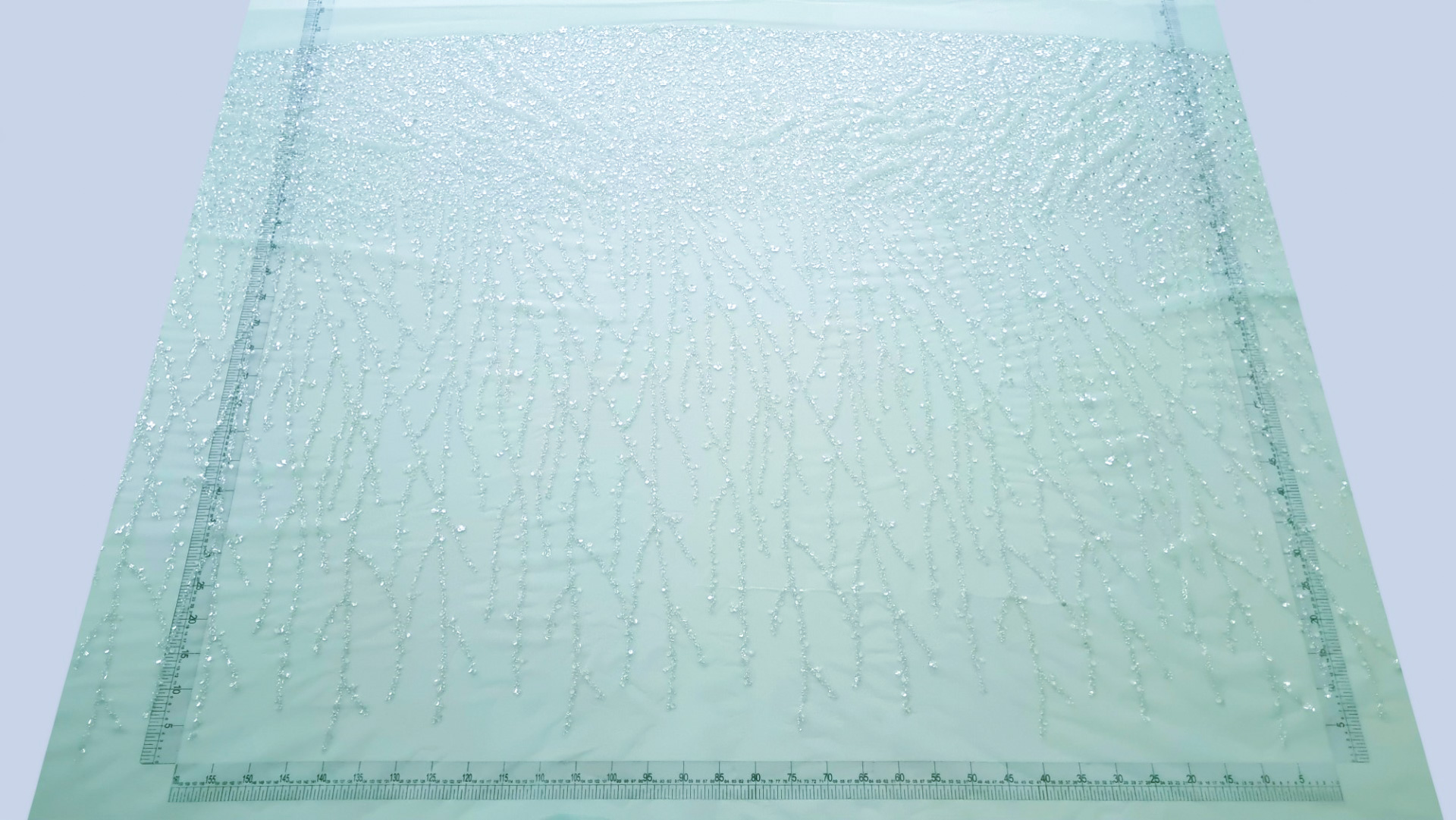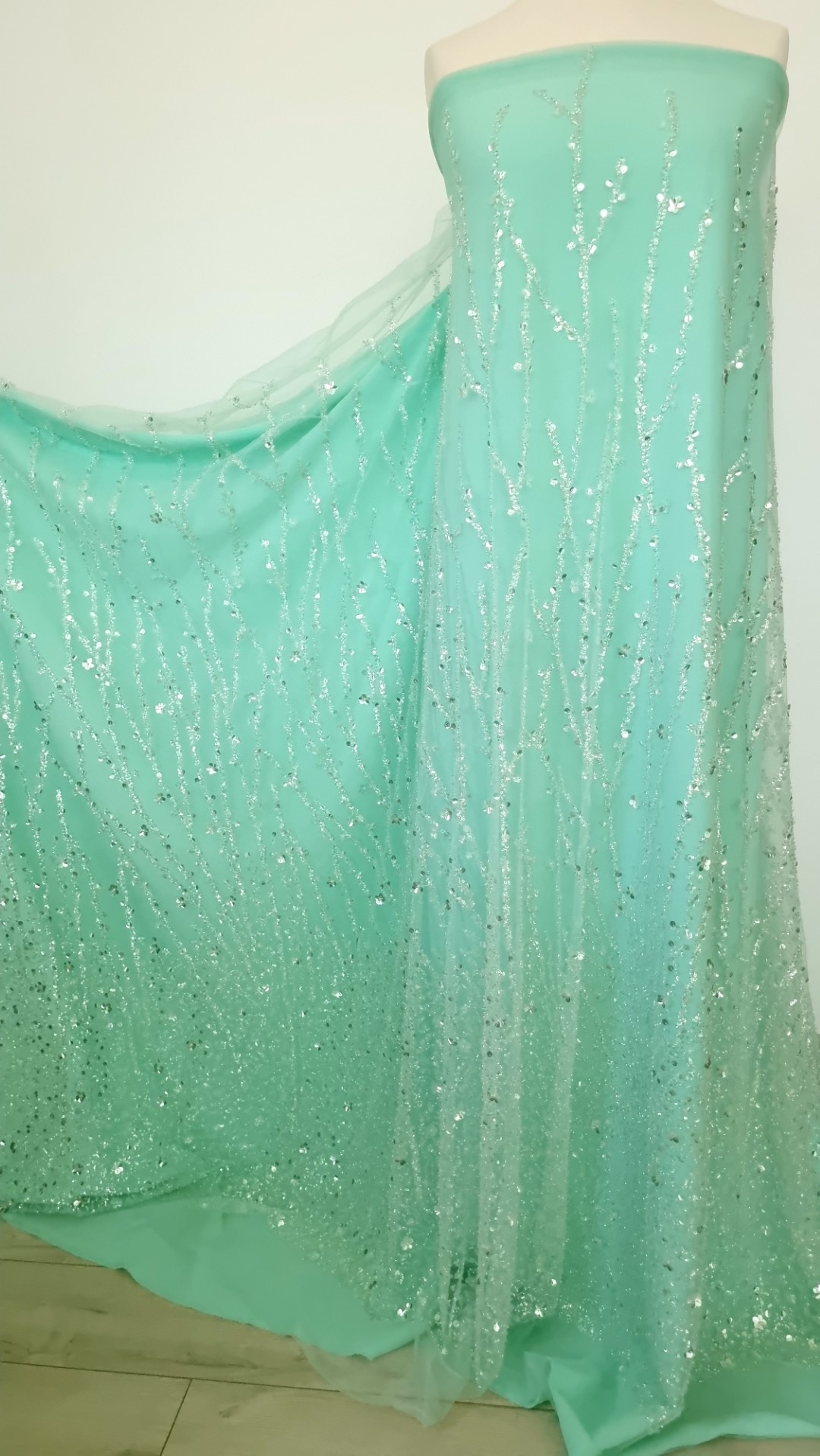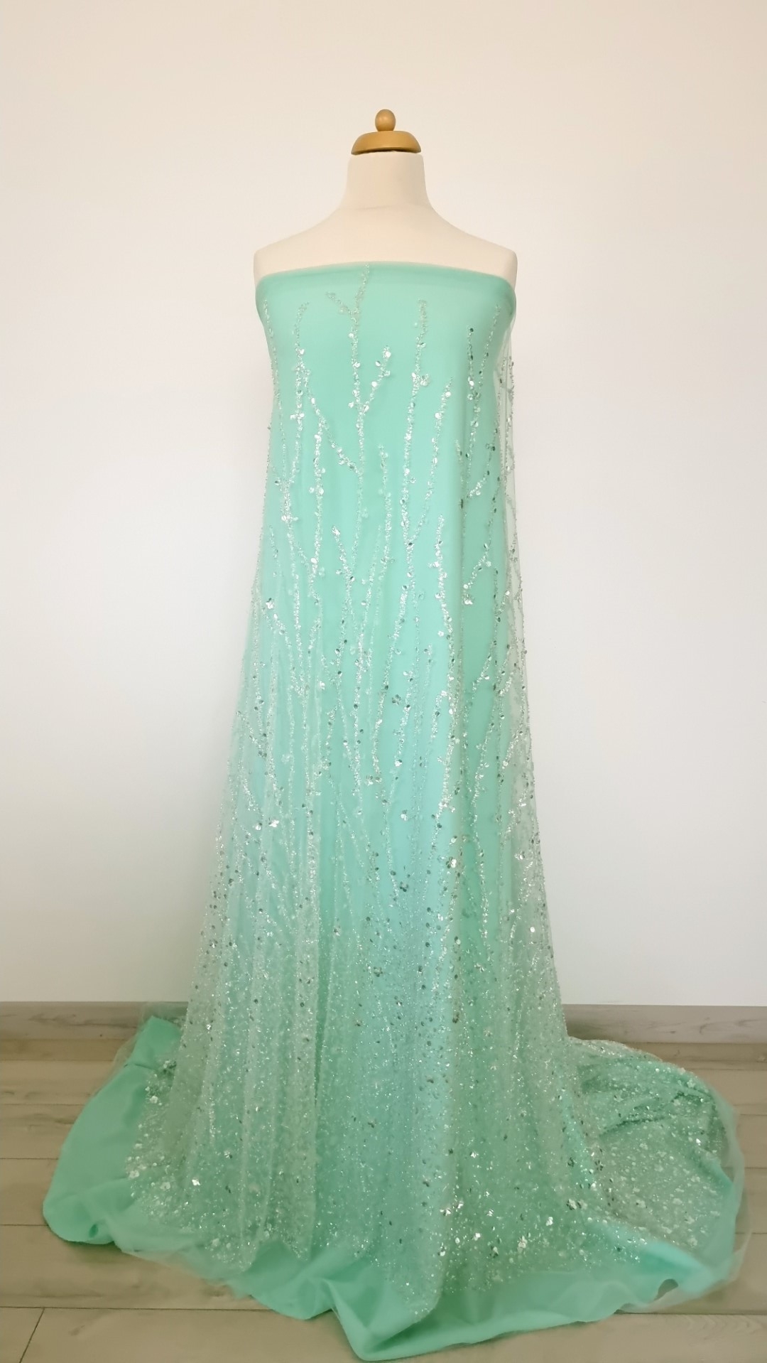 Caracteristici Broderie argintie cu siraguri pe tulle verde deschis: