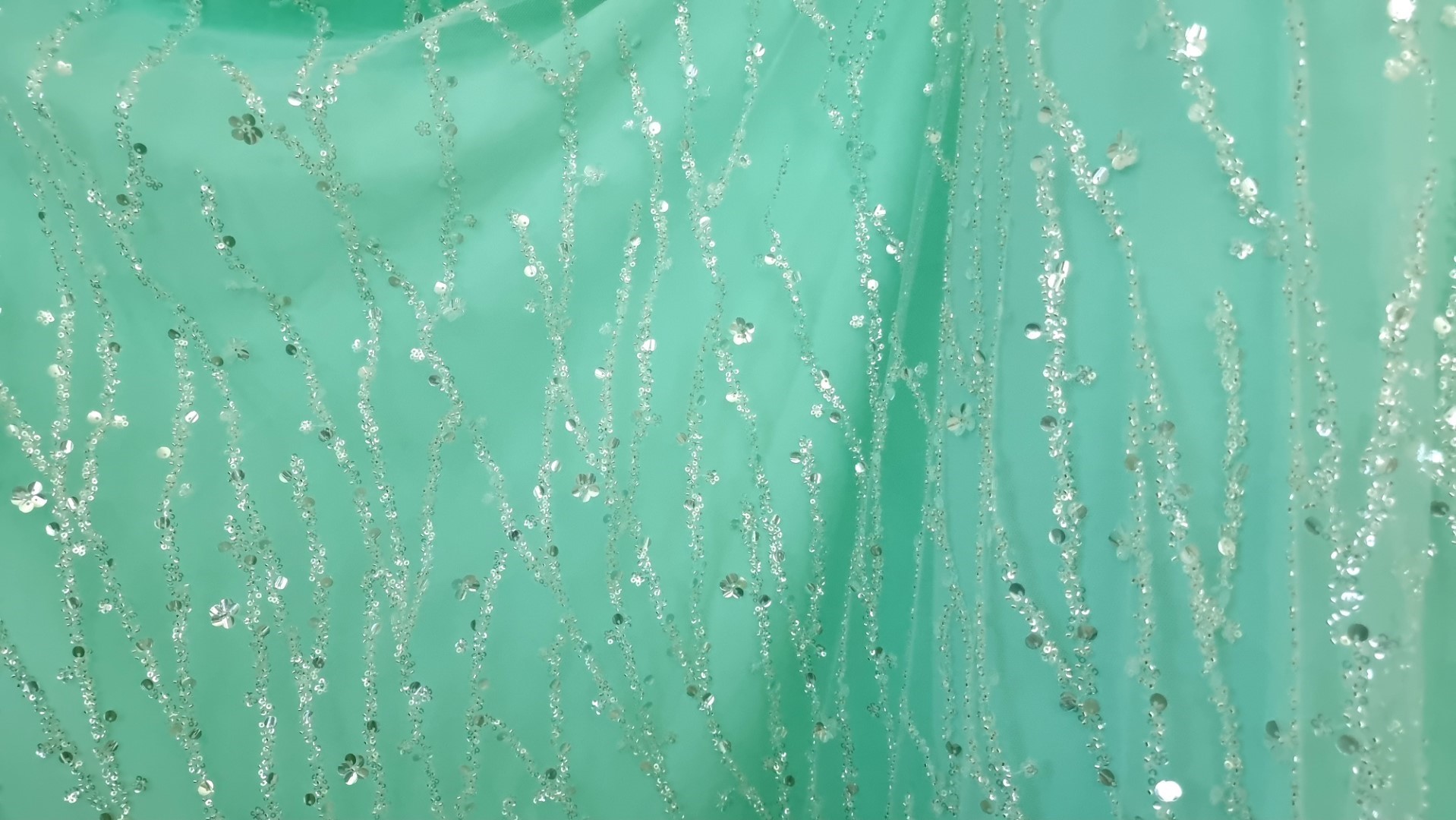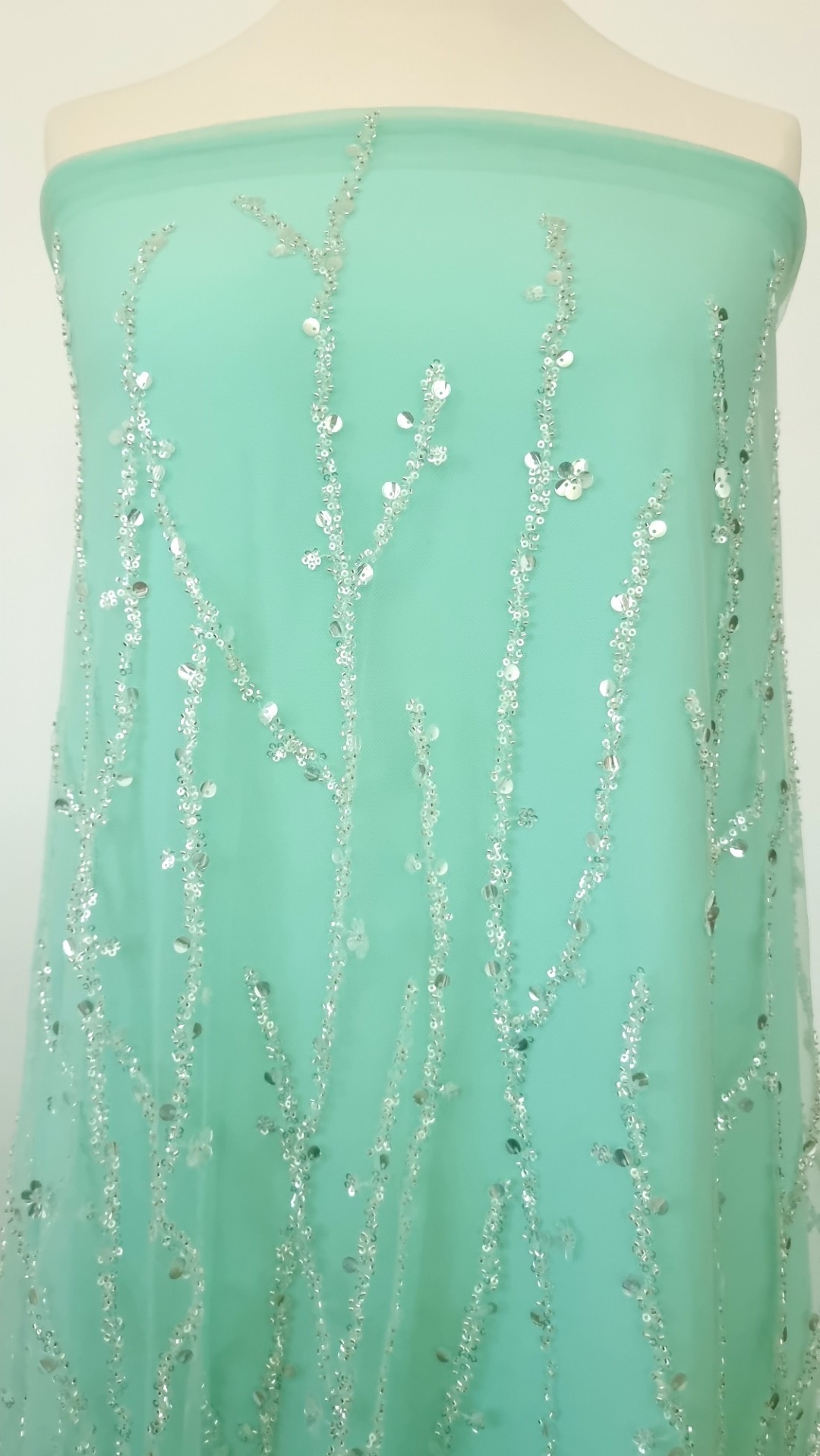Broderie argintie cu siraguri pe tulle verde deschis, usor elastic.