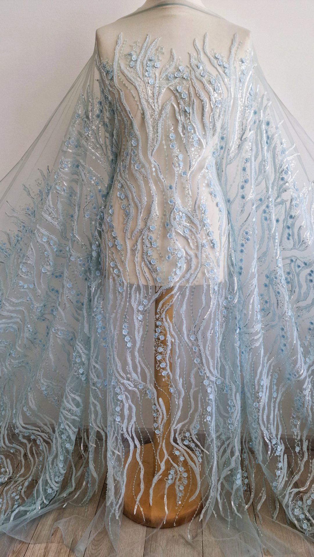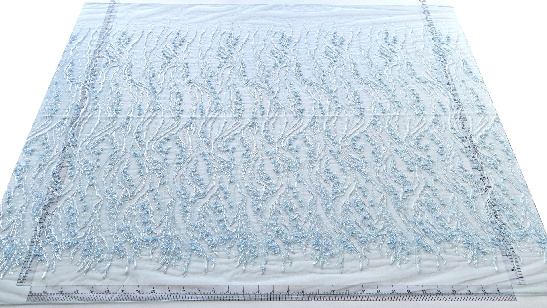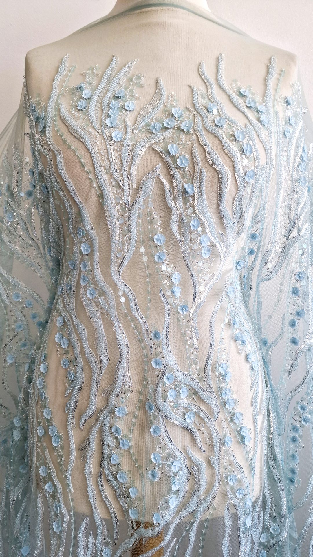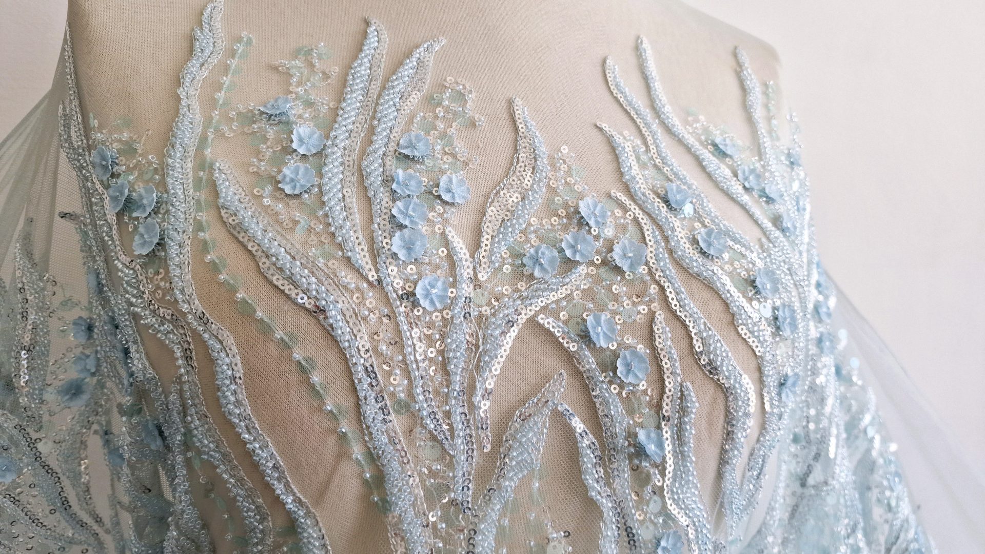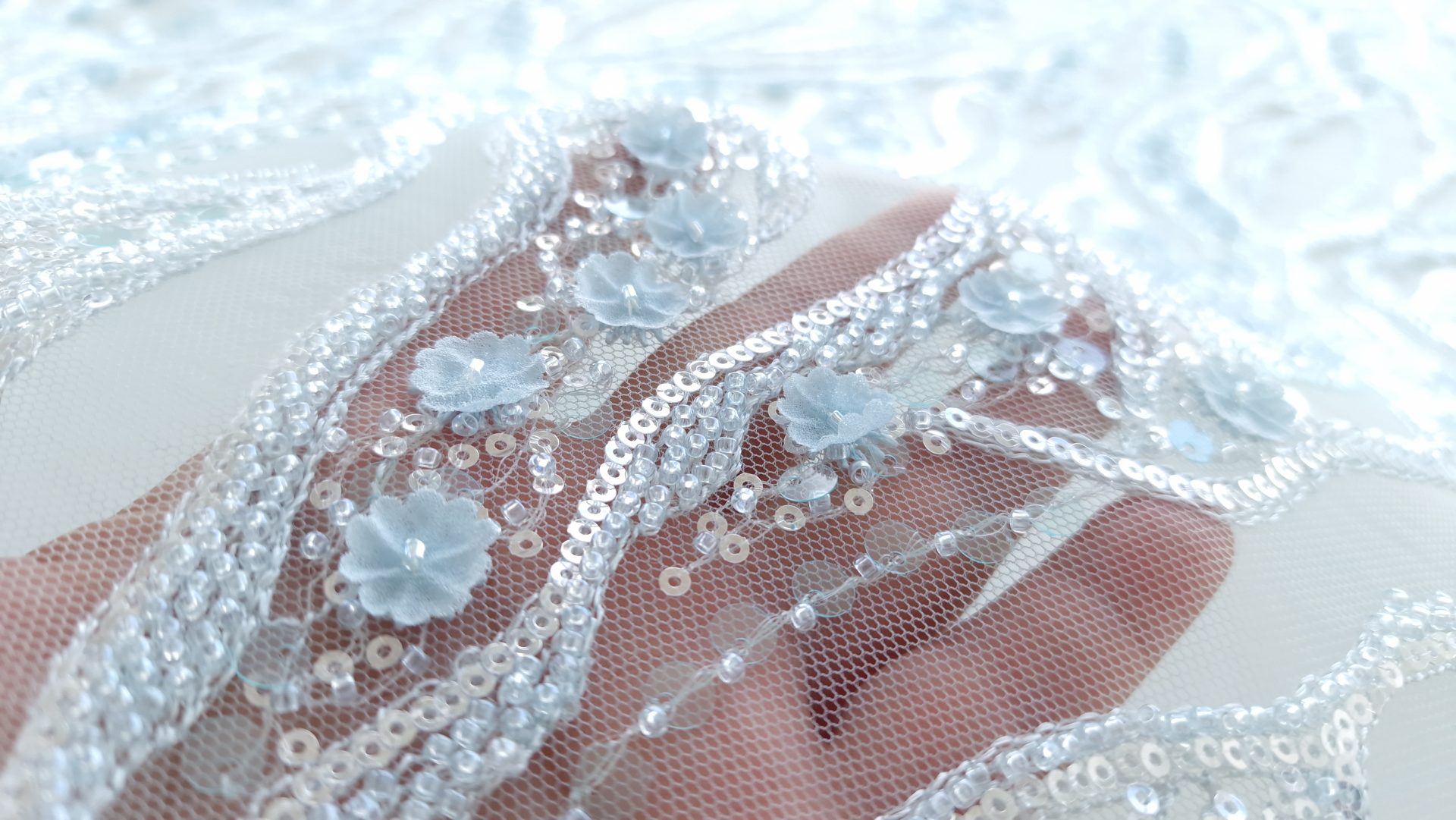 Broderie bleu cu accesorizare pe tulle – flori 3D, micropaiete si margelute transparente si bleu cusute pe tulle usor elastic.