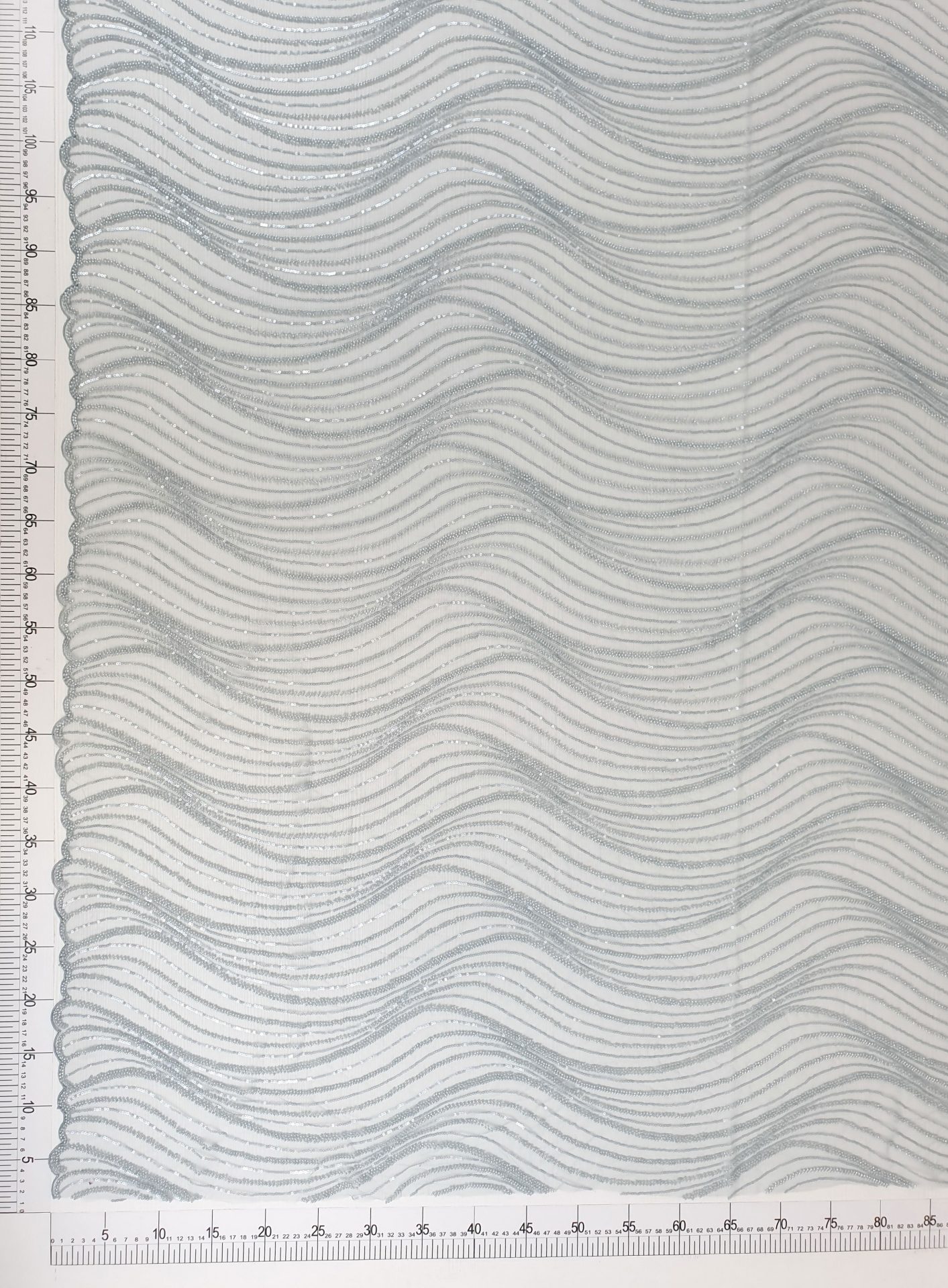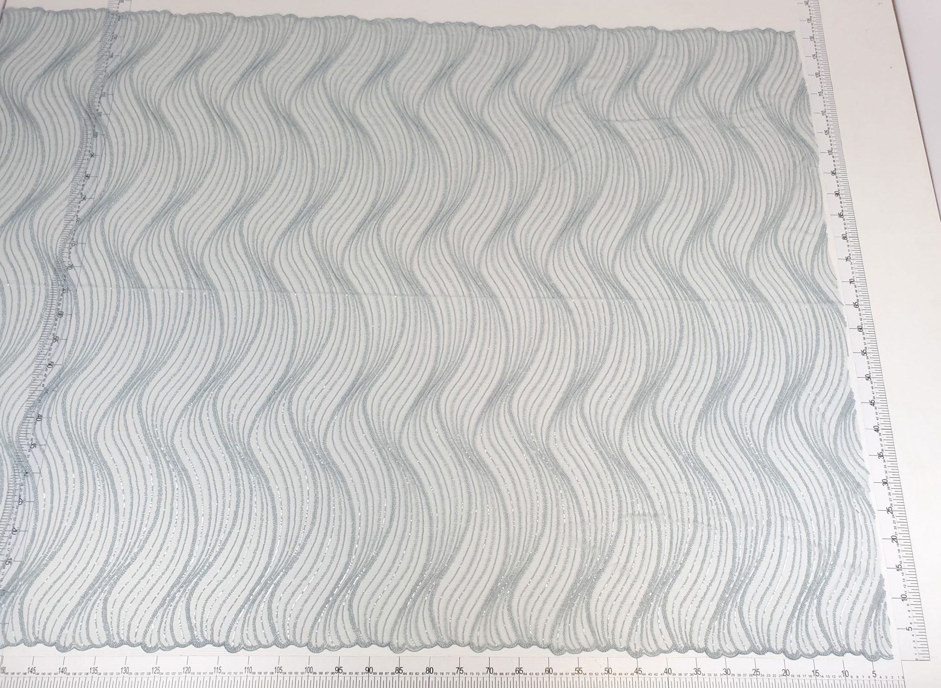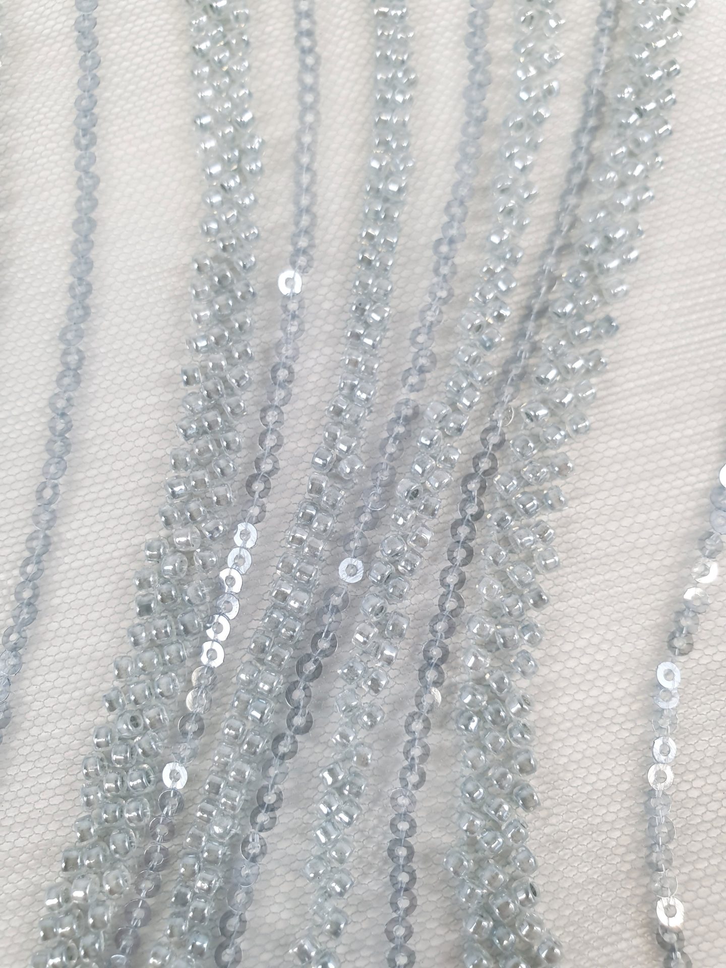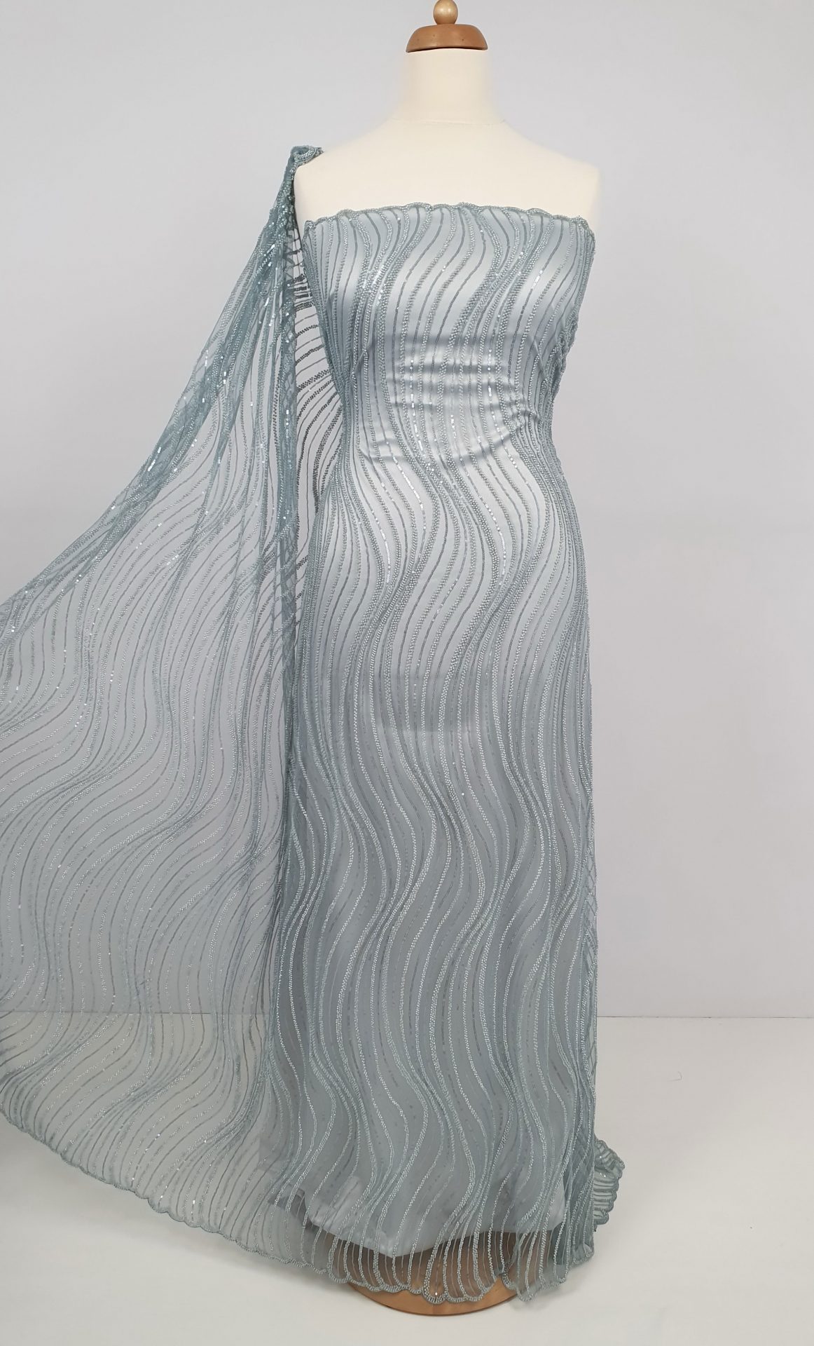 Broderie cu linii curbate din margele blue grey si paiete, cusute pe tul blue grey, usor elastic.