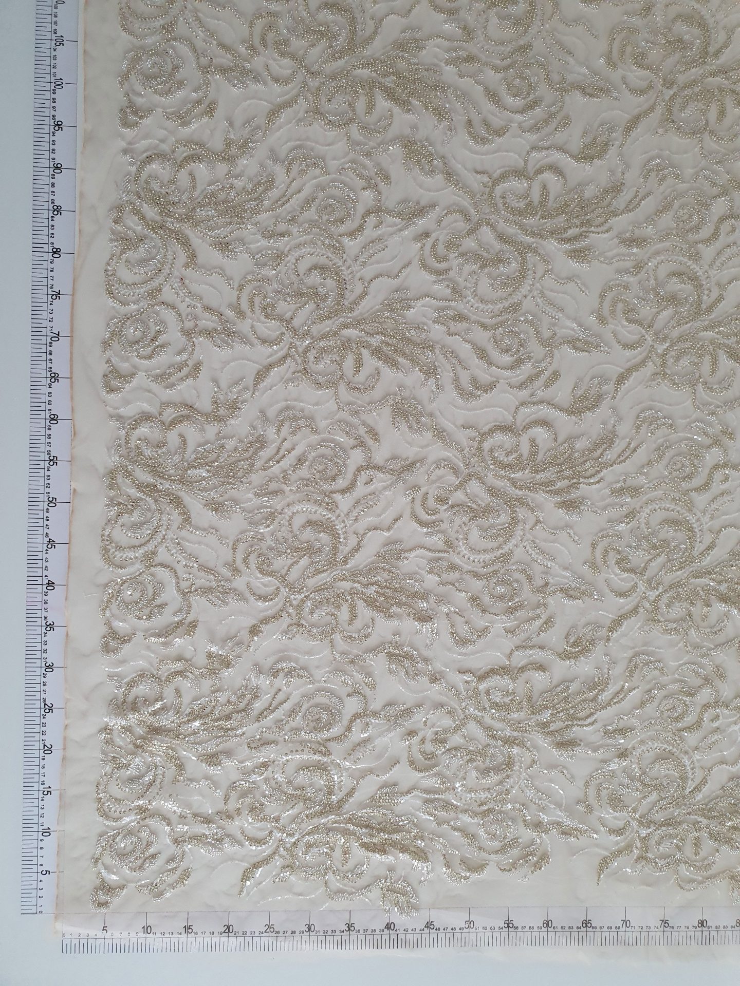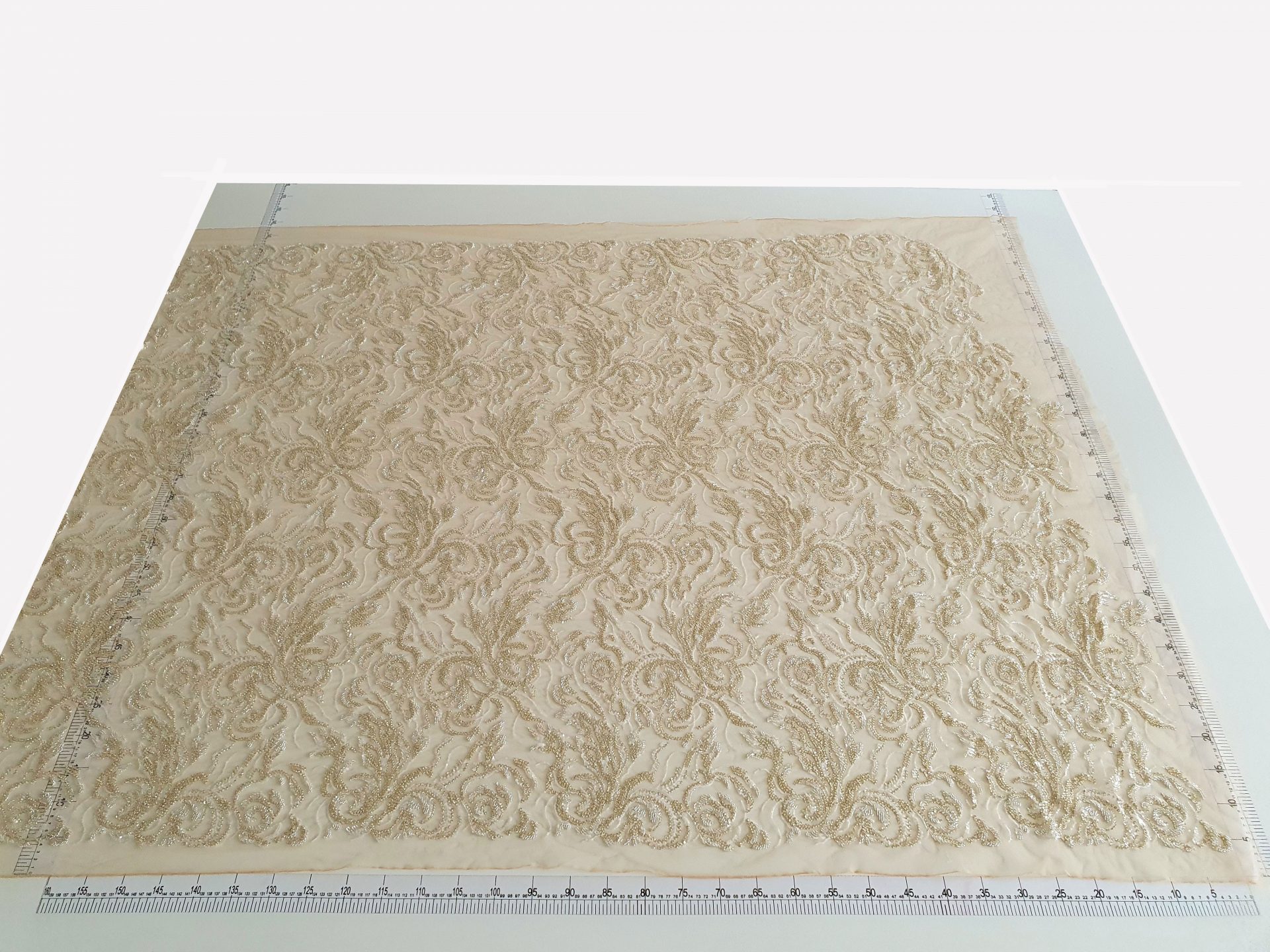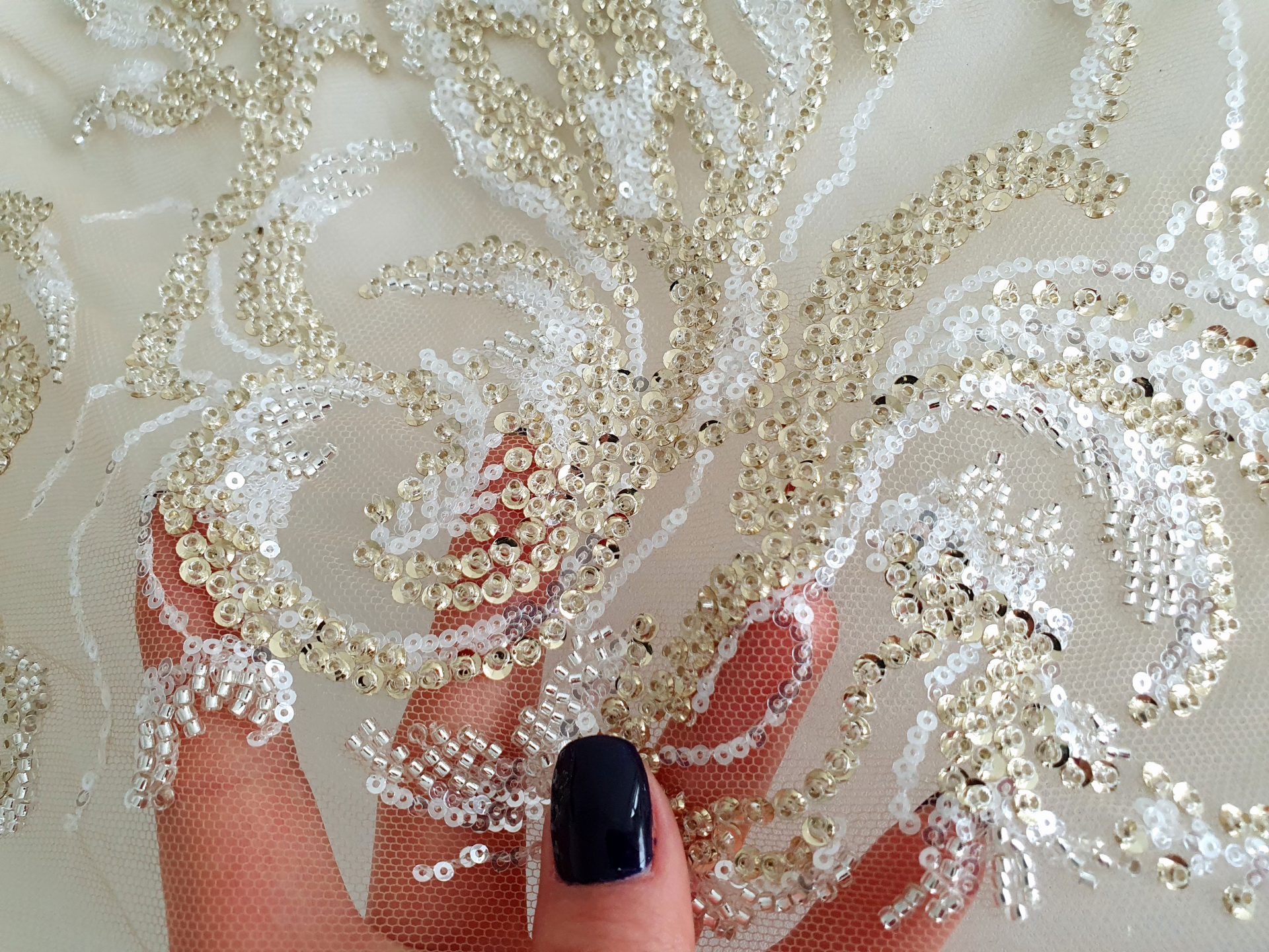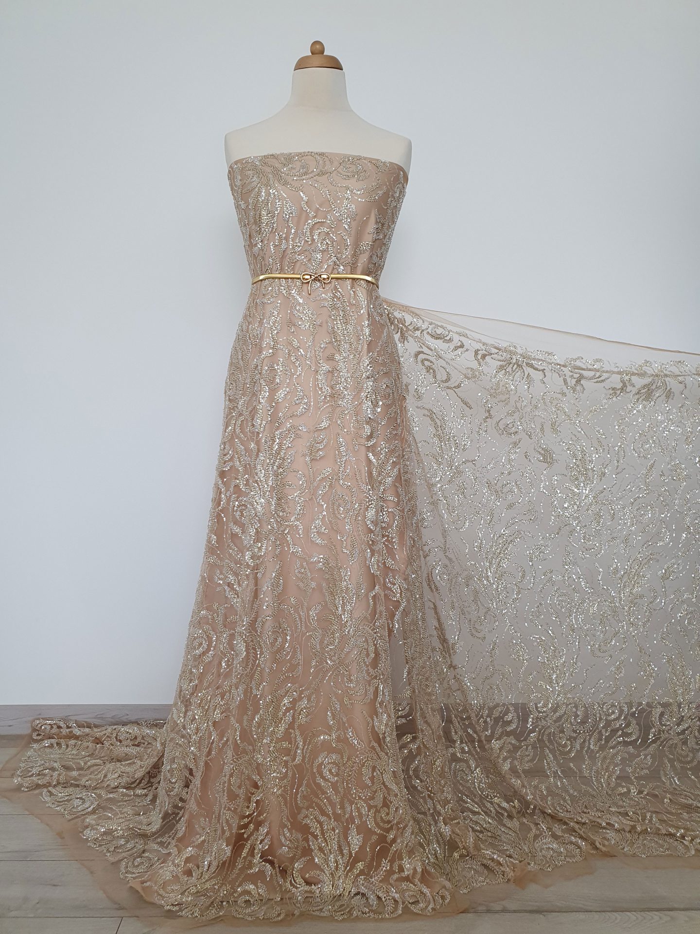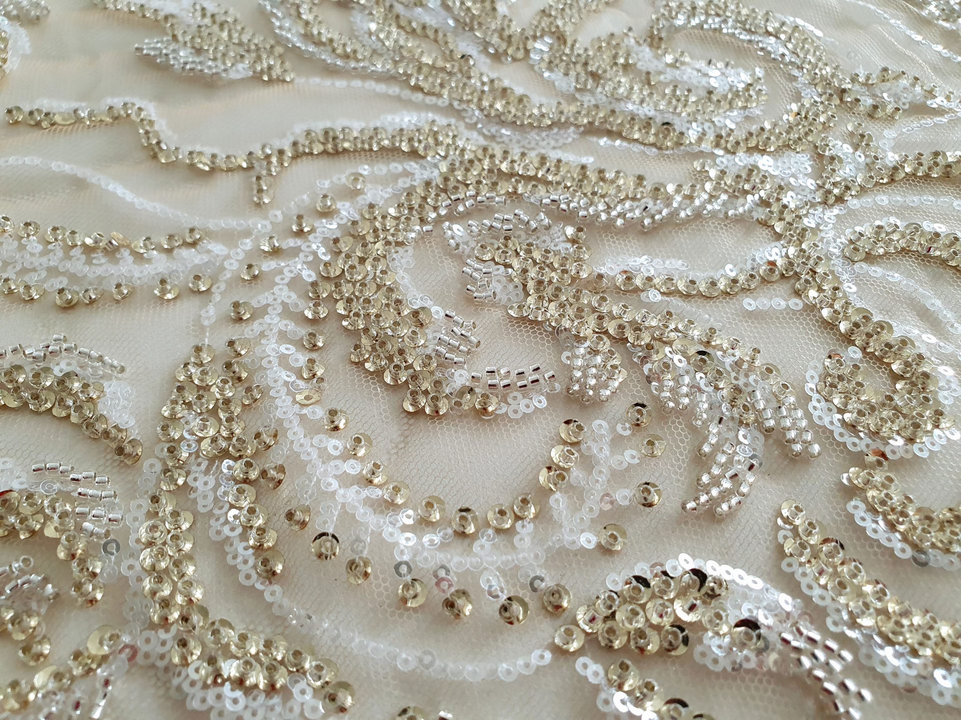 Broderie champagne cu margele si paiete, aurii si argintii, cusute pe tulle usor elastic, de culoare nude.