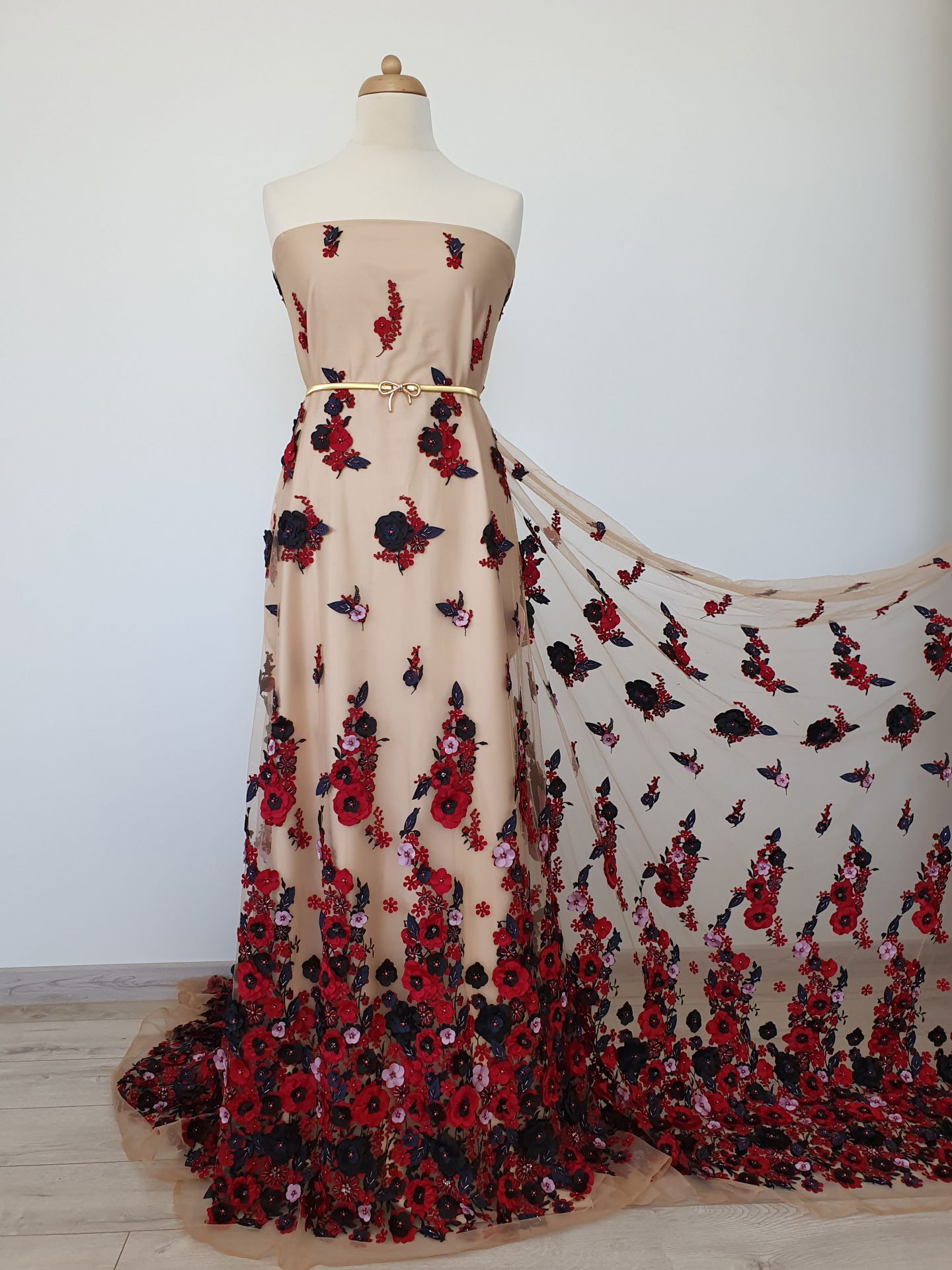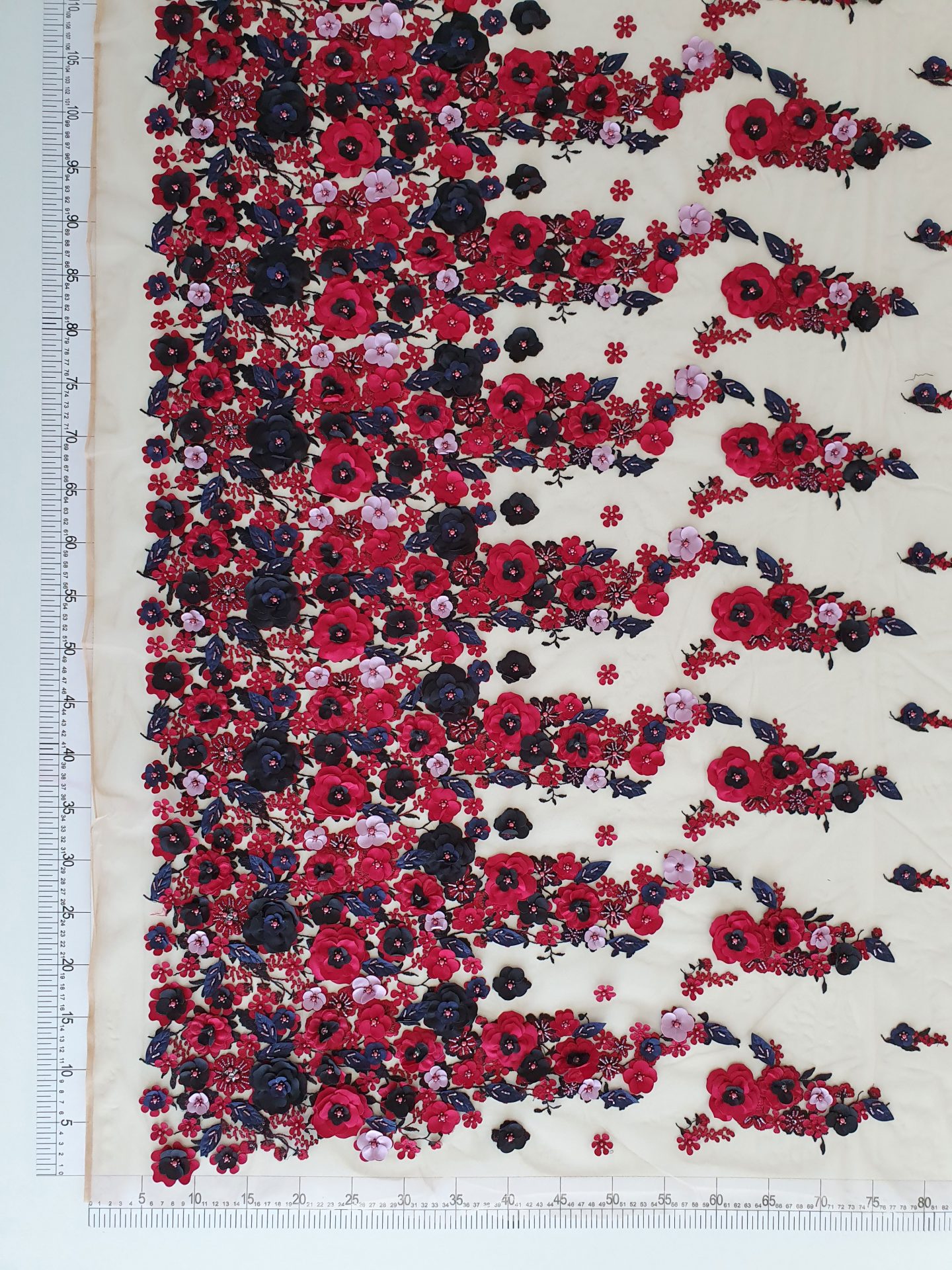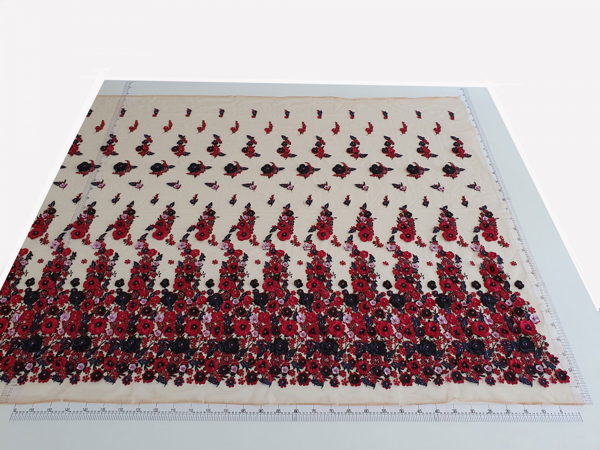Tulul folosit ca baza este nude, usor elastic, iar florile sunt in tonuri de rosu, roz-lila, bleumarin si negru.