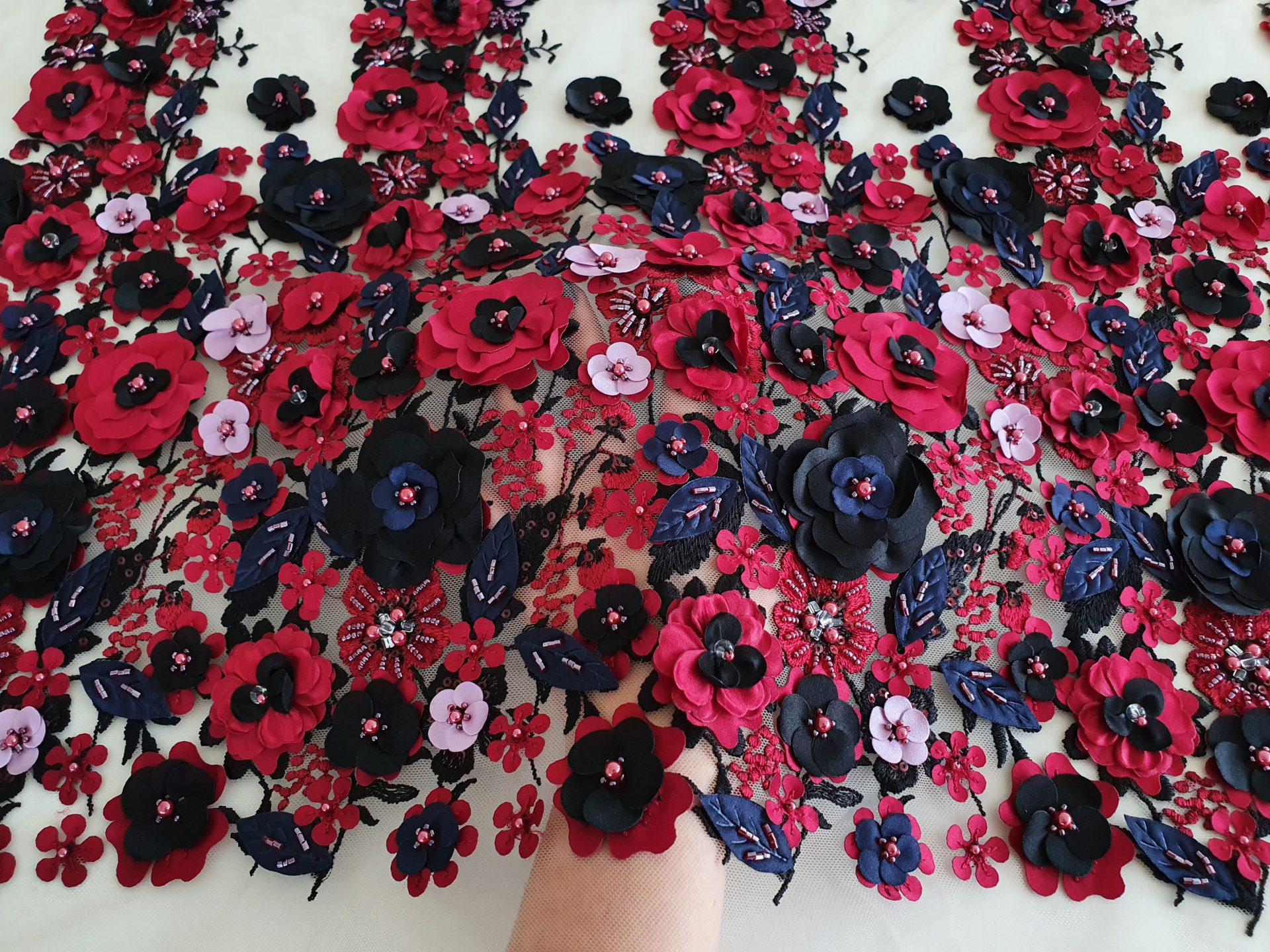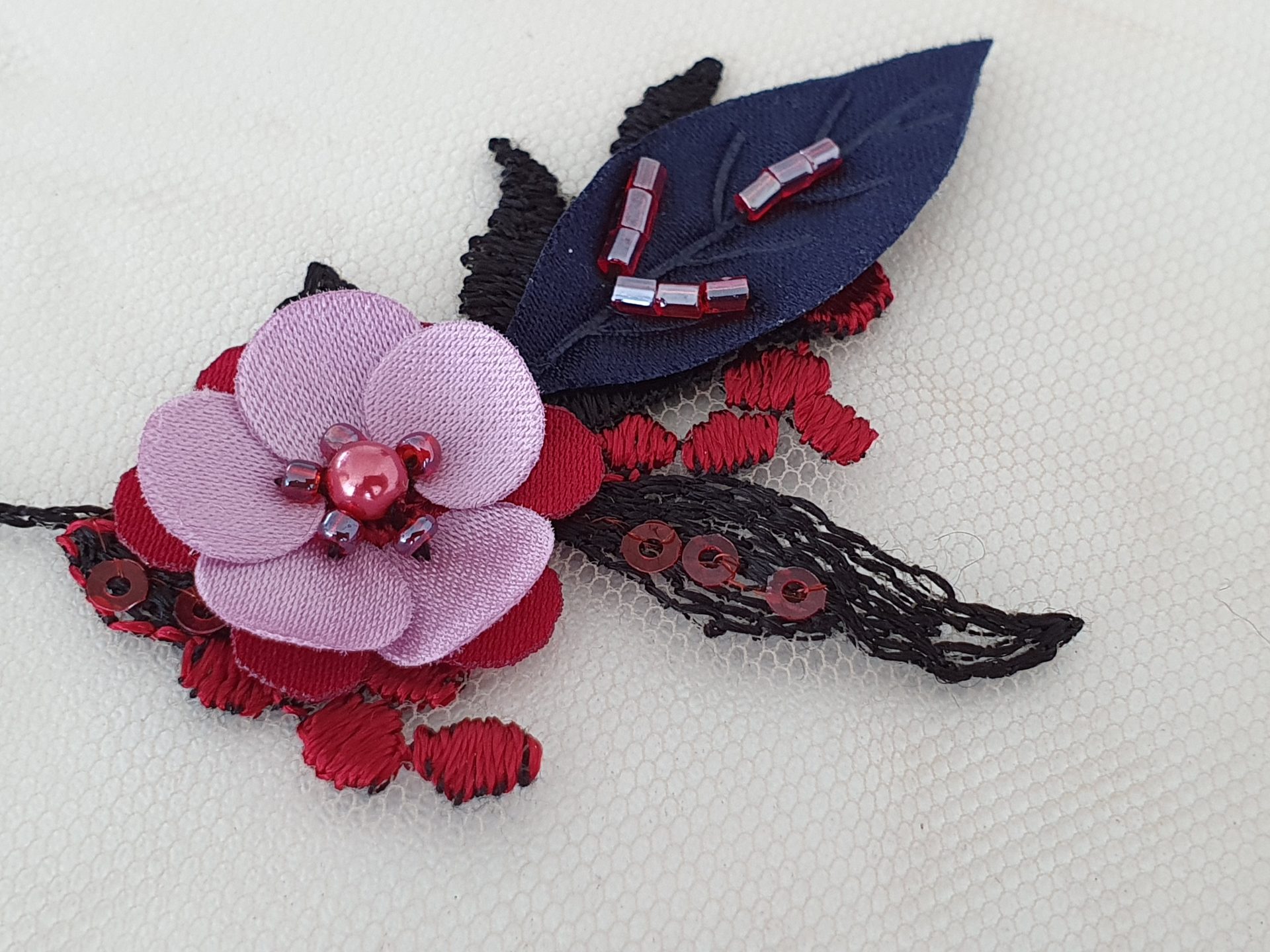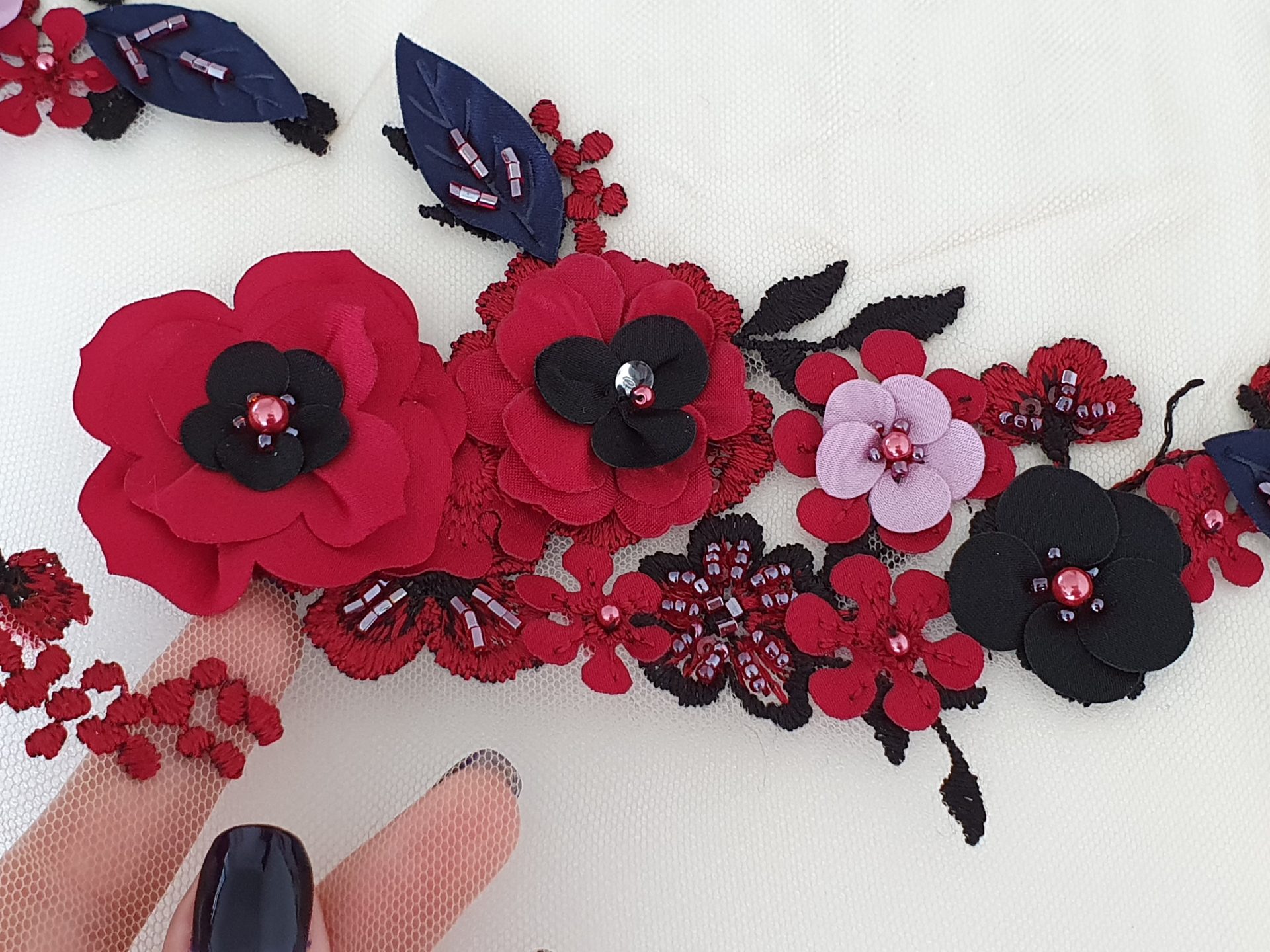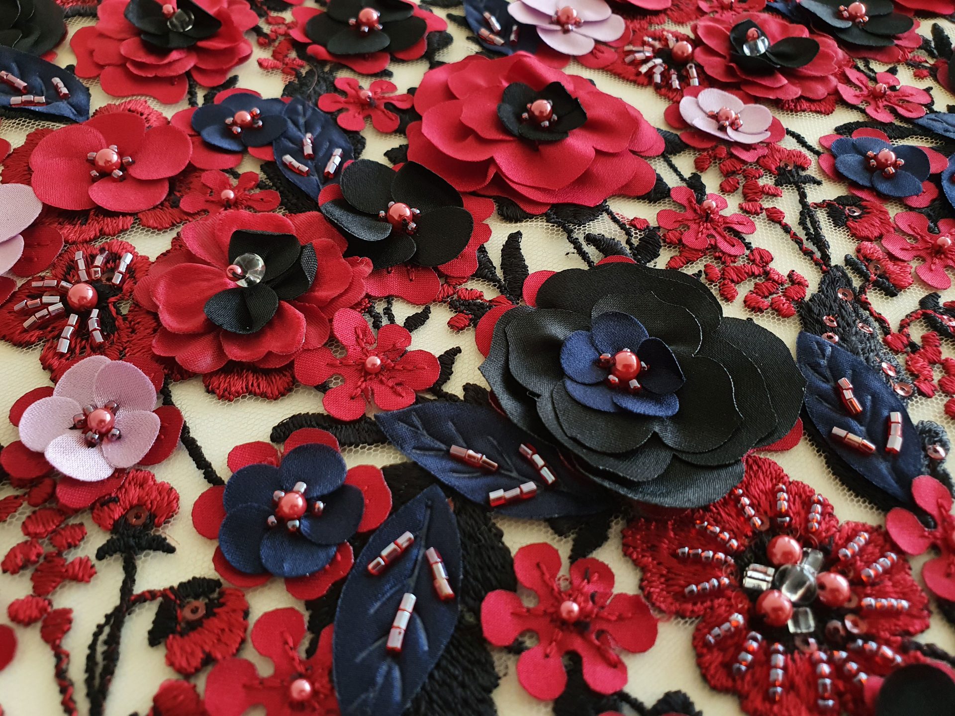 Broderie cu flori 3D black&red, accesorizate cu margele de diferite forme si dimensiuni.