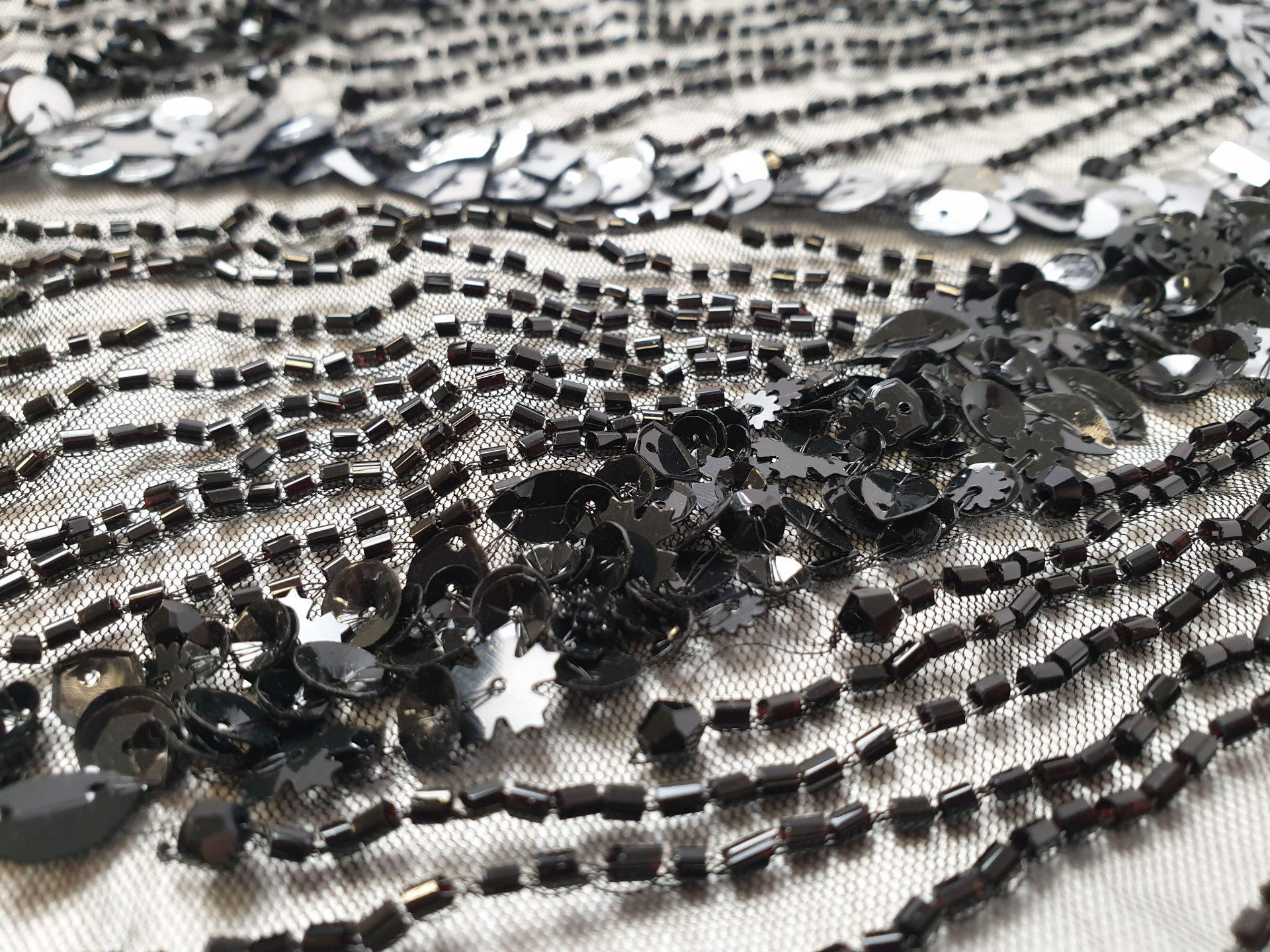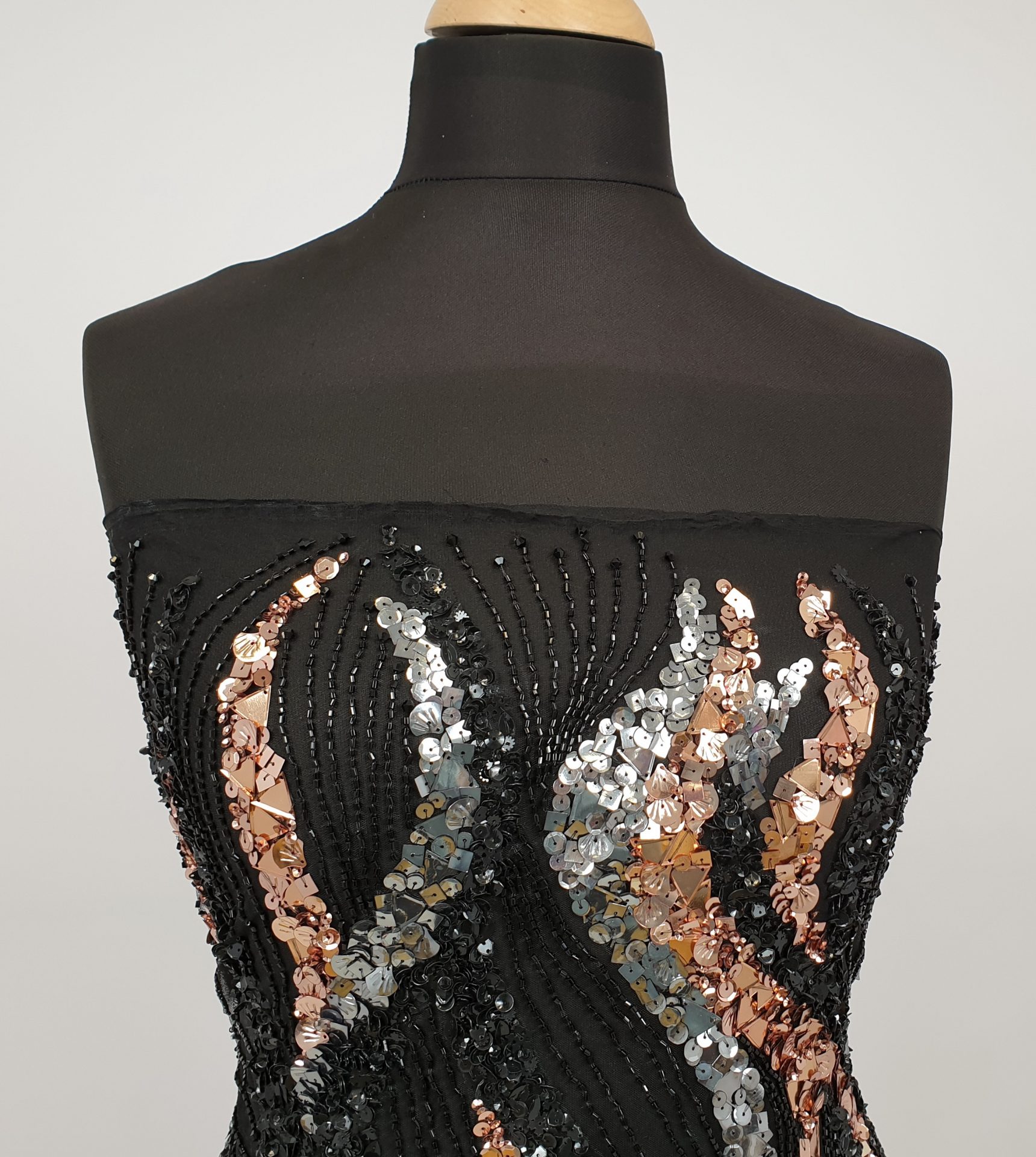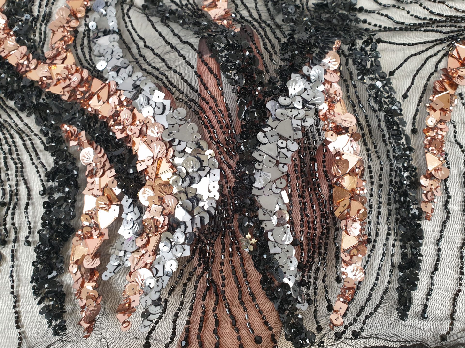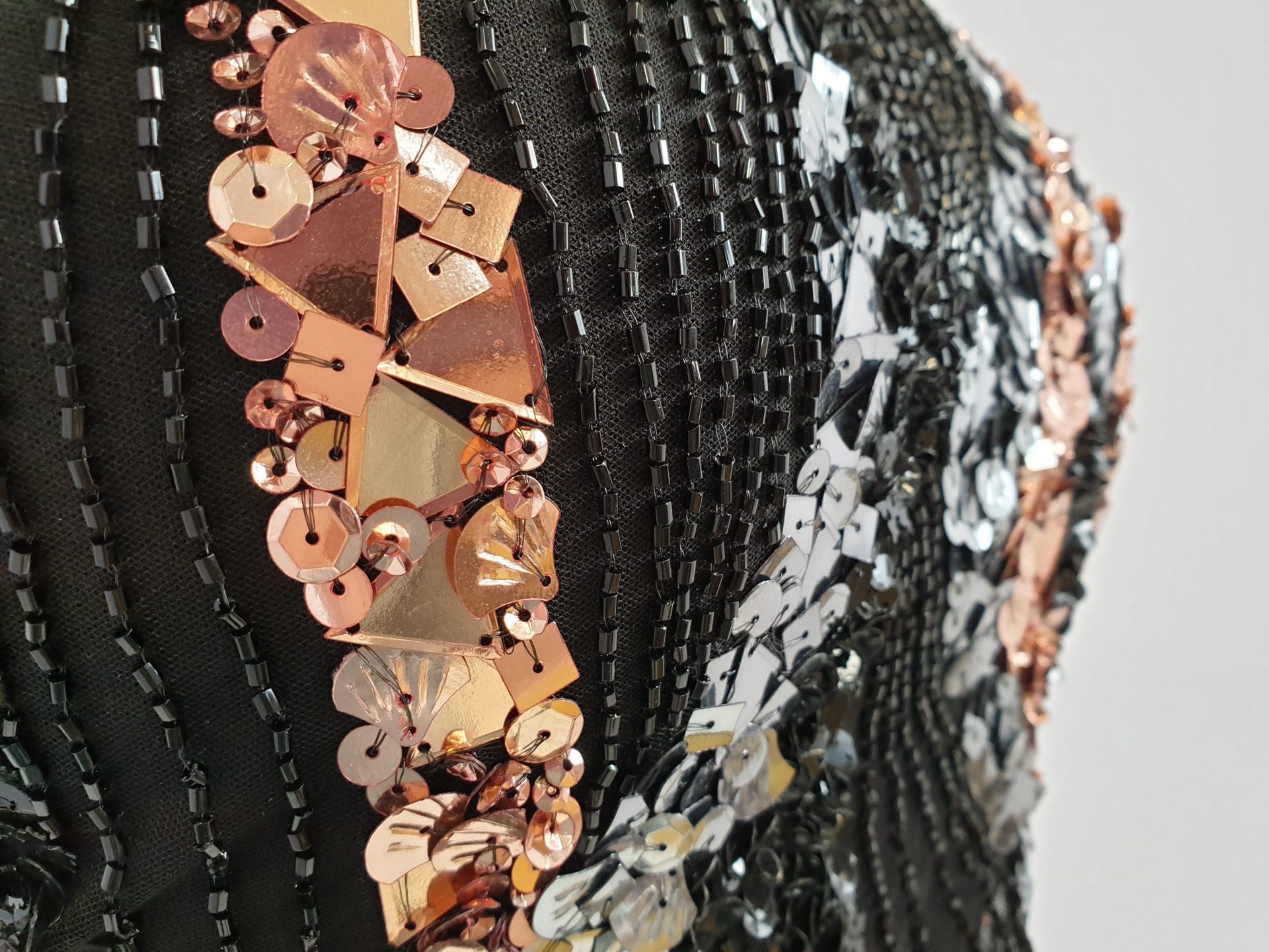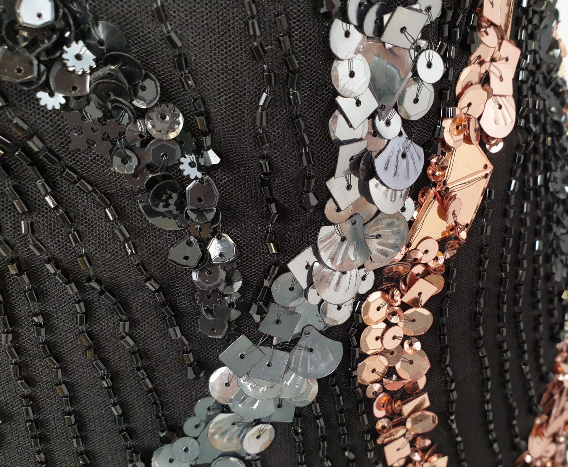 Broderie lucrata 100% manual, cu model realizat din margele, cristale in tonuri de aramiu si argintiu.