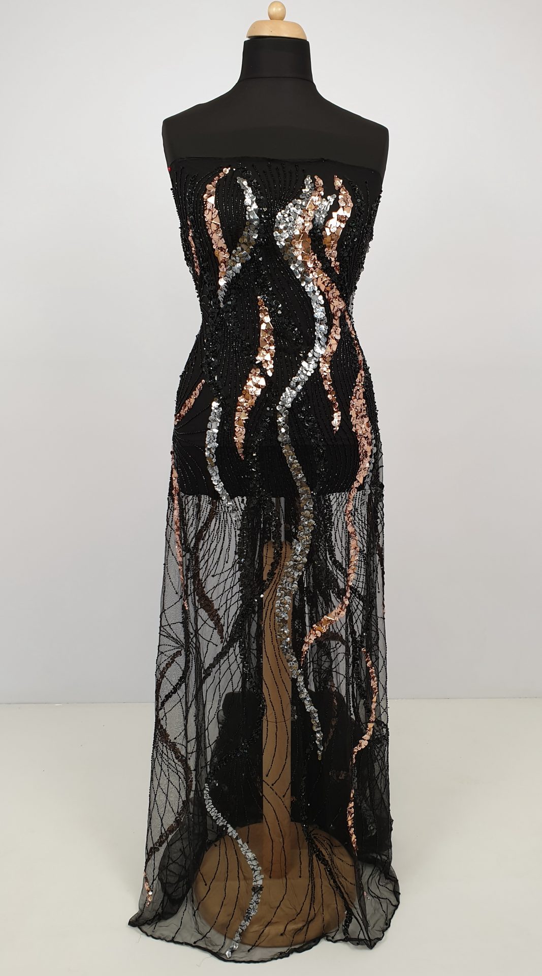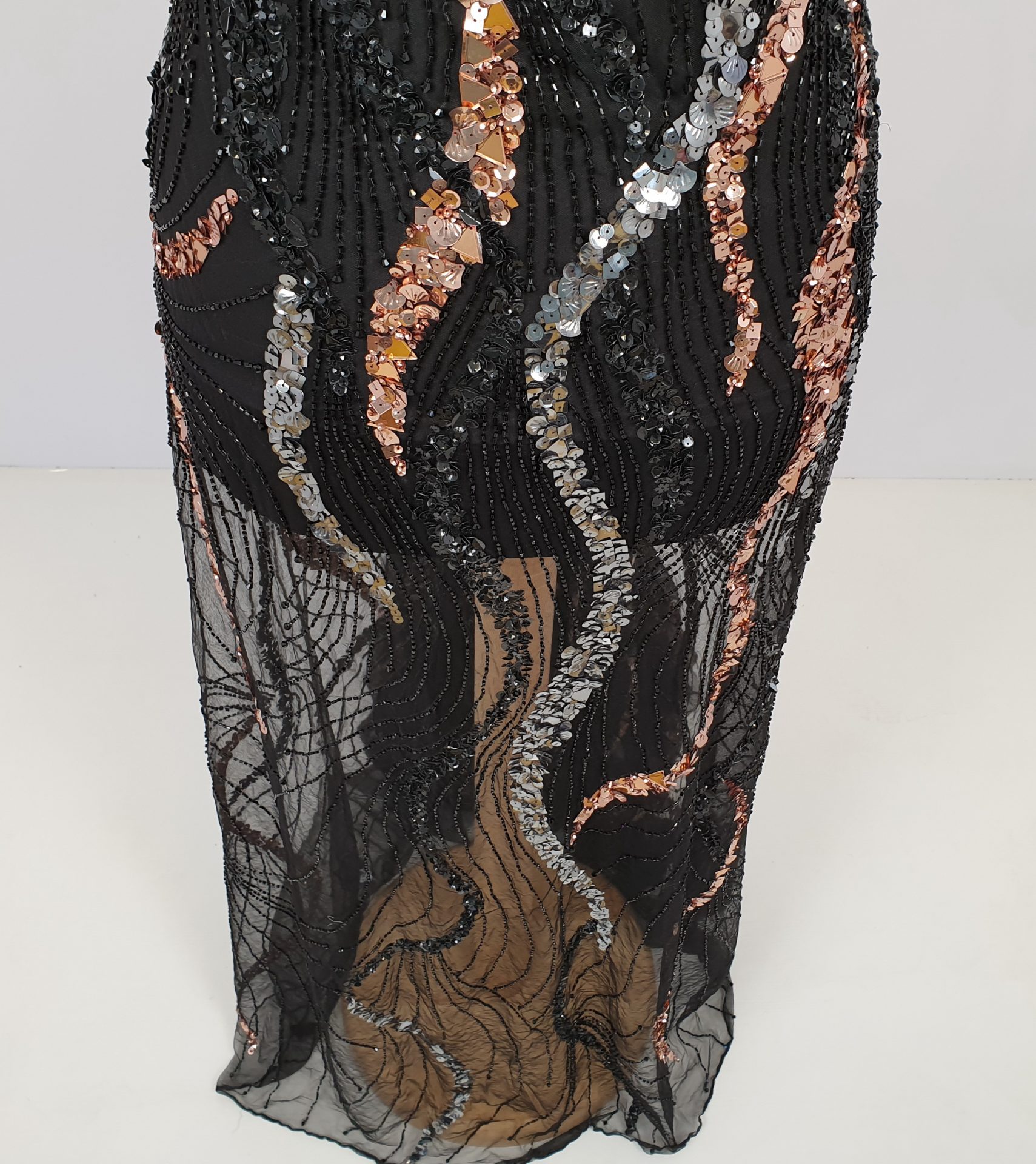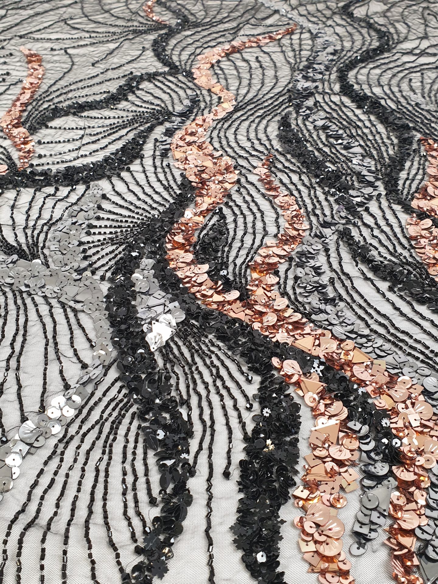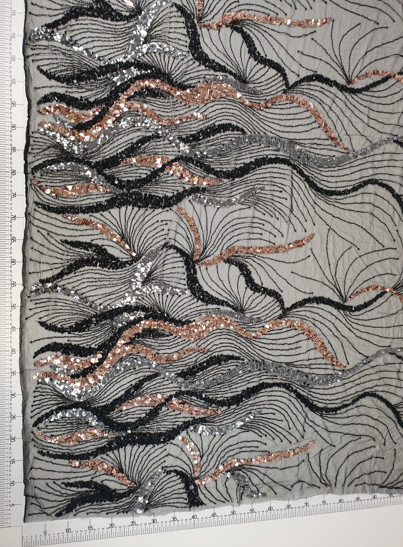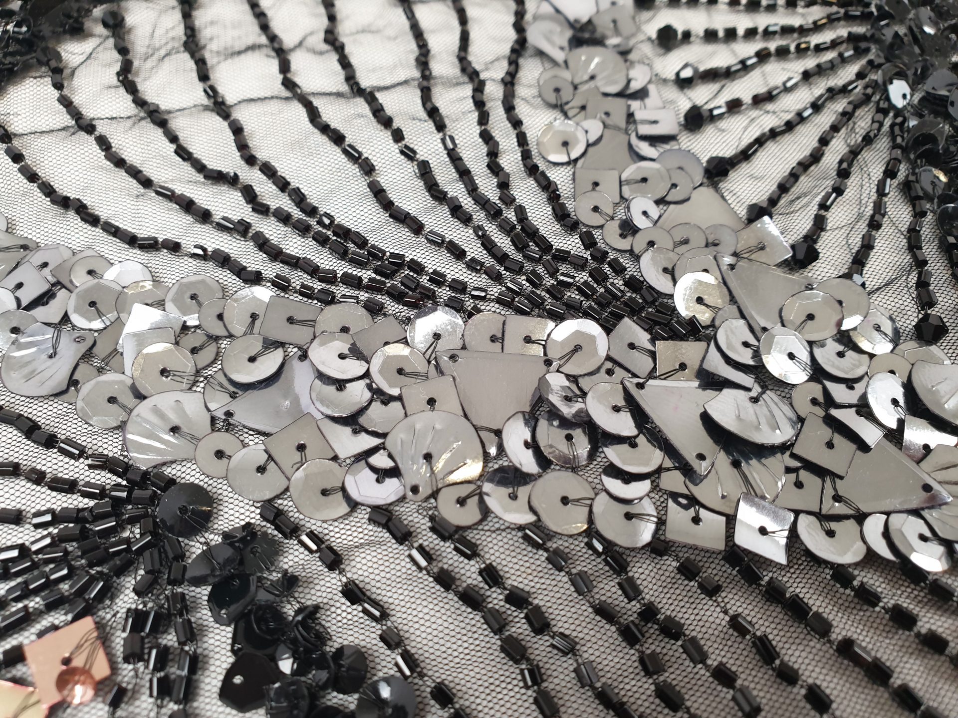 Broderie lucrata 100% manual, cu model realizat din margele, cristale in tonuri de aramiu si argintiu.