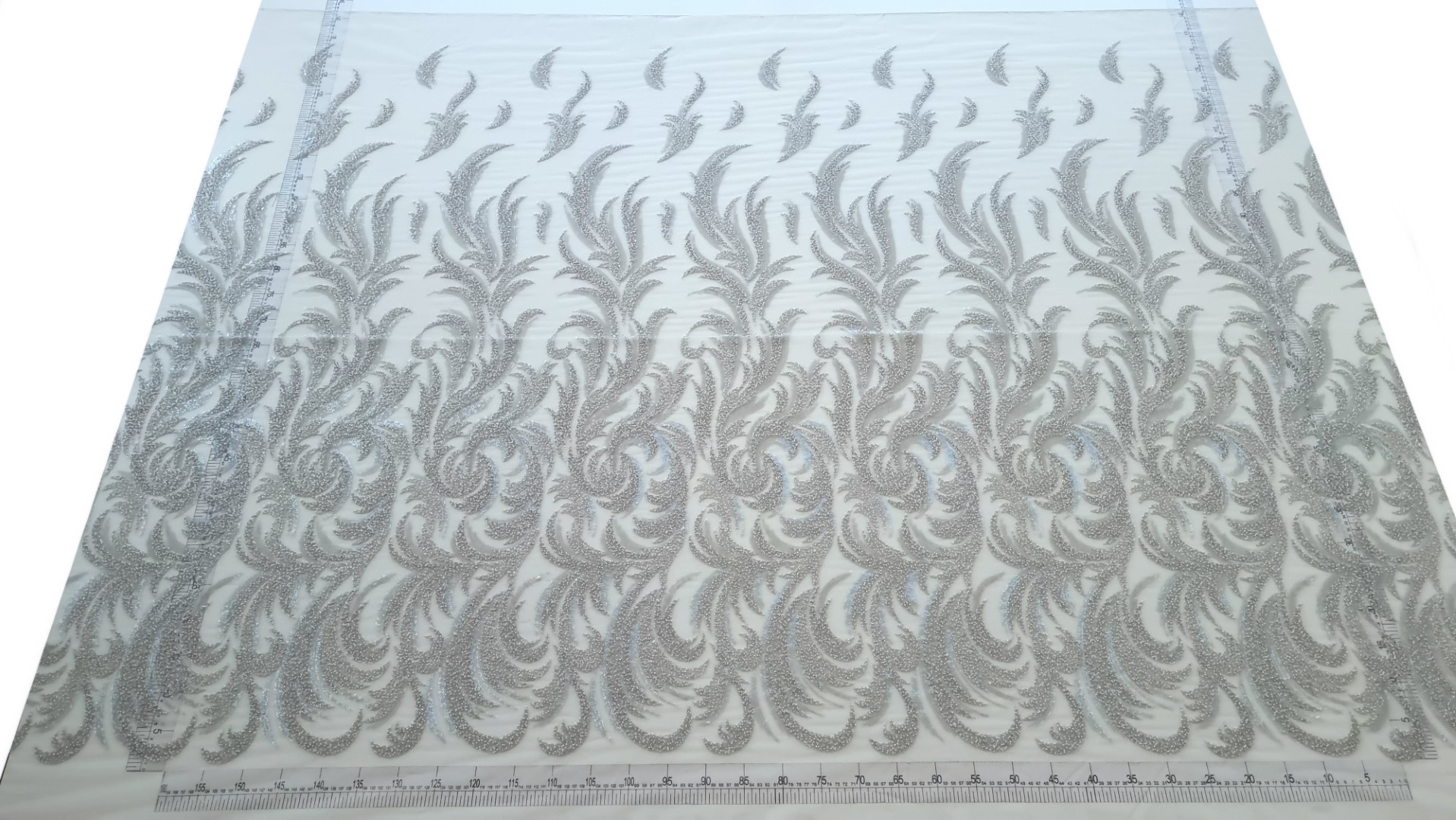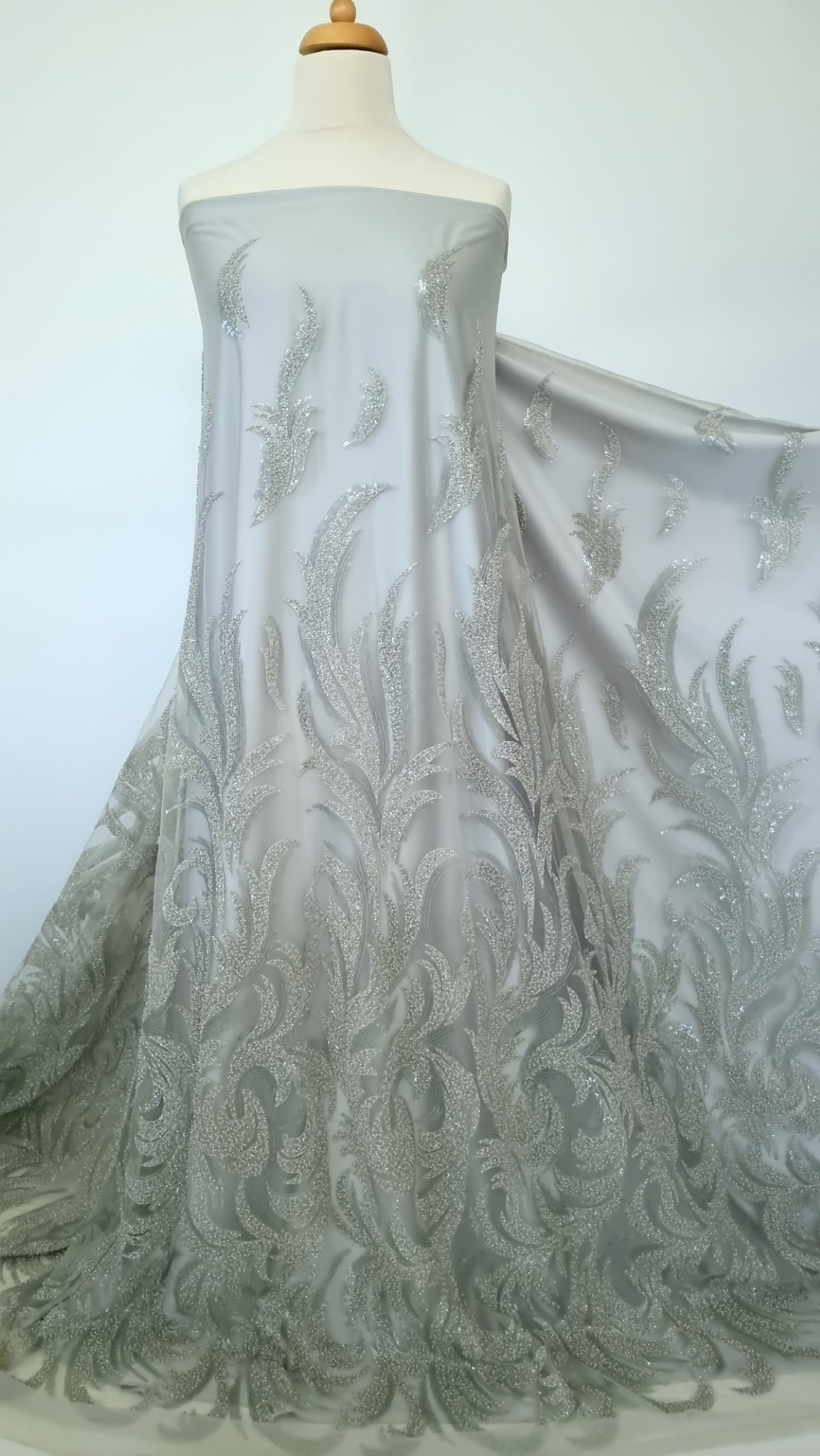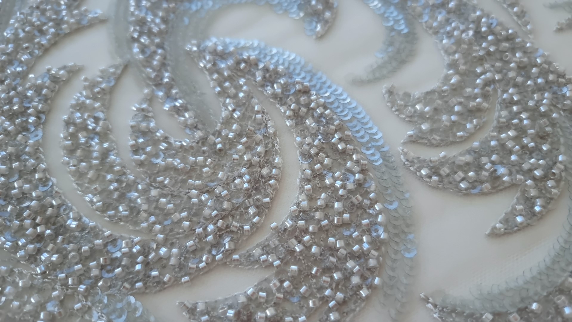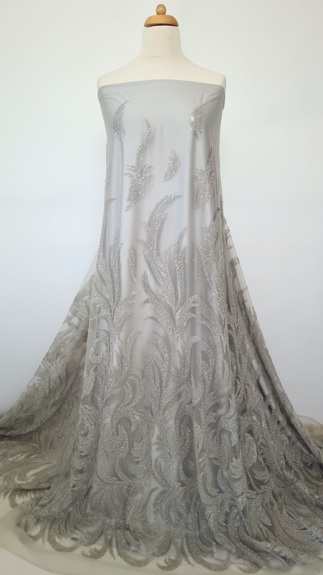Broderie grey accesorizata cu micropaiete si margele tubulare, cusute pe tulle gri deschis, usor elastic.
