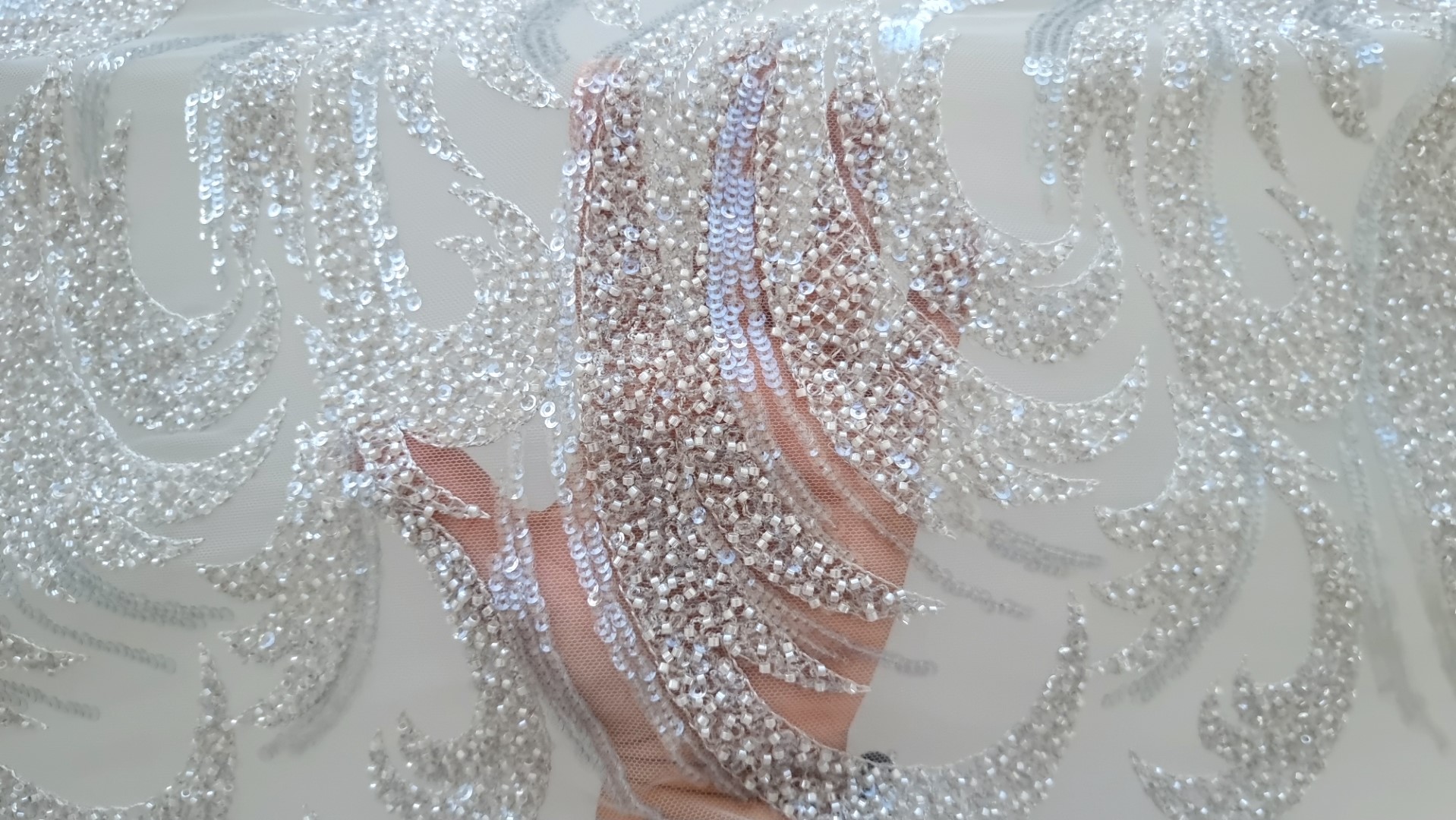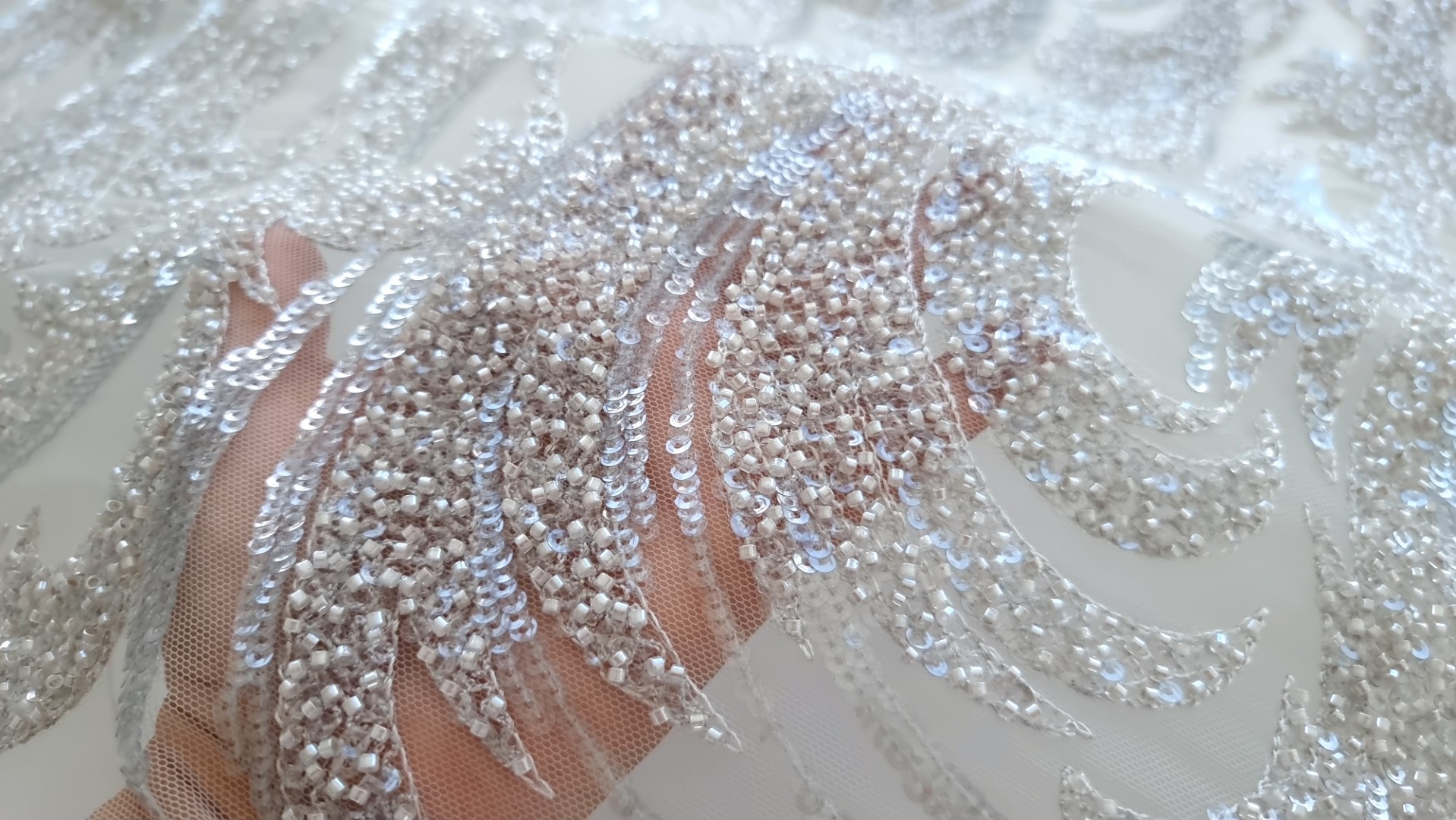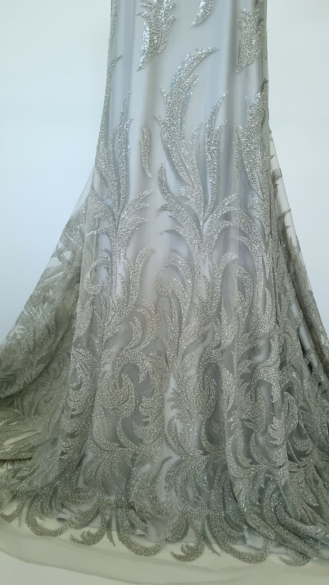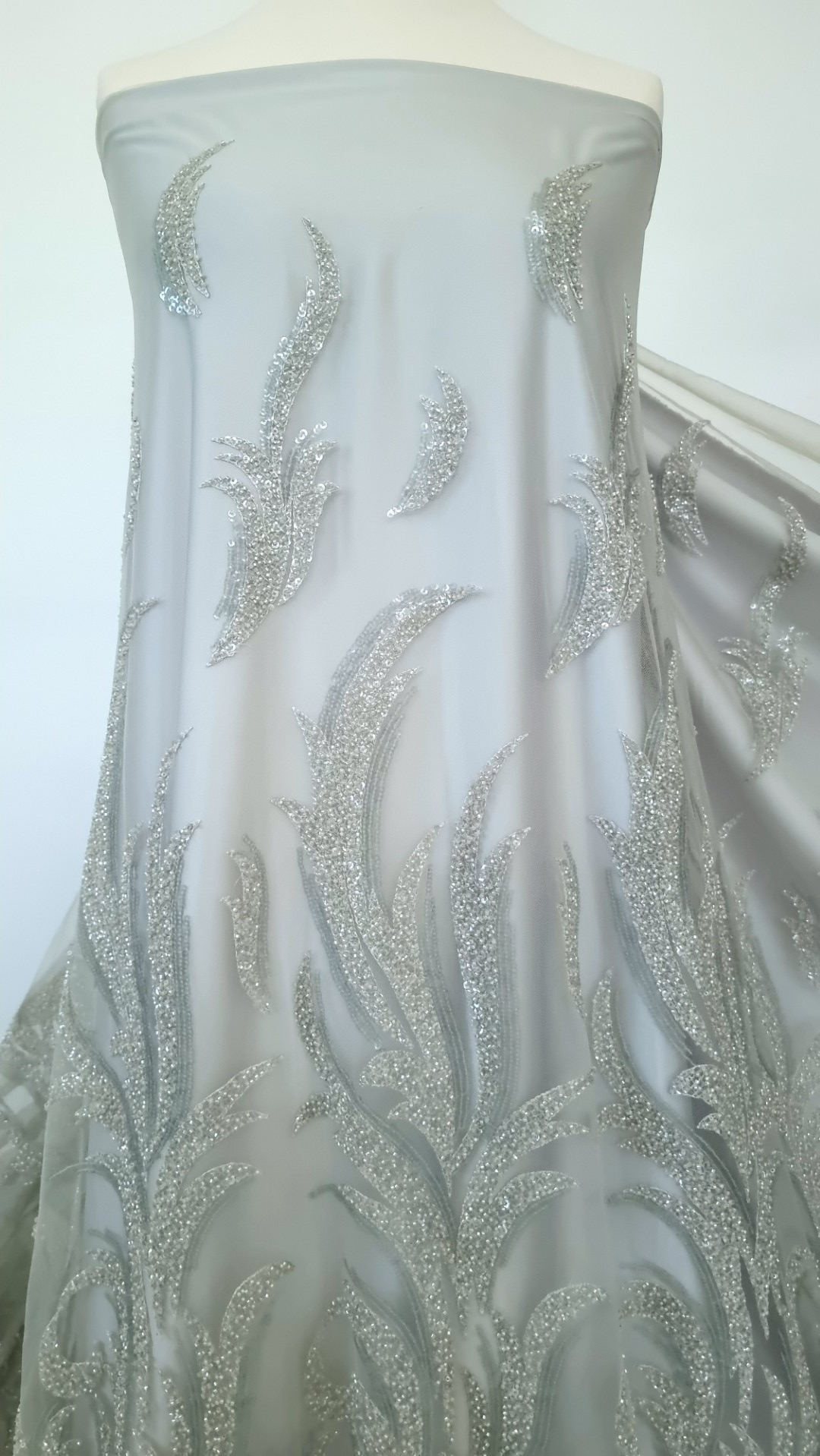 Broderie grey accesorizata cu micropaiete si margele tubulare, cusute pe tulle gri deschis, usor elastic.