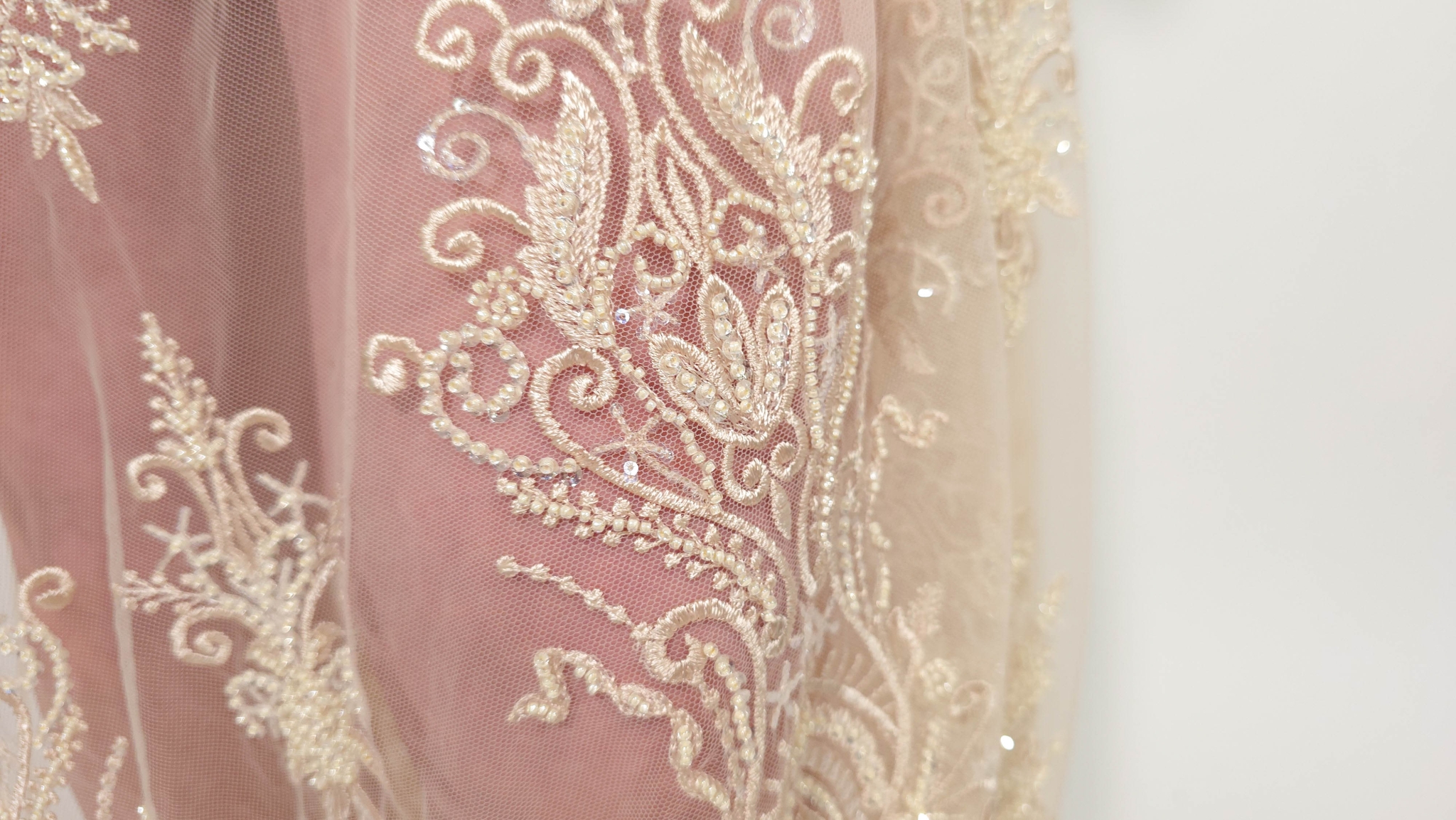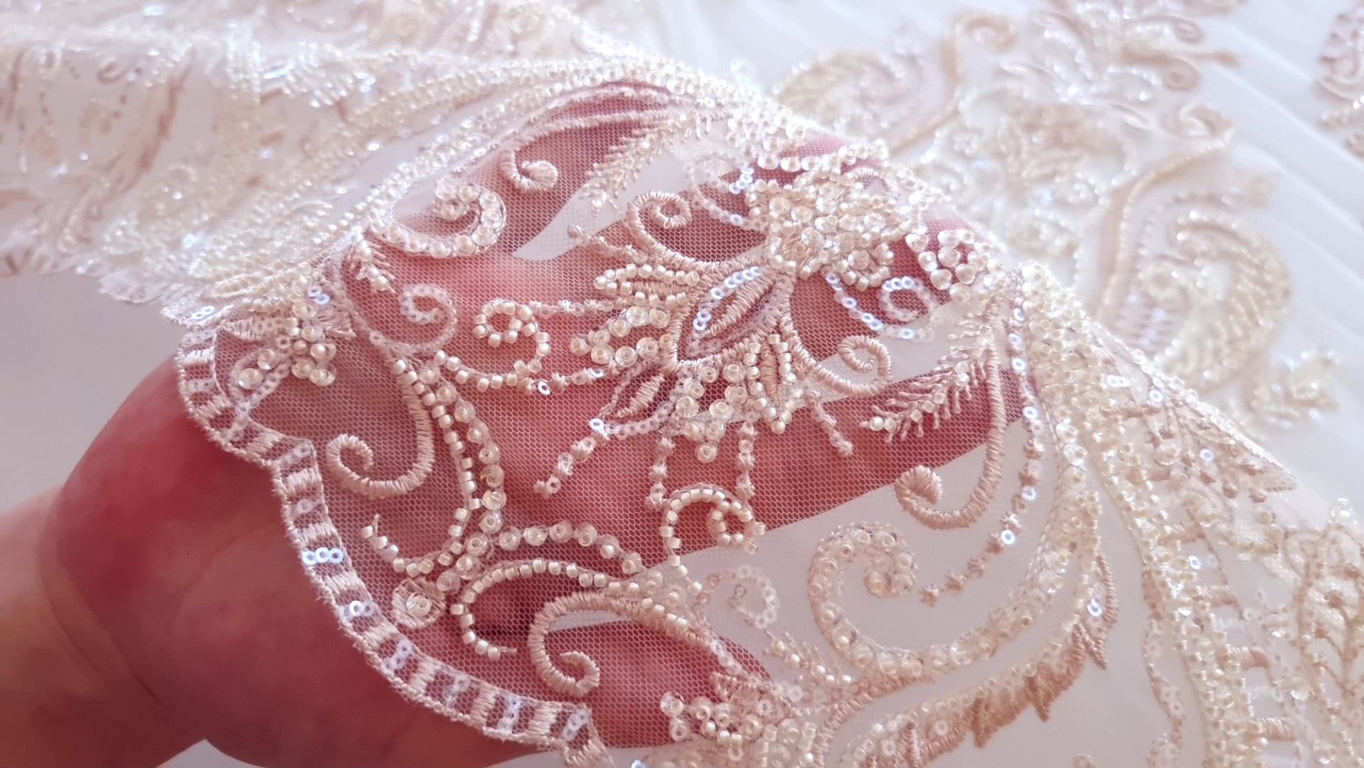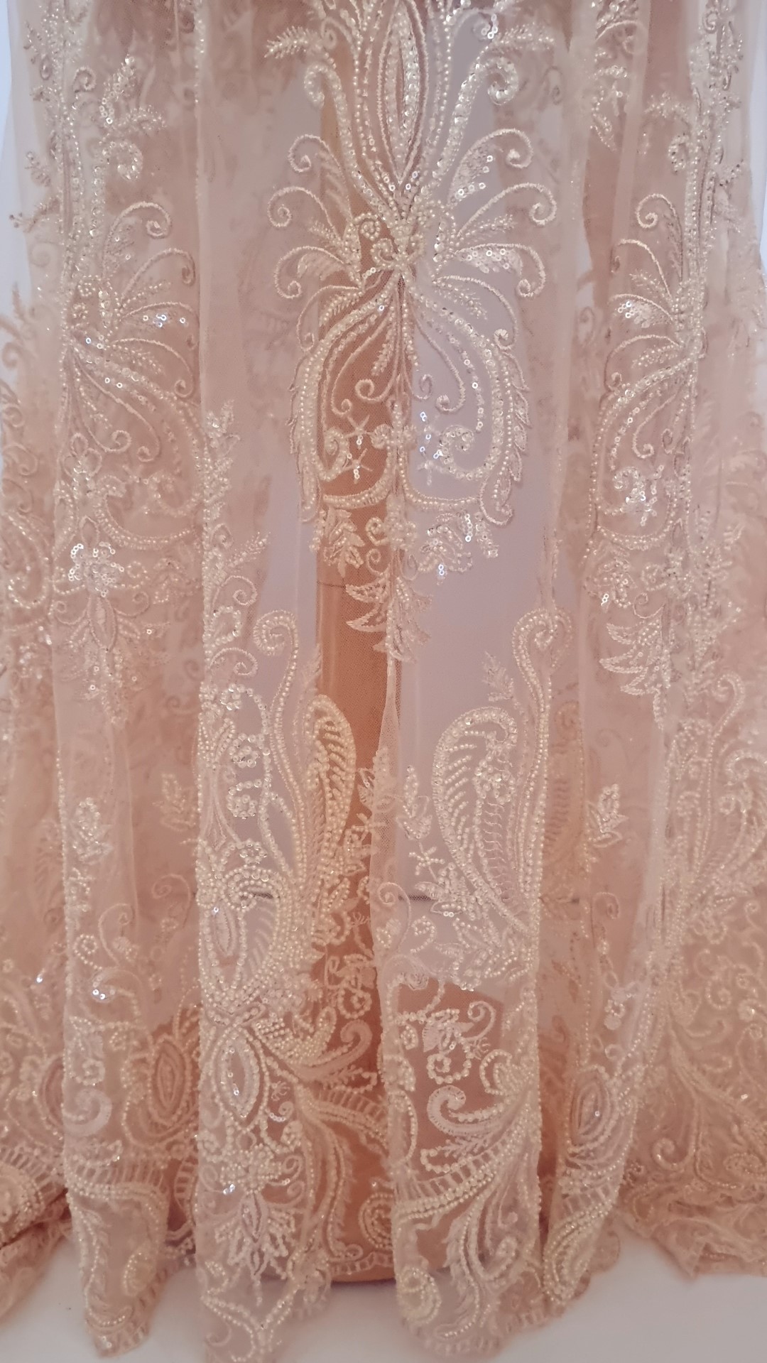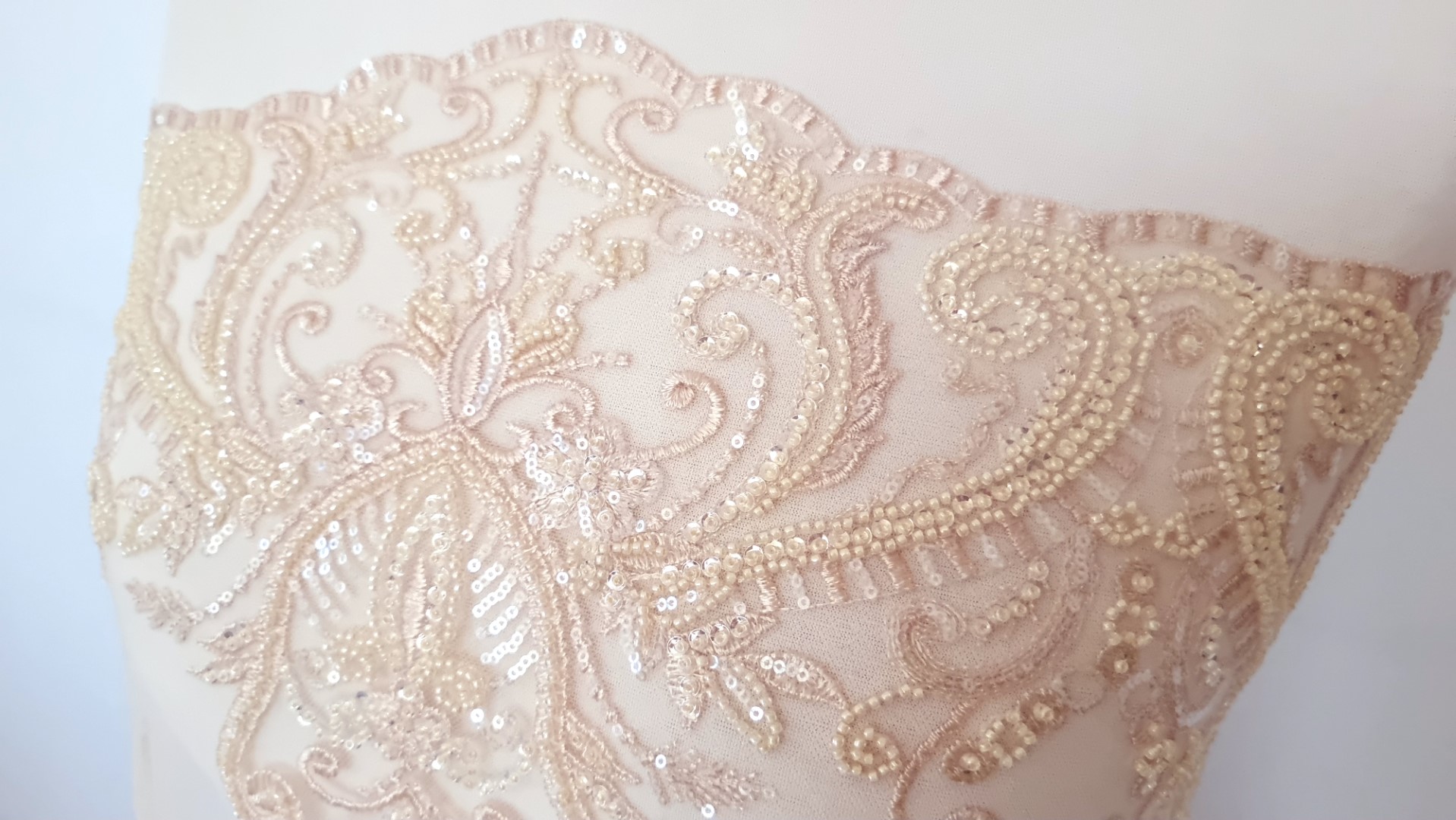 Broderie nude pink accesorizata cu micropaiete de diferite dimensiuni si margele tubulare cusute pe tulle nude, usor elastic.
