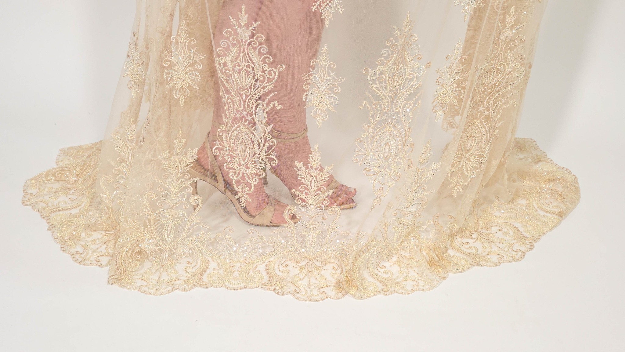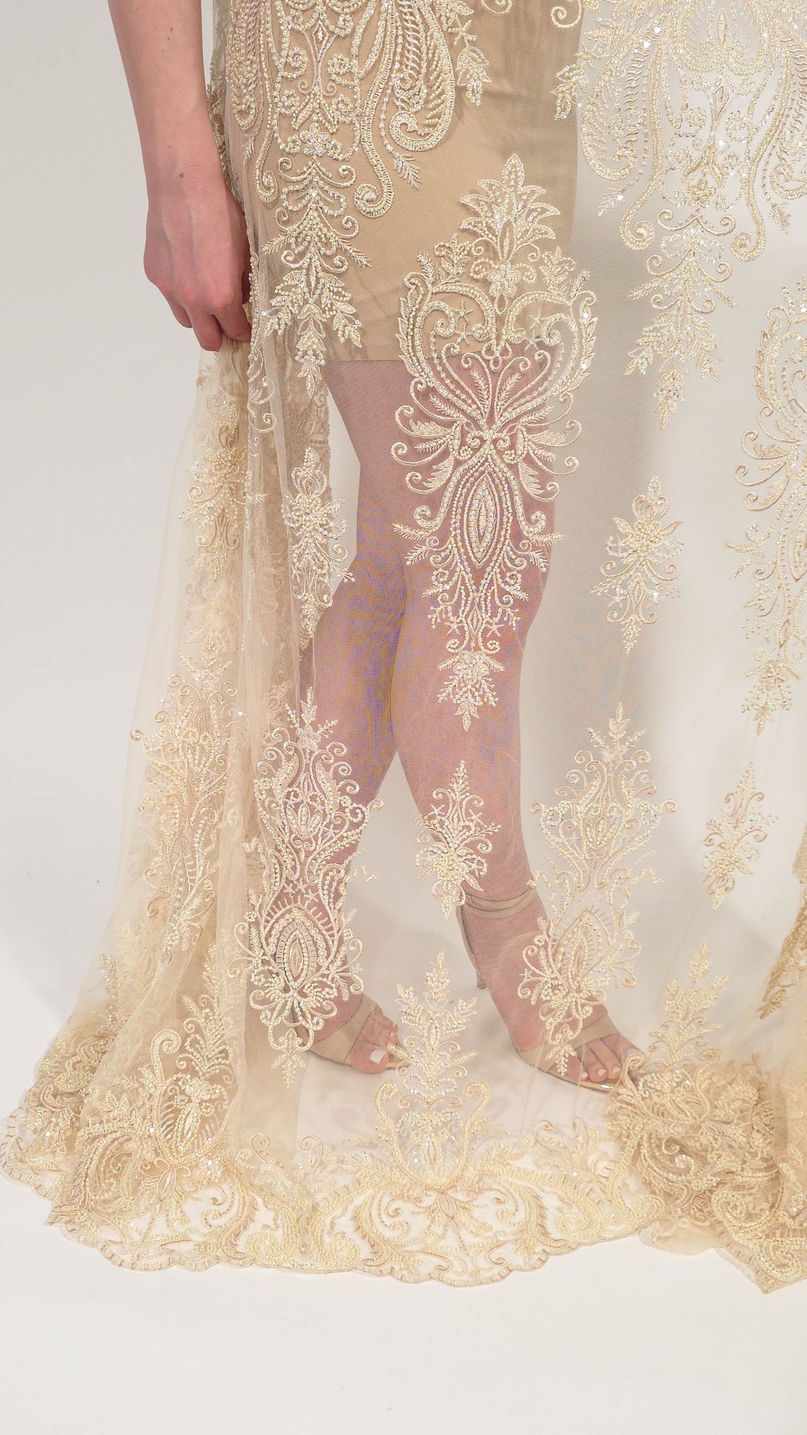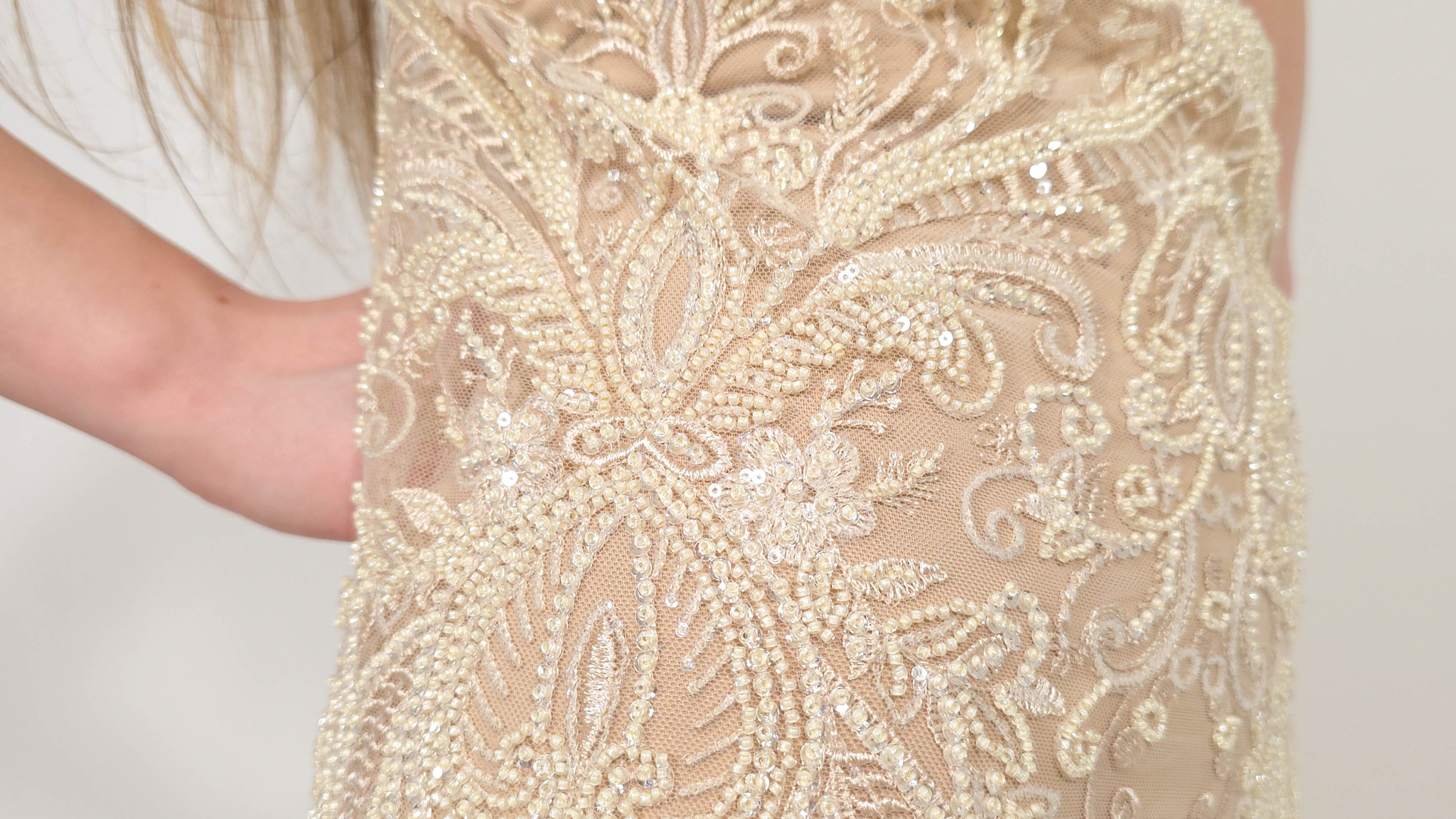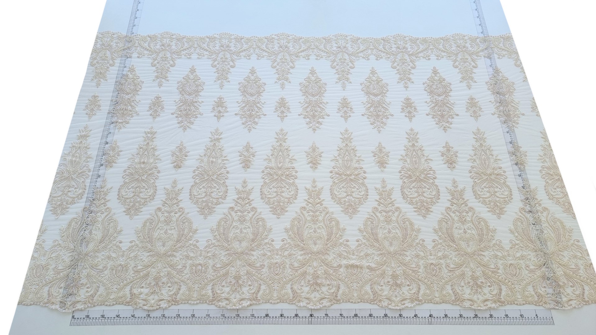 Broderie nude pink accesorizata cu micropaiete de diferite dimensiuni si margele tubulare cusute pe tulle nude, usor elastic.