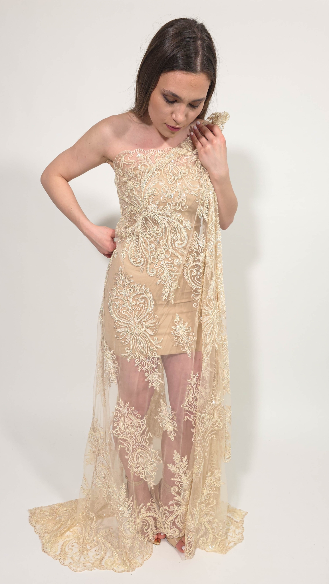 Accesoriile sunt dispuse pe intreaga suprafata a broderiei si creeaza un aspect luminos si spectaculos tinutei.