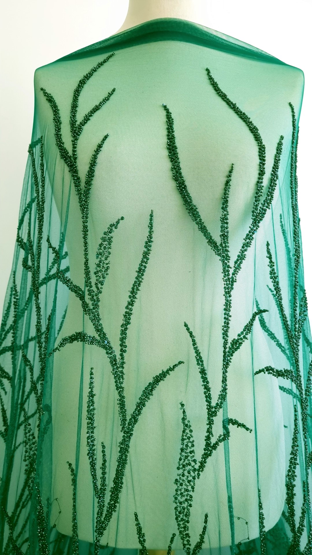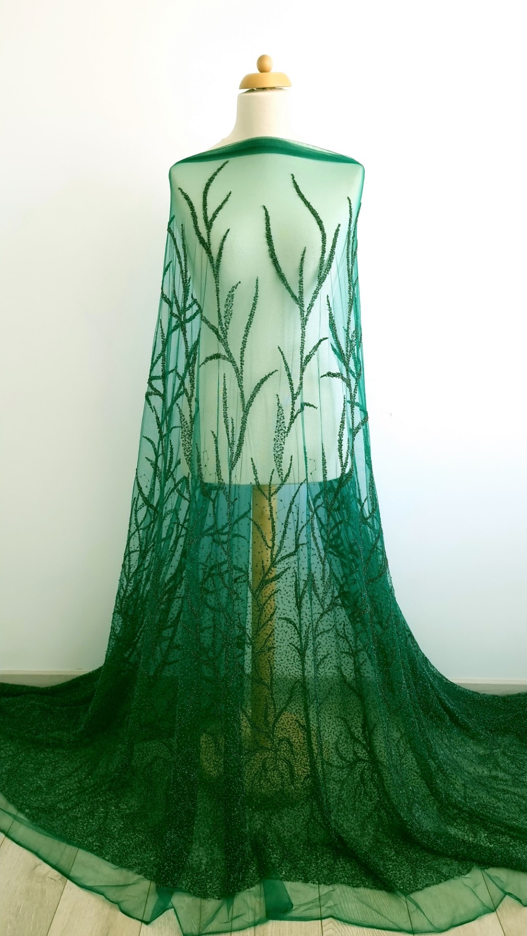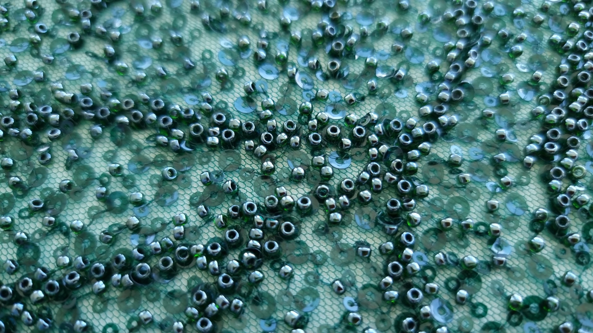 Broderie verde inchis accesorizata cu micropaiete de diferite dimensiuni si margele tubulare cusute pe tulle in acelasi ton cu broderia, usor elastic.
