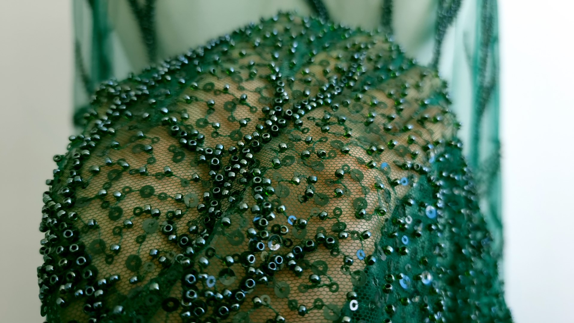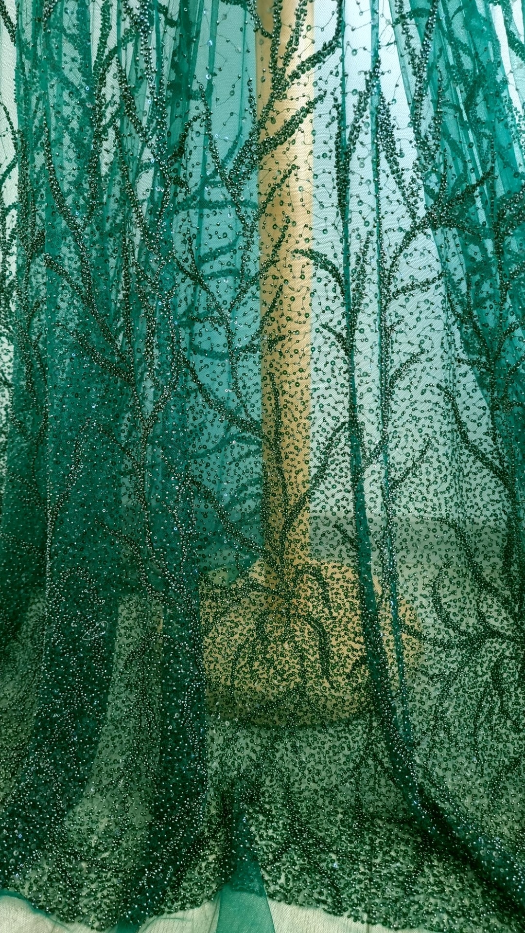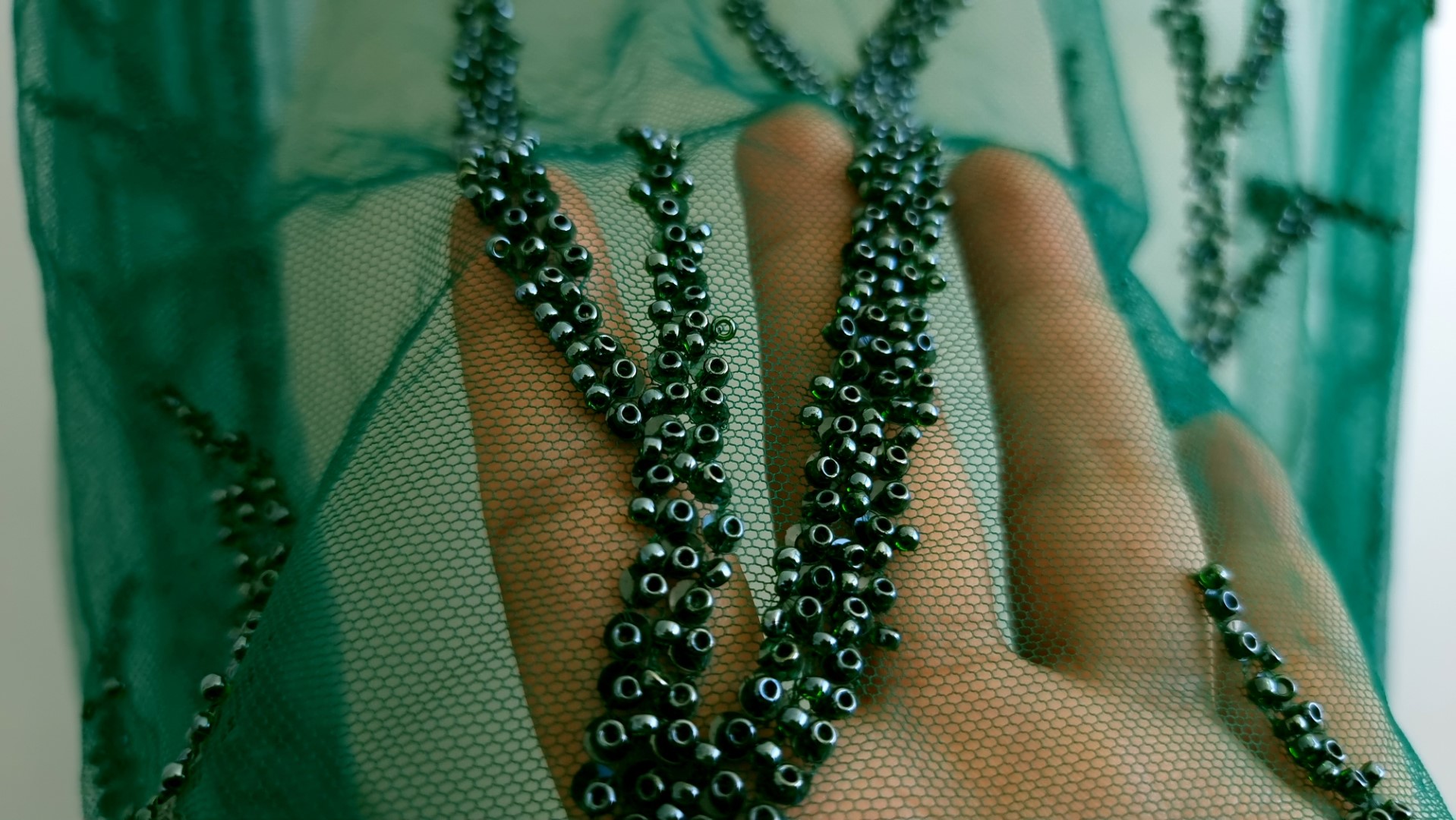 Broderie verde inchis accesorizata cu micropaiete de diferite dimensiuni si margele tubulare cusute pe tulle in acelasi ton cu broderia, usor elastic.