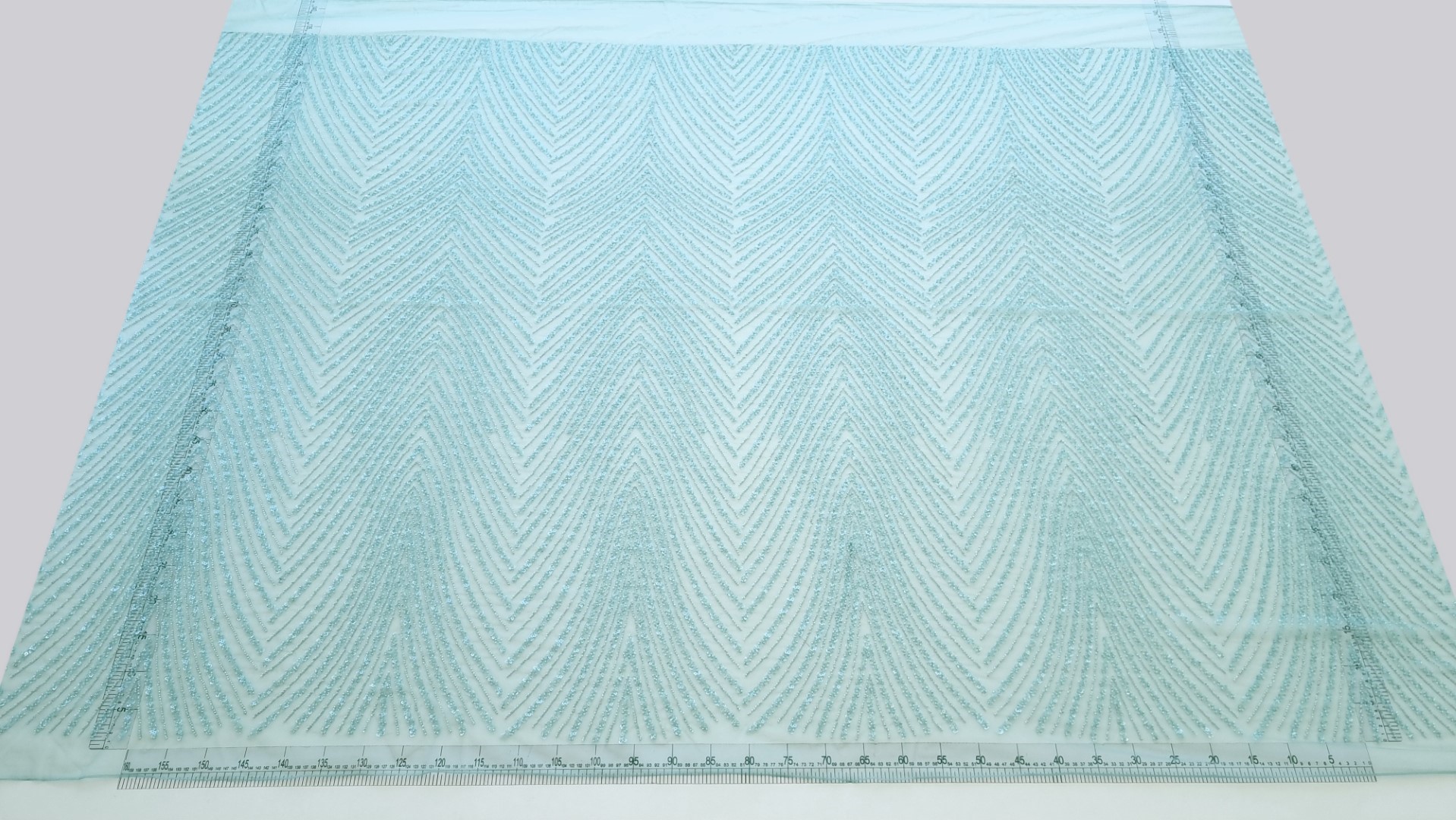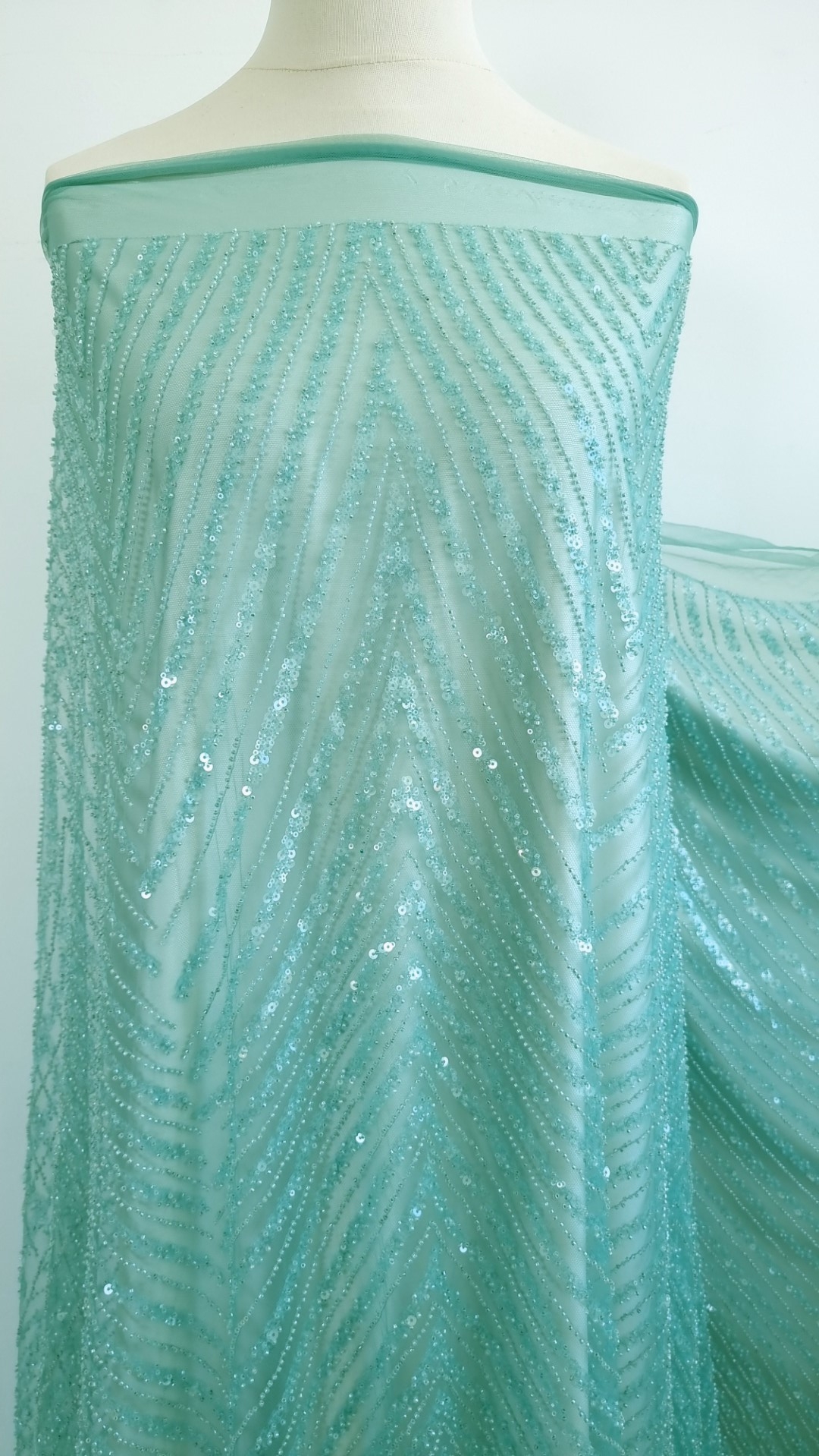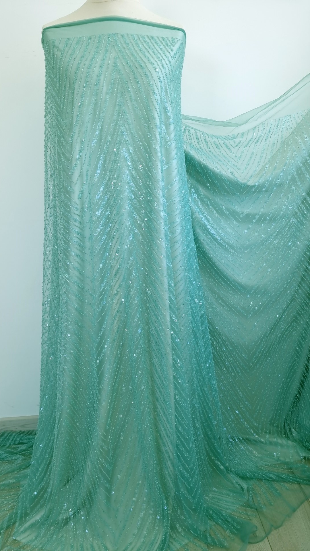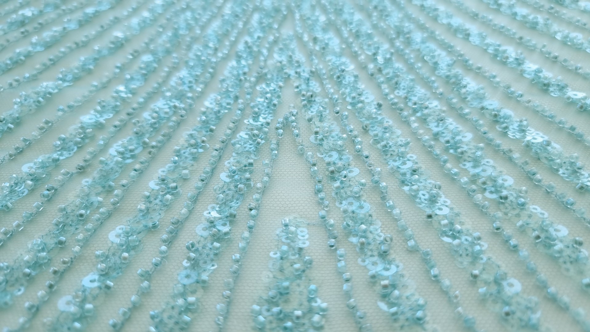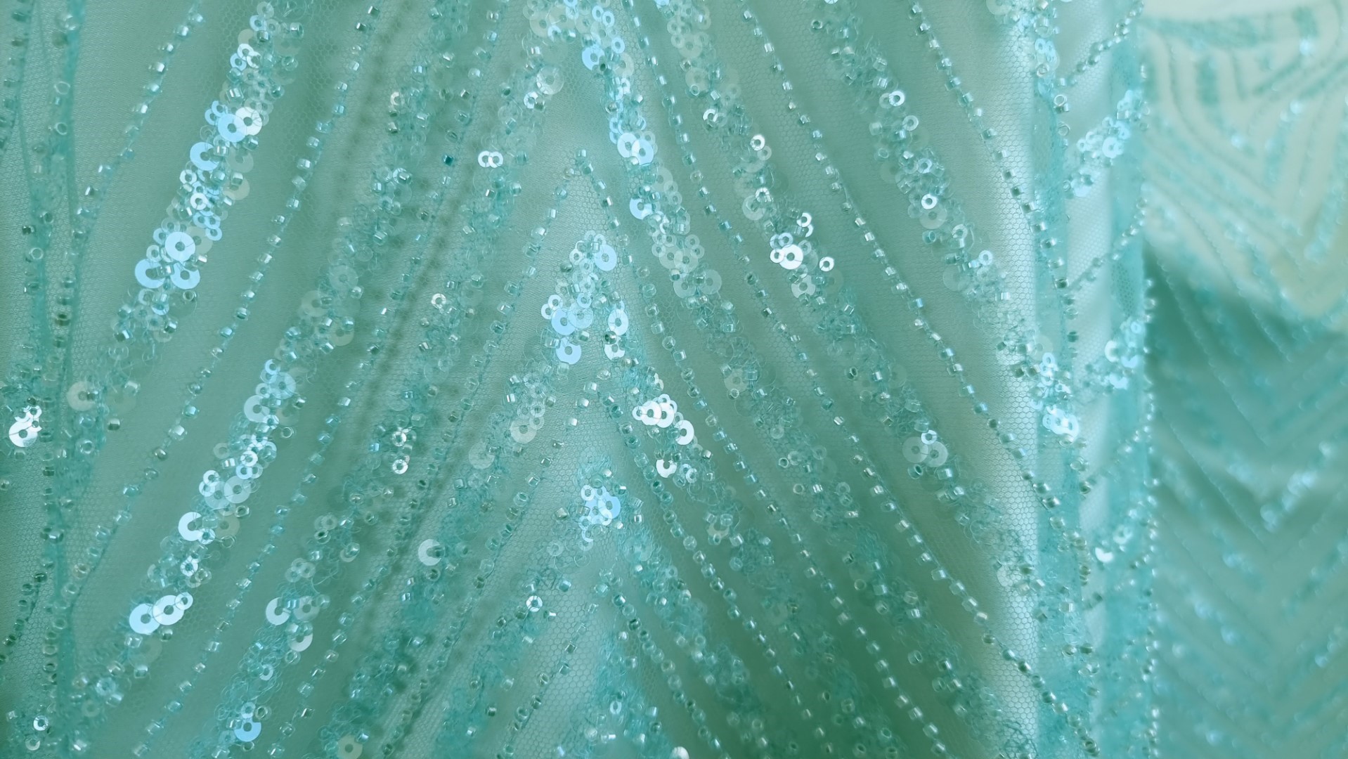 Broderie verde turcoaz accesorizata, cu micropaiete transparente si margele tubulare verde deschis, cusute pe baza de tulle verde deschis, usor elastic.
