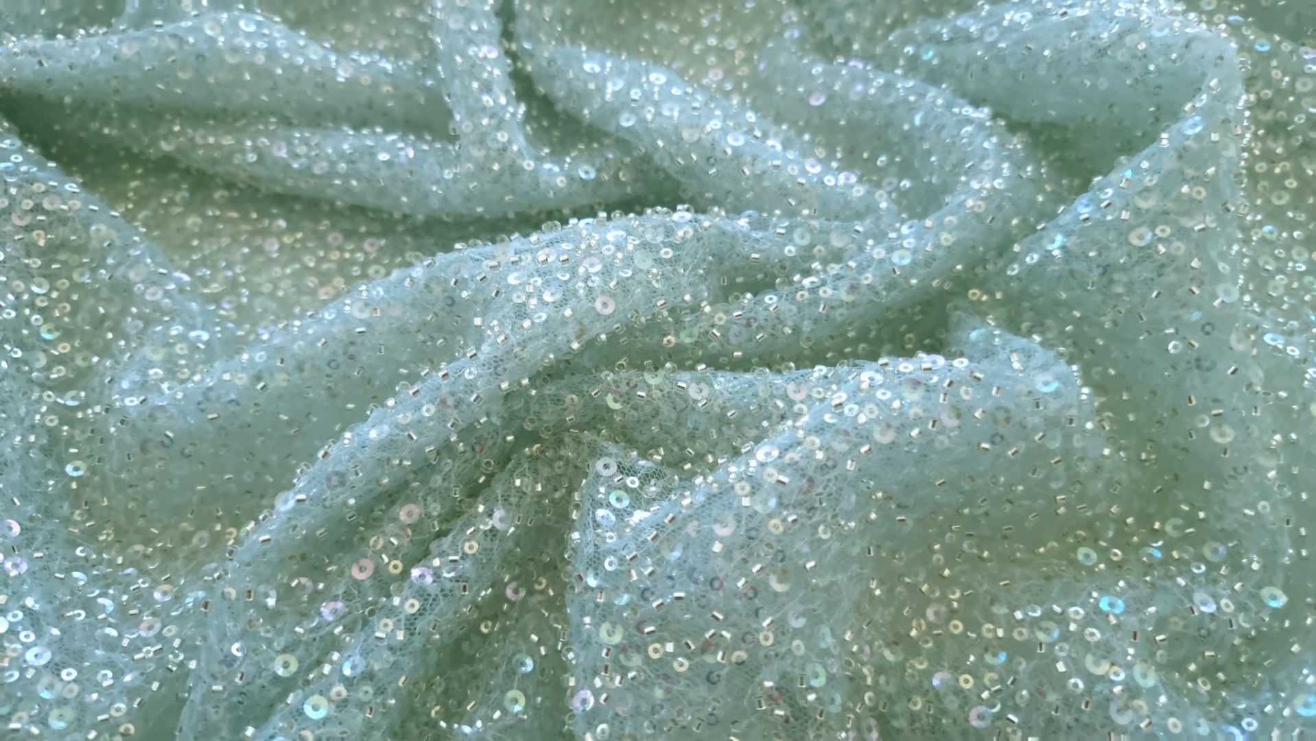 Dantela accesorizata Minty Green, cusute pe baza din tulle usor elastic, de culoare verde pal.