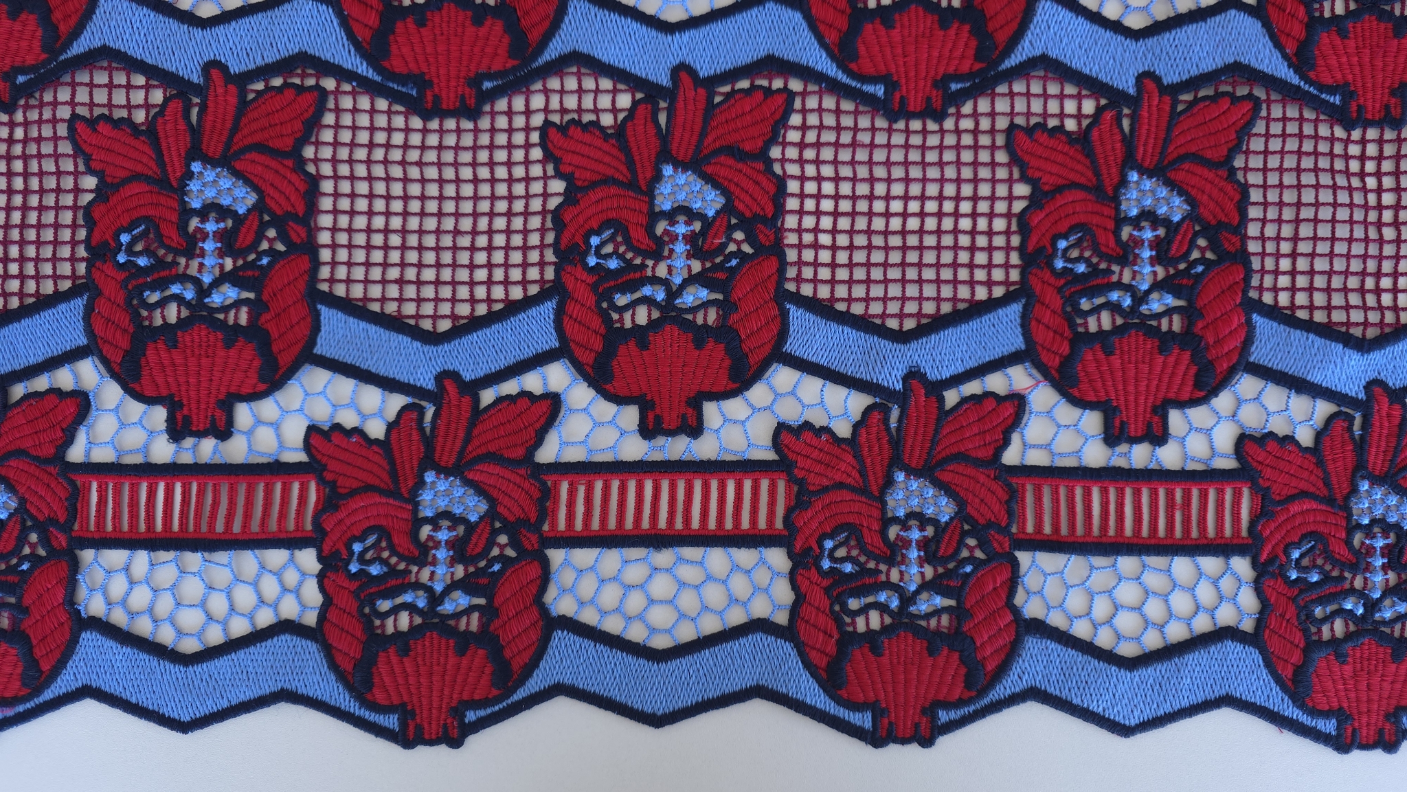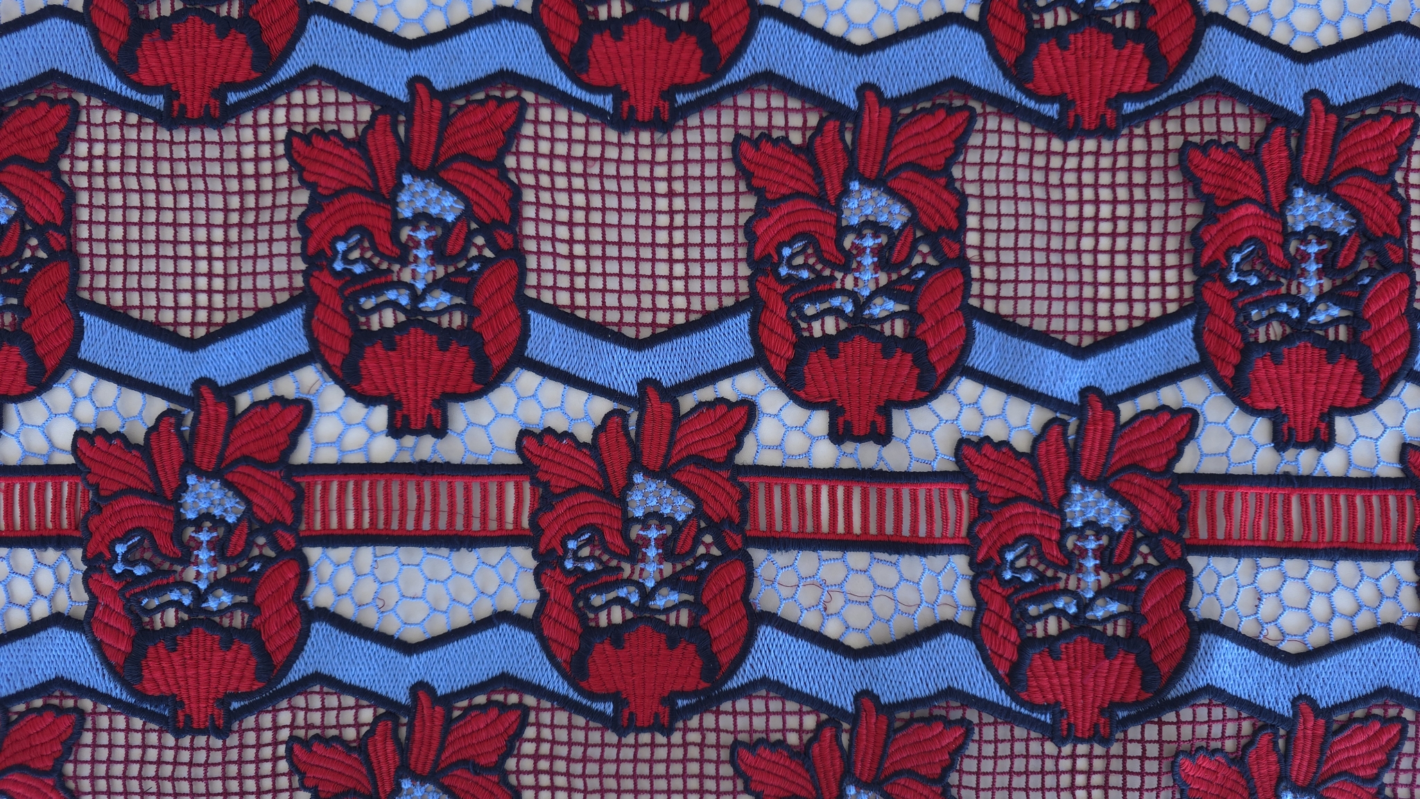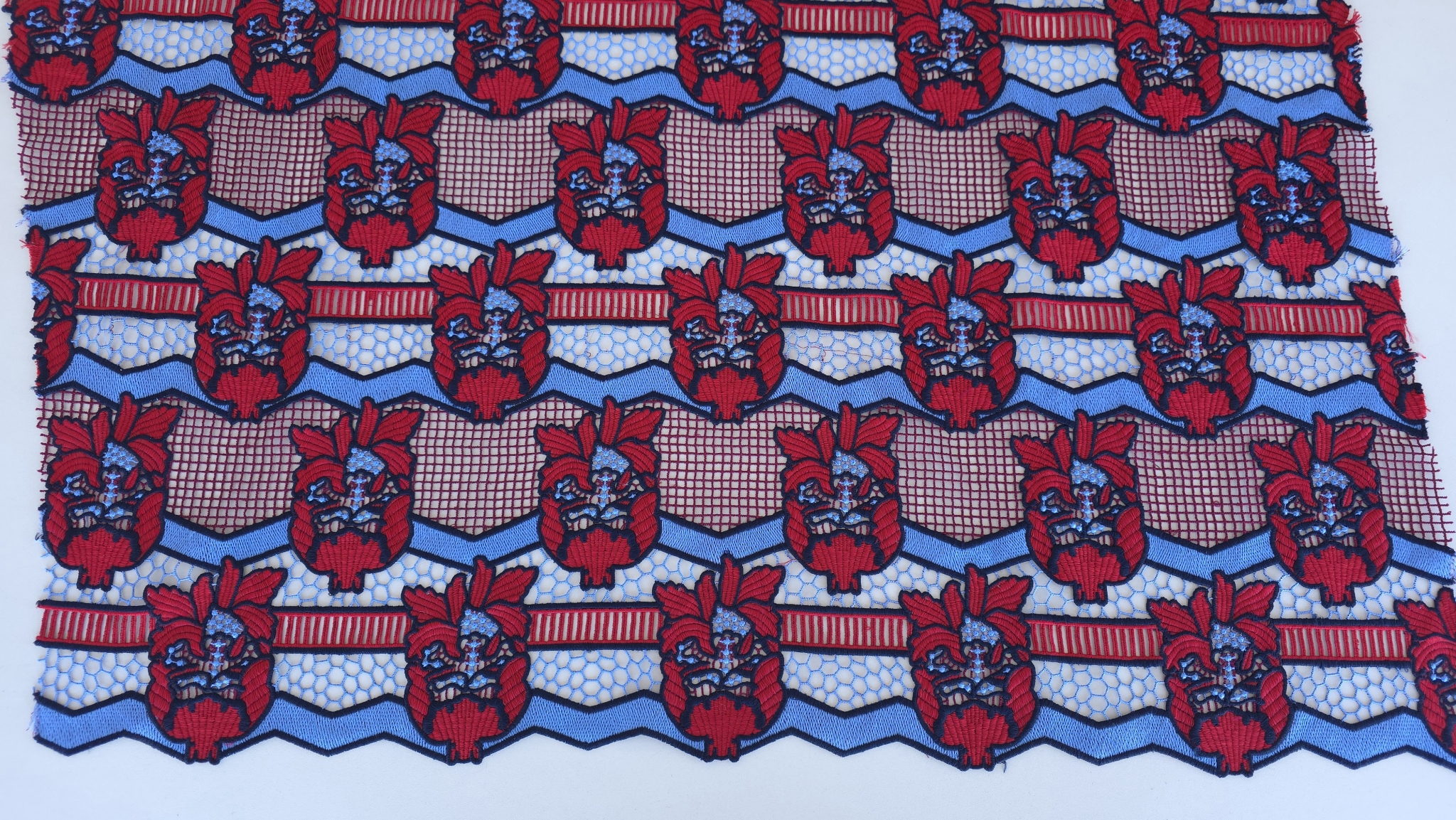 Dantela cu bordura rosu-albastru pune in evidenta contrastul dintre zonele rosii brodate plin si suprafetele albastre ajurate, repetate pe toata latimea materialului.