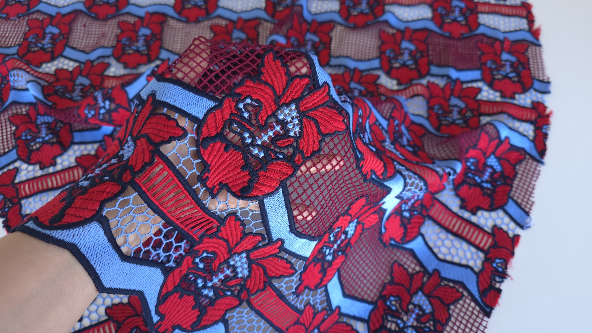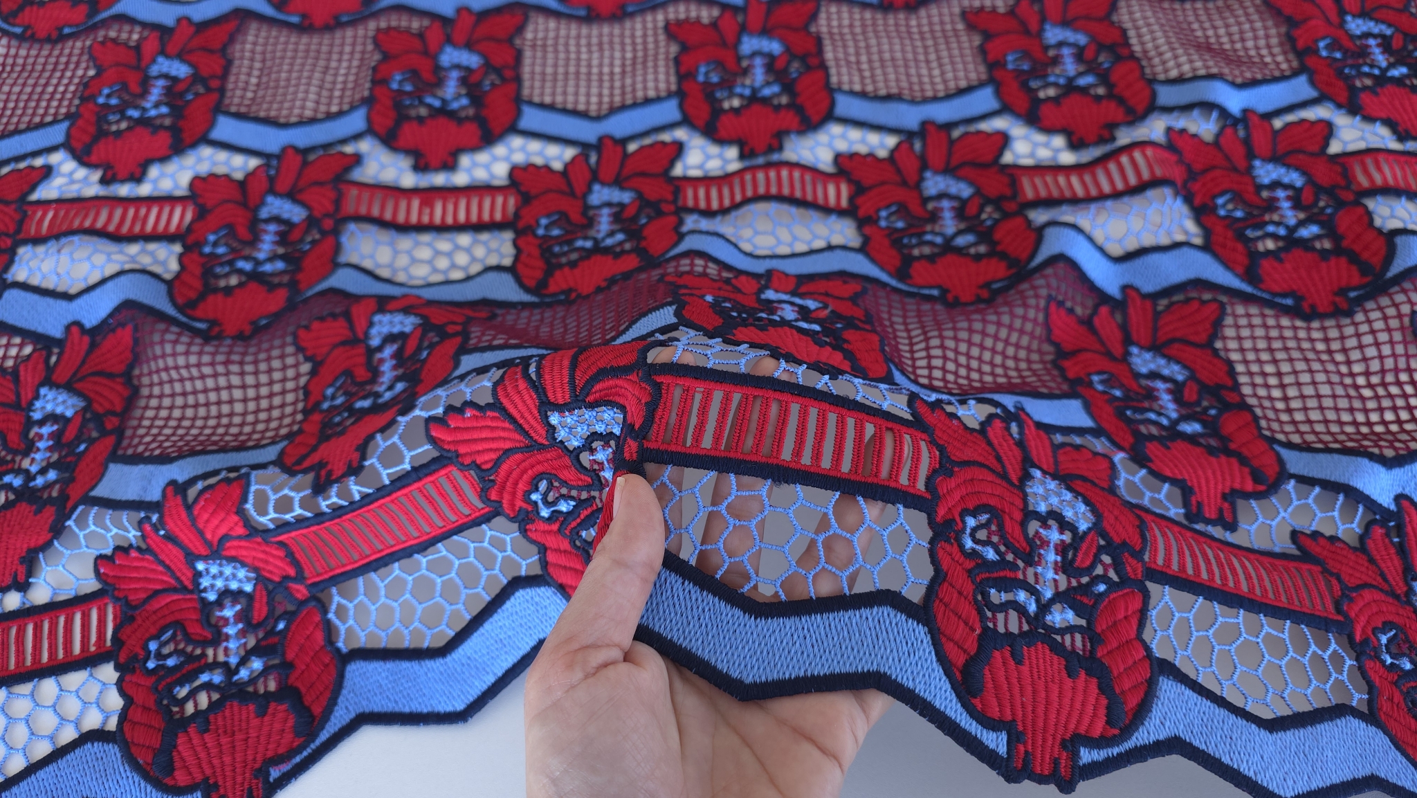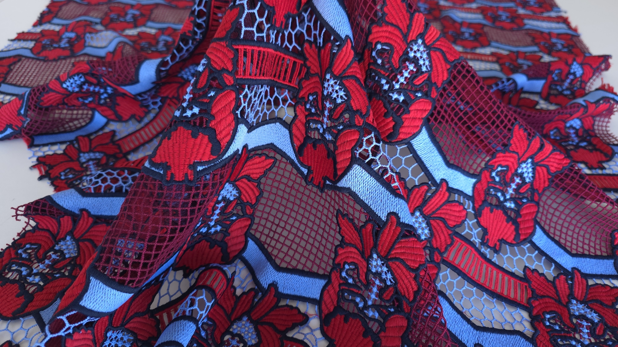 Broderia are margini bine definite in ton inchis, ceea ce accentueaza liniile fiecarui motiv. Datorita bordurilor lucrate pe ambele laturi, dantela broderie rosu albastru poate fi folosita cu marginile ca tiv gata finisat pentru rochii, fuste sau maneci, fara ajustari suplimentare.