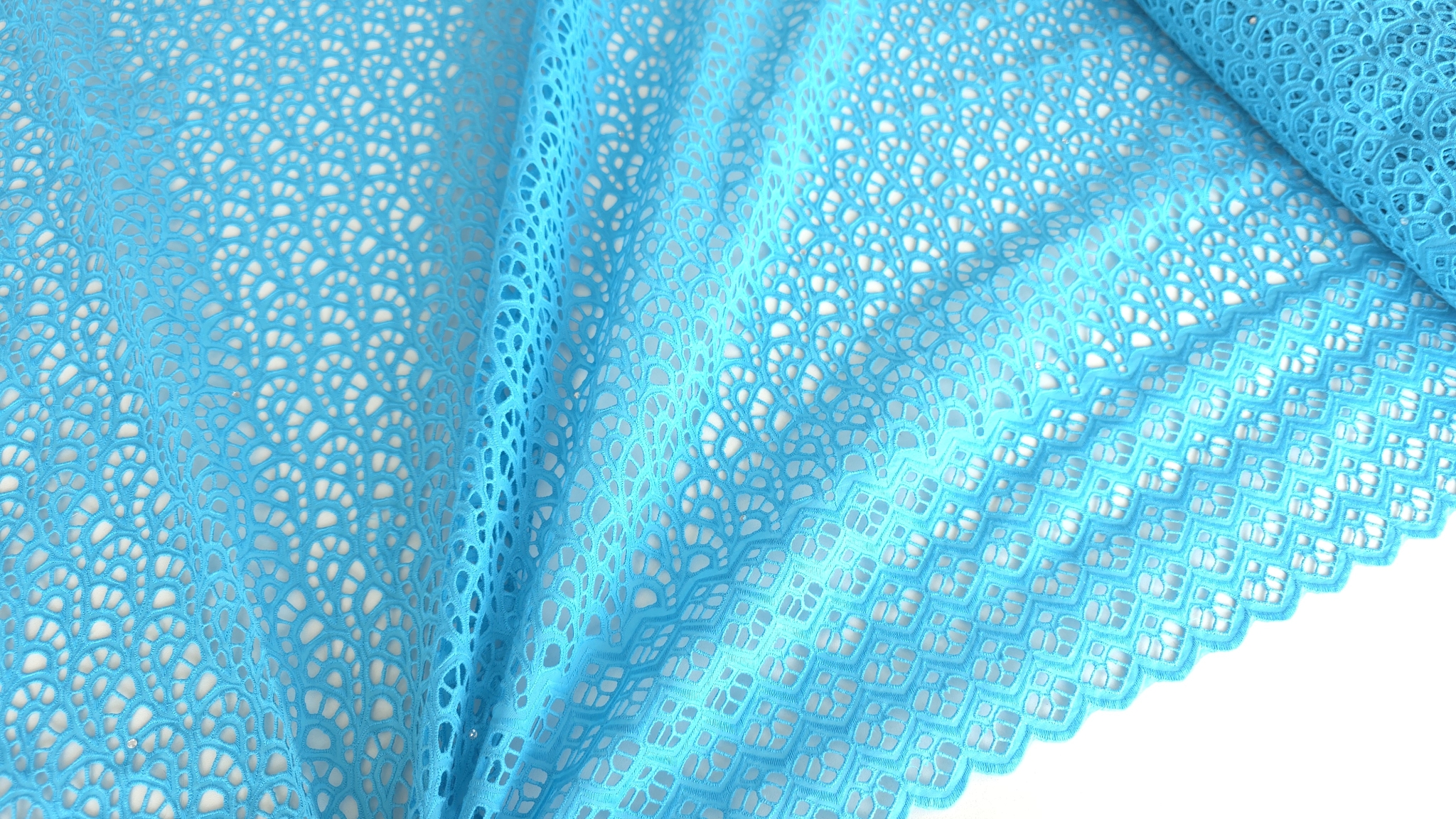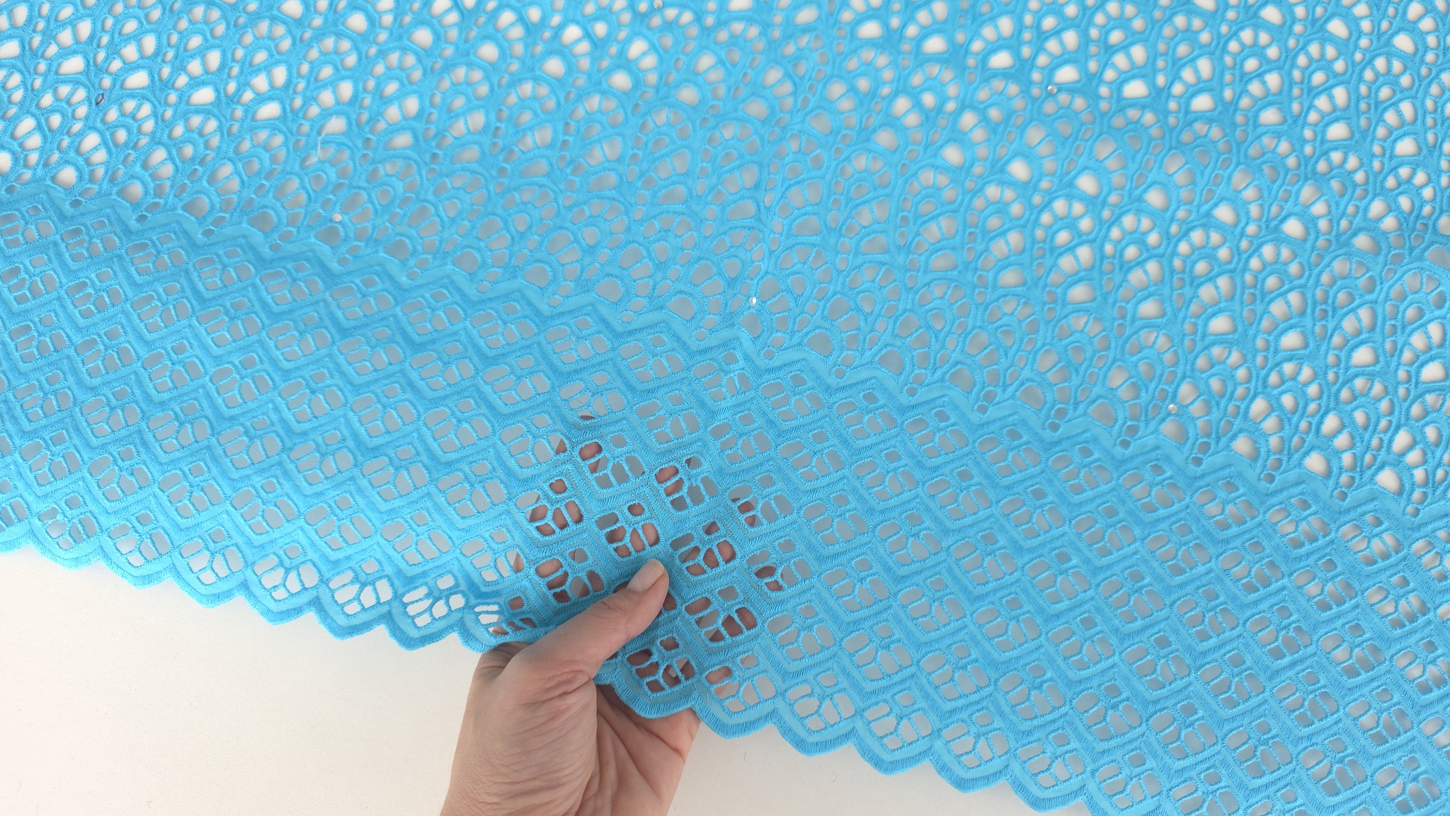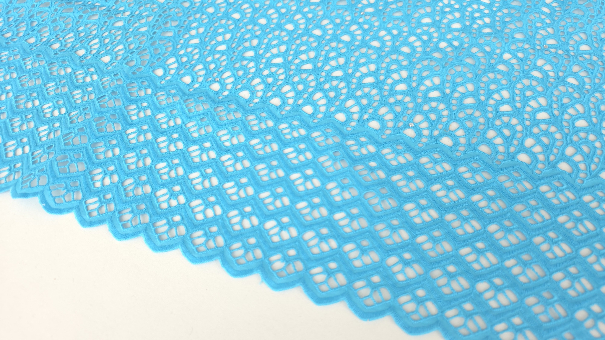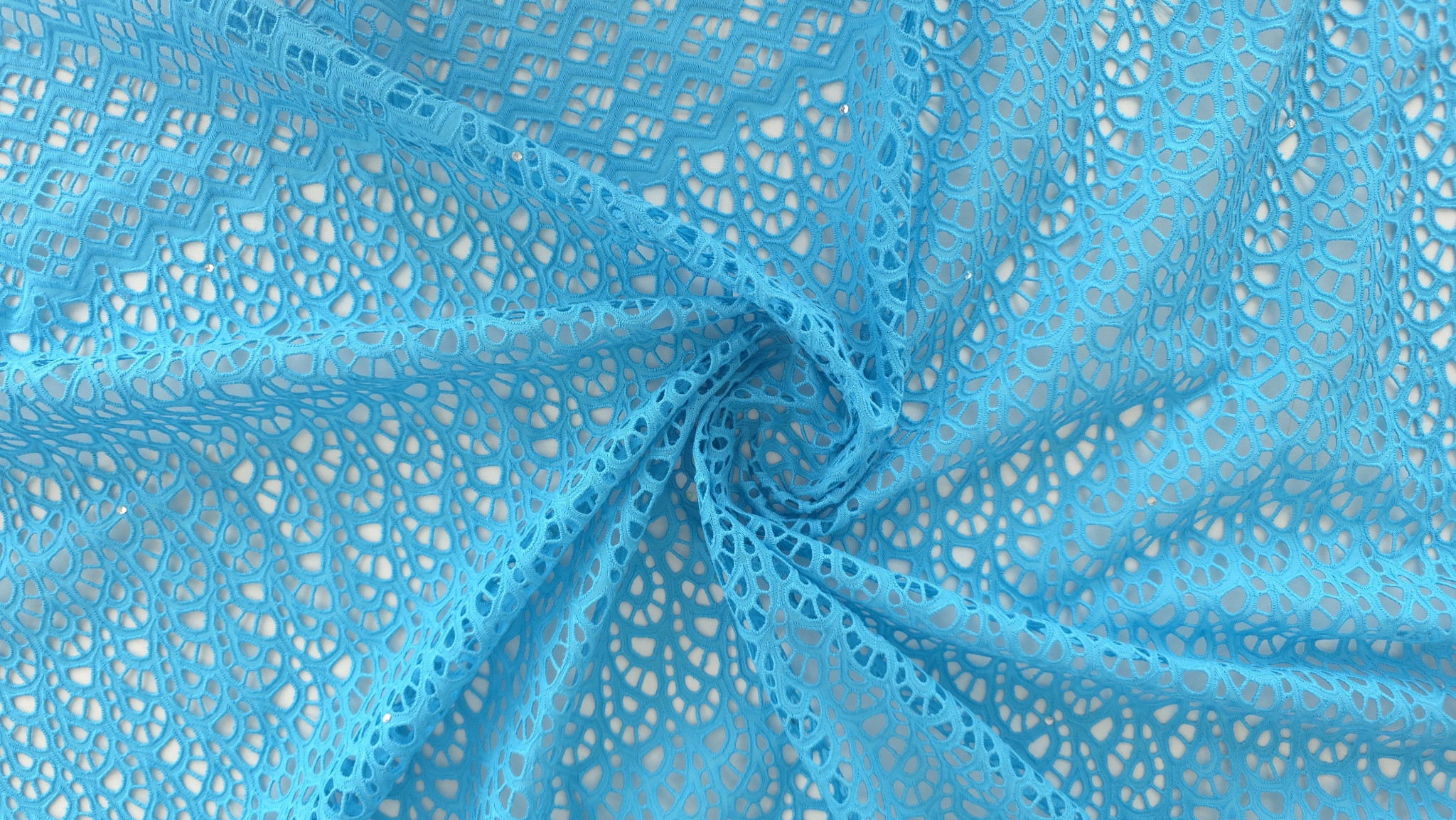 Sangallo turcoaz spartă cu cristale din bumbac este un material din 100% bumbac natural, cu broderie densă în relief și perforații deschise pe toată suprafața. Cristalele mici sunt lipite individual între motivele brodate și captează lumina discret.