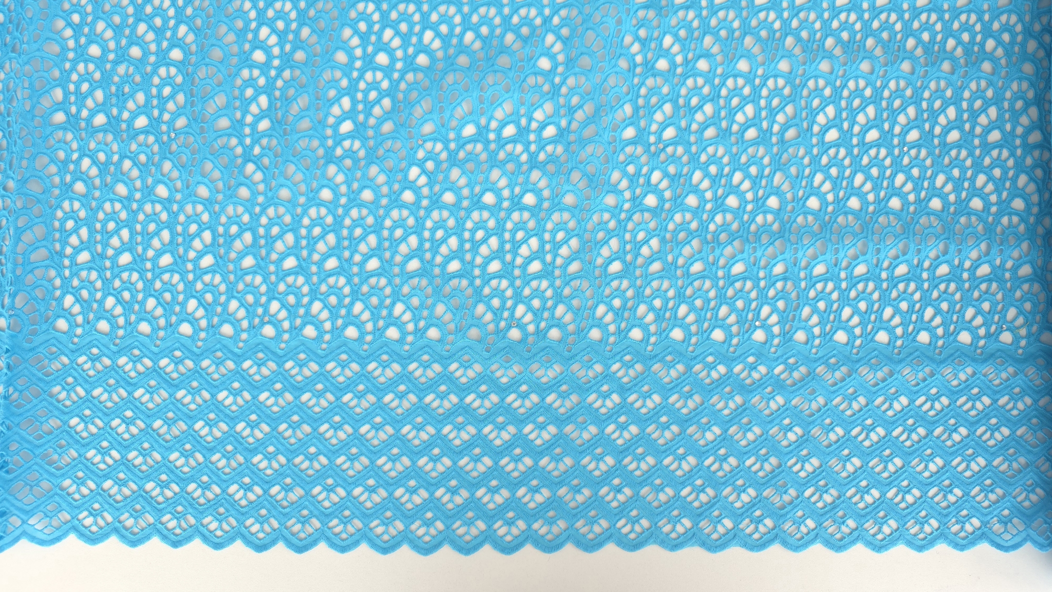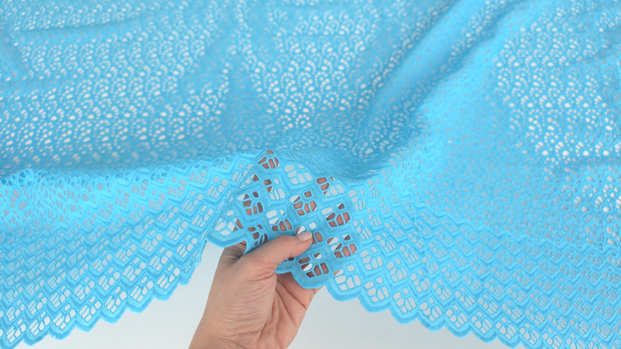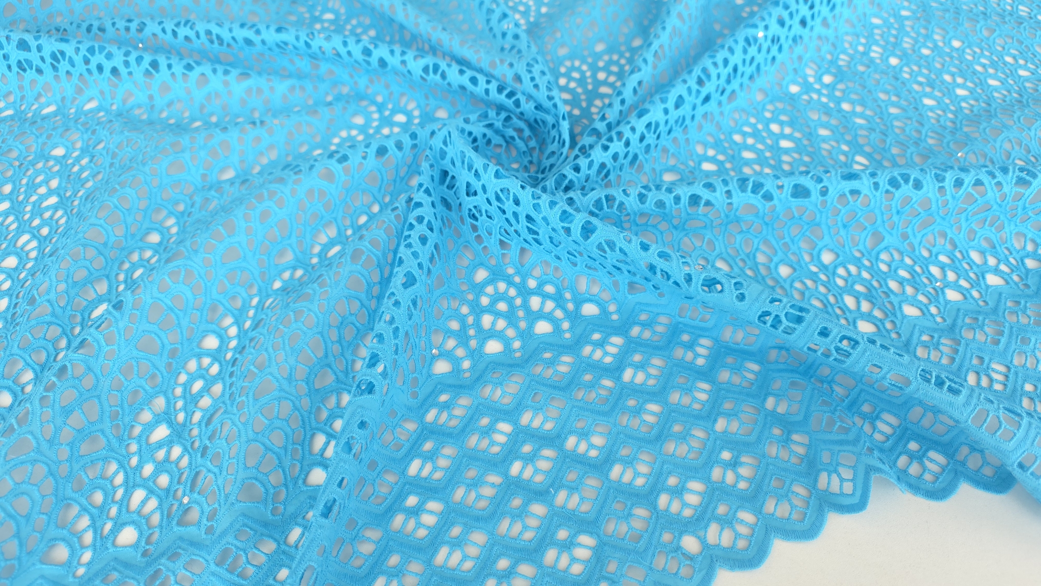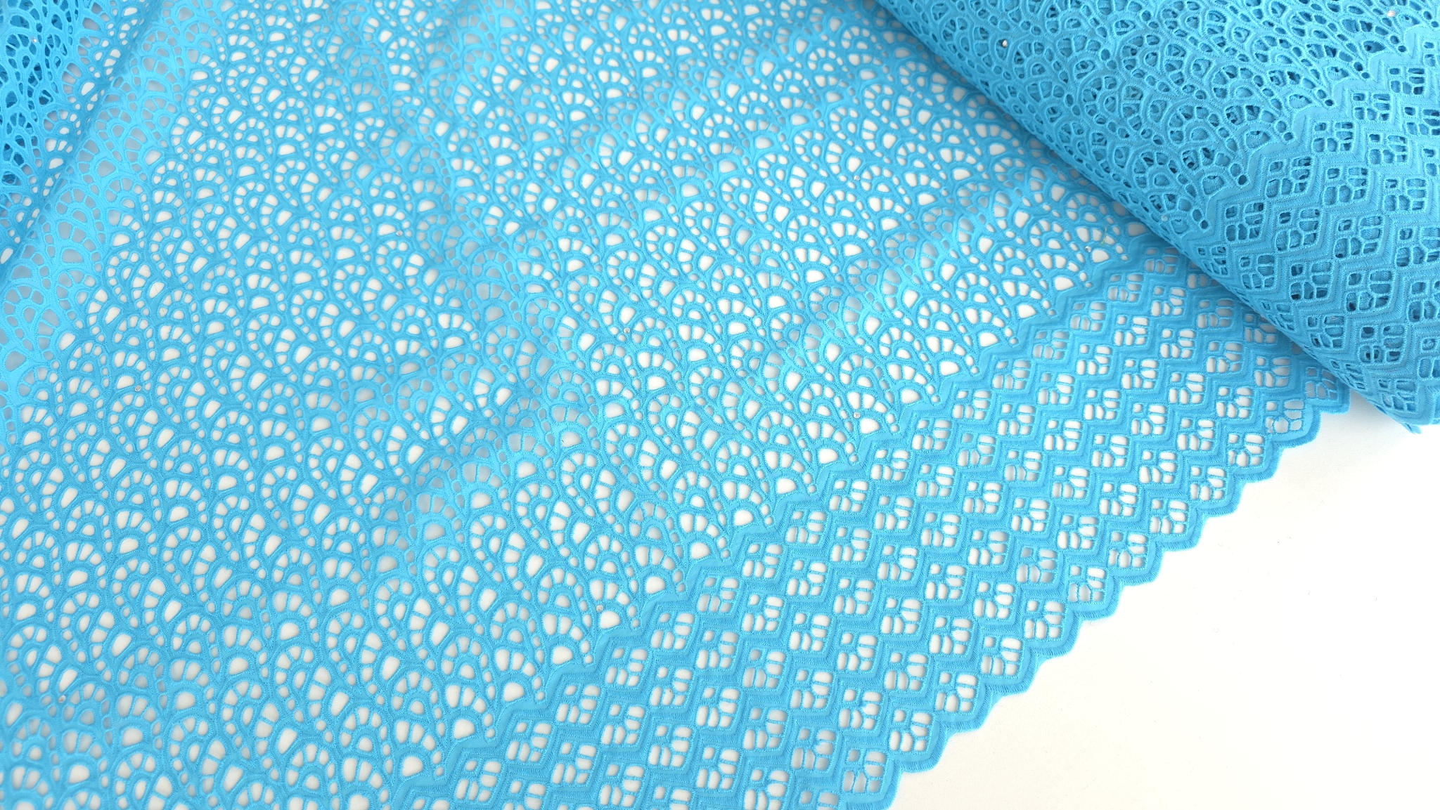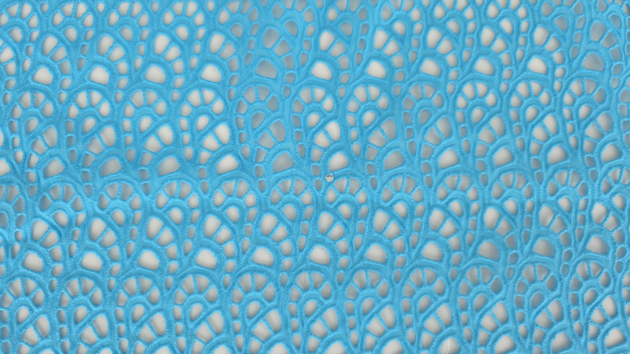 Sangallo turcoaz spartă cu cristale din bumbac este un material din 100% bumbac natural, cu broderie densă în relief și perforații deschise pe toată suprafața. Cristalele mici sunt lipite individual între motivele brodate și captează lumina discret.