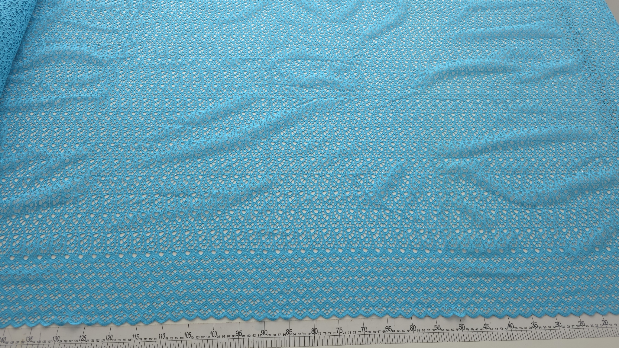 Față de materialele sangallo simple, această sangallo perforată turcoaz cu cristale lipite se diferențiază prin combinația de broderie tridimensională, decupaje largi și strălucire punctuală. Lățimea de aprox. 1,35 m permite croirea panourilor frontale fără îmbinări vizibile. Originea din Thailanda confirmă precizia decupajelor și calitatea broderiei.