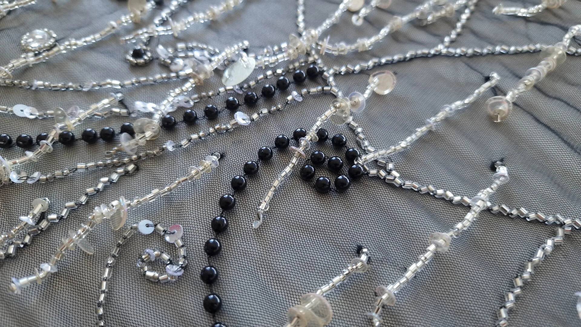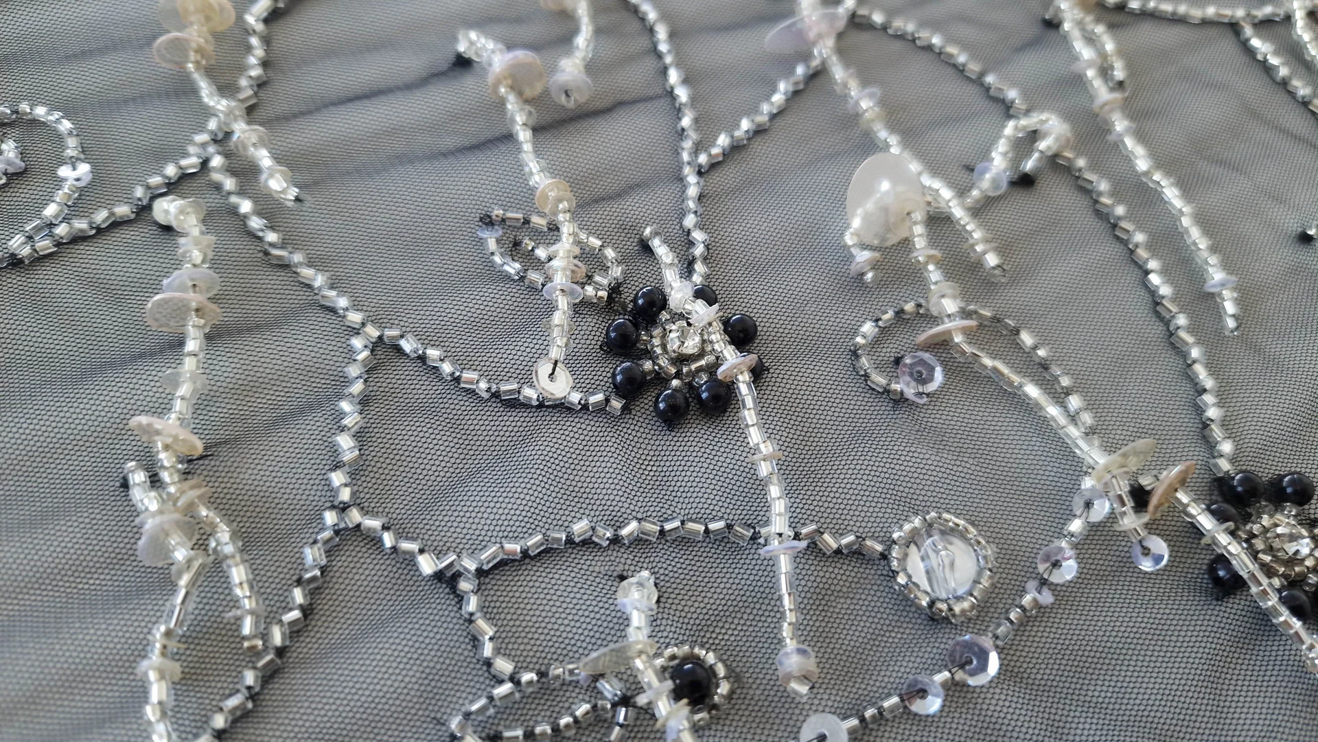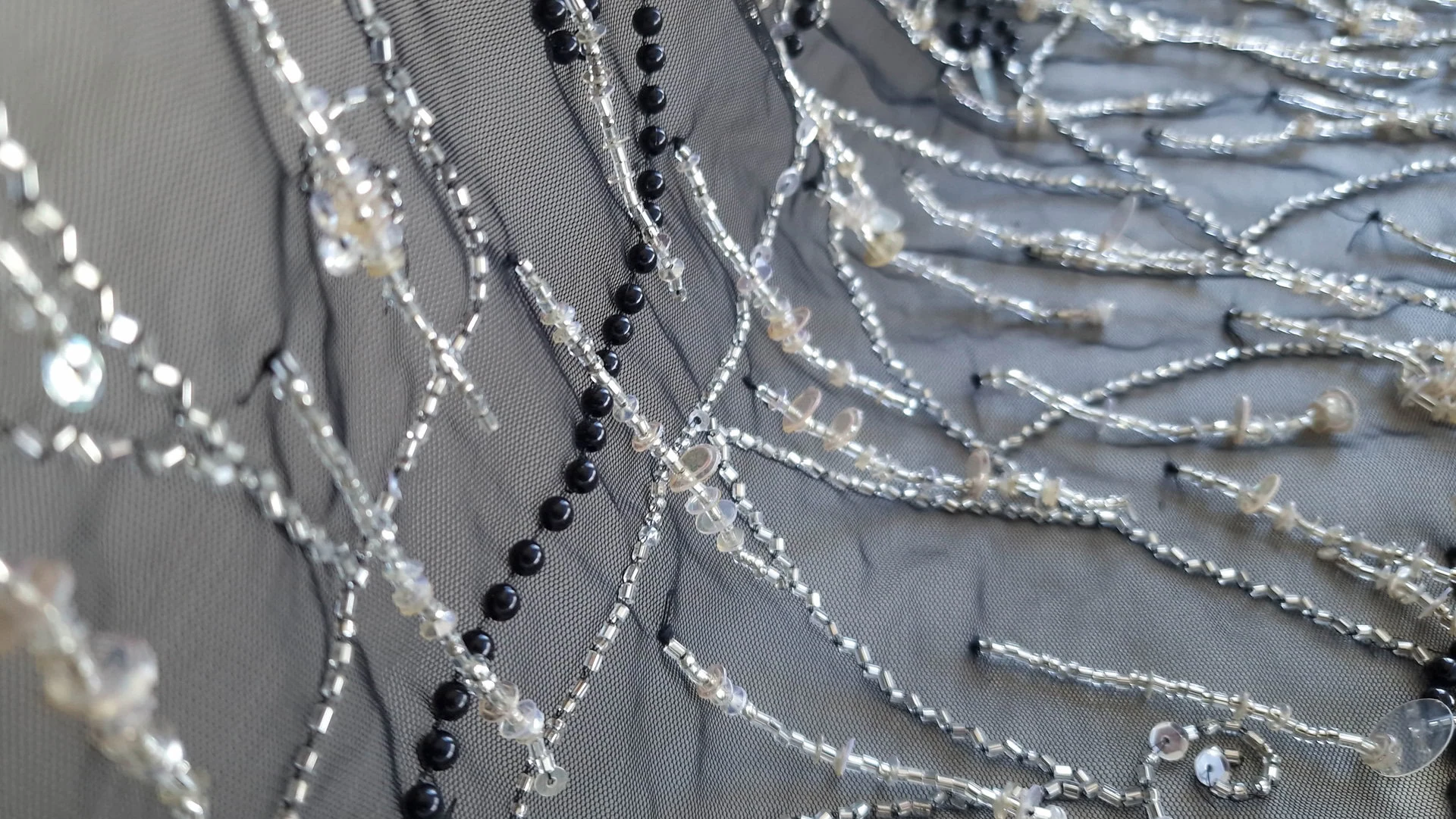 Broderie cu franjuri negri realizata manual , cu cristale, paiete, mărgele si micropaiete în nuanțe de negru, toate cusute pe tulle in aceeasi nuanta, usor elastic. Fiecare detaliu al broderiei transformă orice ținută într-o operă de artă autentică. Paietele strălucesc delicat, captând lumina și creând reflexii care adaugă eleganță. Mărgelele, atent selectate și plasate, aduc o notă de rafinament și complexitate, în timp ce micropaietele adaugă o textură subtilă și sofisticată. Cristalele, cusute pe tulle-ul ușor elastic, aduc grație, conferind broderiei un aer eteric și de poveste. Această piesă emană feminitate și rafinament, fiind perfectă pentru ocazii speciale unde se dorește un look deosebit și memorabil.
