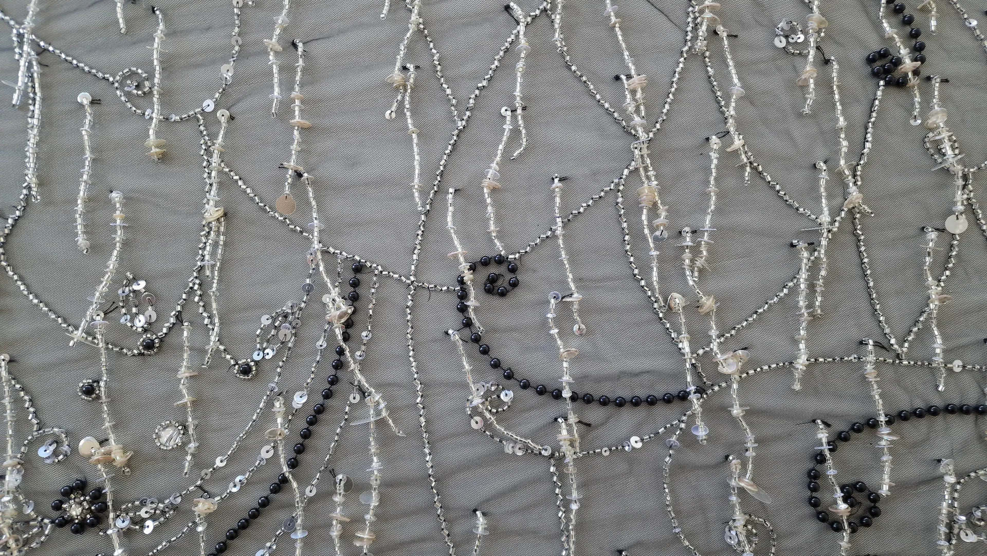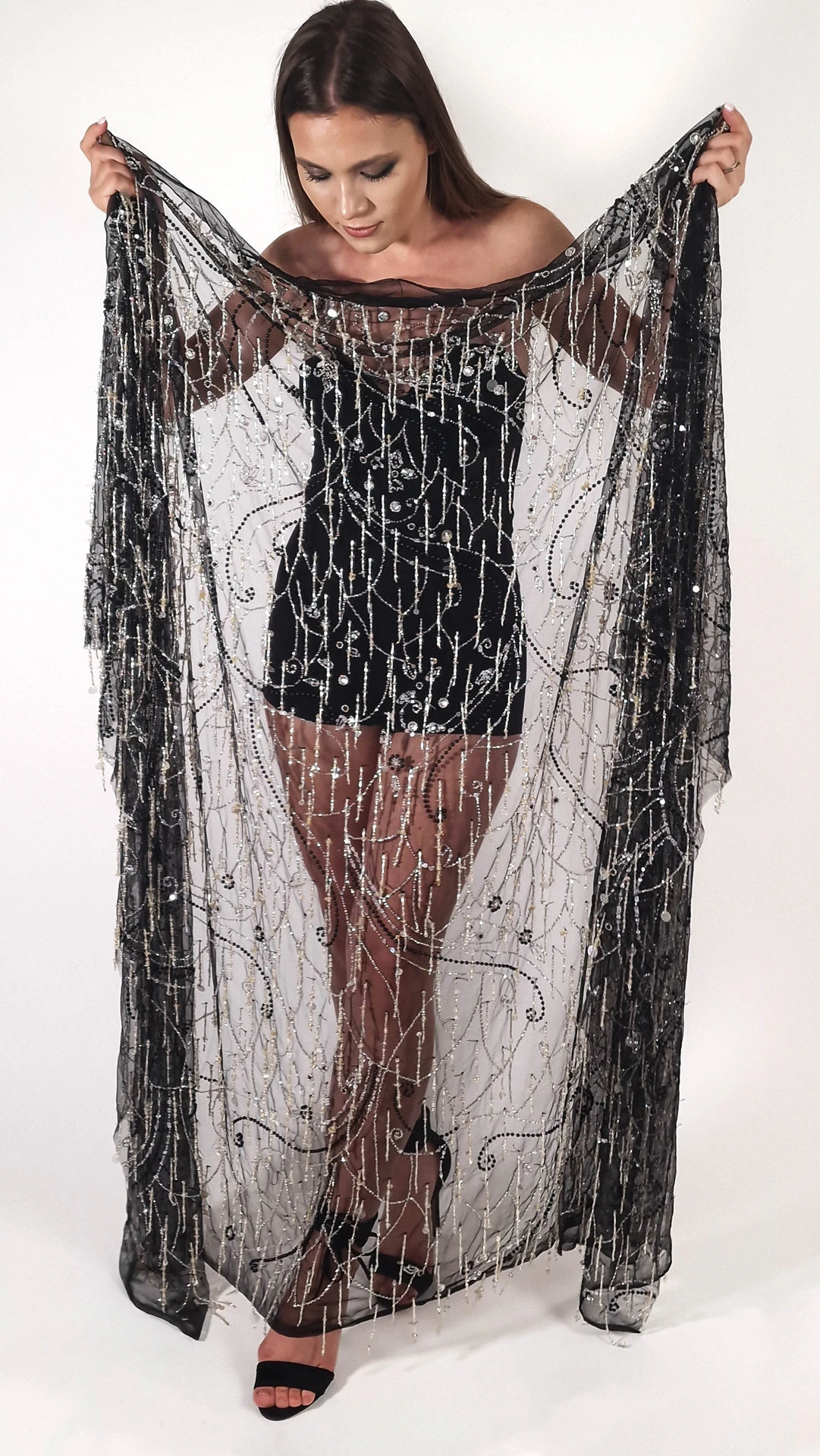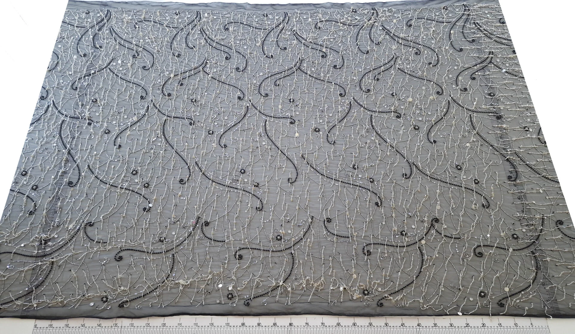 Broderie cu franjuri negri realizata manual , cu cristale, paiete, mărgele si micropaiete în nuanțe de negru, toate cusute pe tulle in aceeasi nuanta, usor elastic. Fiecare detaliu al broderiei transformă orice ținută într-o operă de artă autentică. Paietele strălucesc delicat, captând lumina și creând reflexii care adaugă eleganță. Mărgelele, atent selectate și plasate, aduc o notă de rafinament și complexitate, în timp ce micropaietele adaugă o textură subtilă și sofisticată. Cristalele, cusute pe tulle-ul ușor elastic, aduc grație, conferind broderiei un aer eteric și de poveste. Această piesă emană feminitate și rafinament, fiind perfectă pentru ocazii speciale unde se dorește un look deosebit și memorabil.
