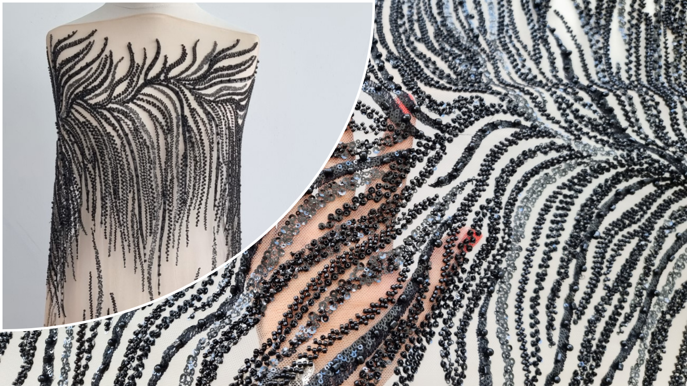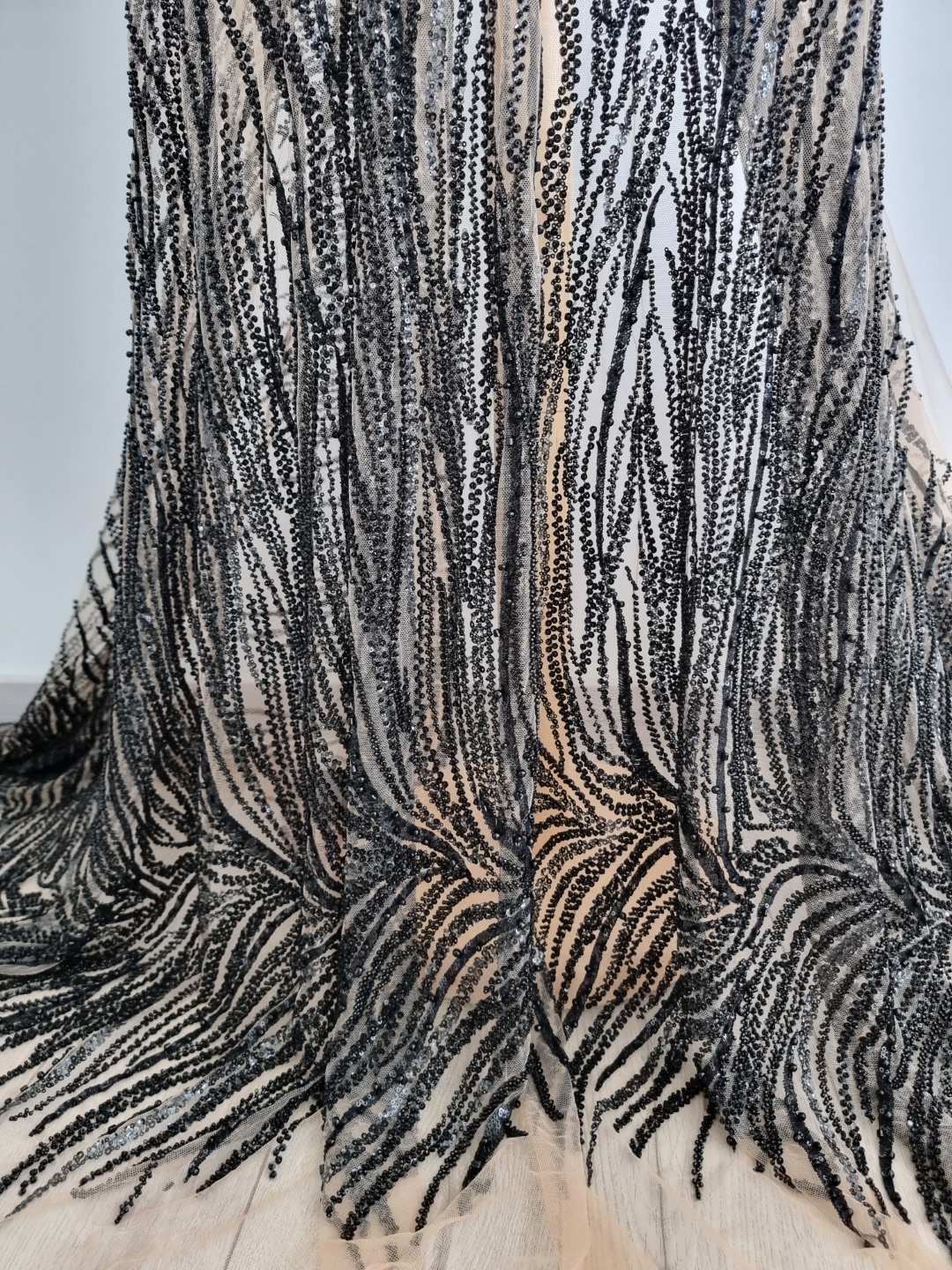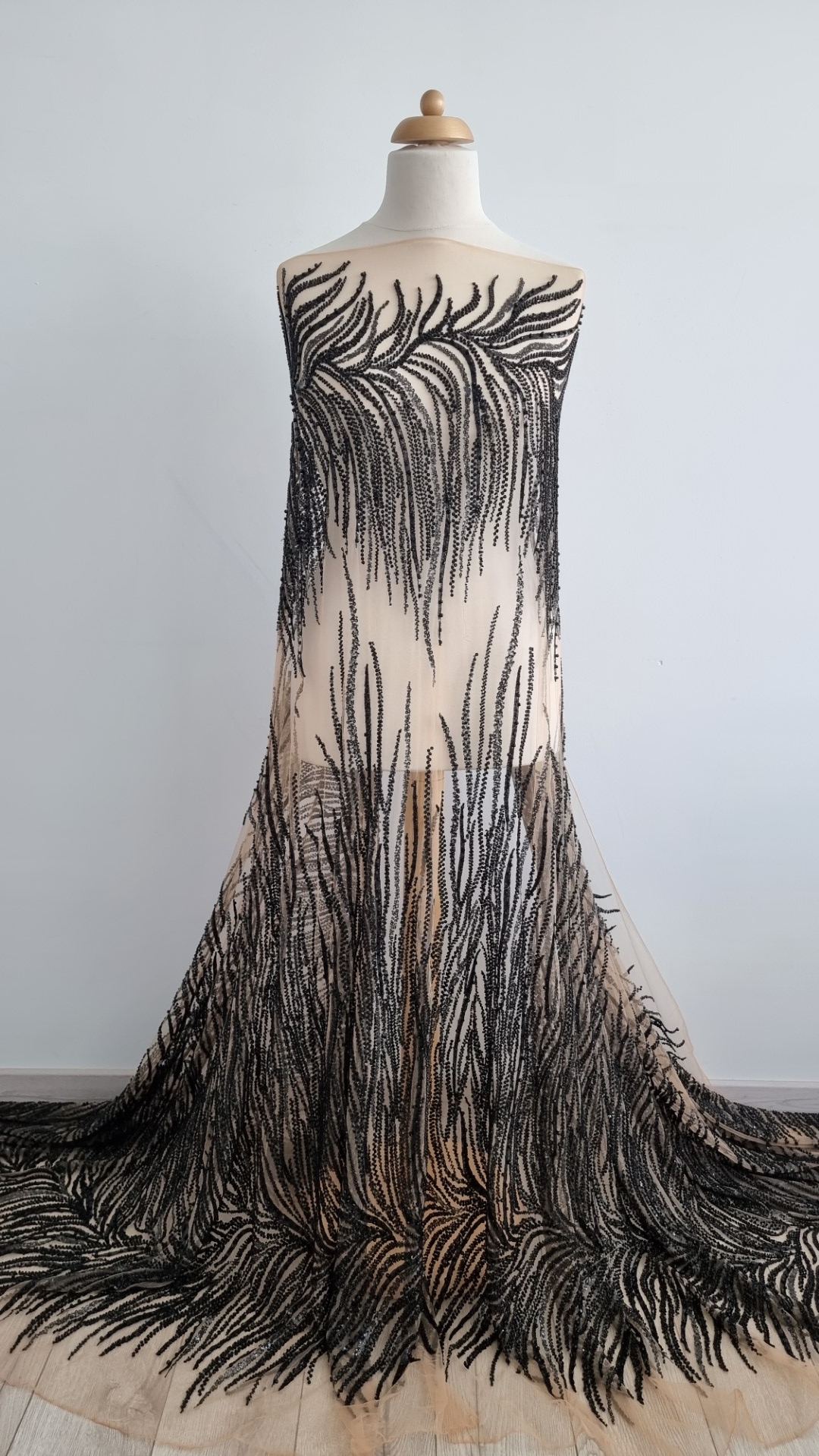 Broderie neagra accesorizata Gracious Beauty cu micropaiete de diferite dimensiuni si margele tubulare cusute pe tulle nude, usor elastic.