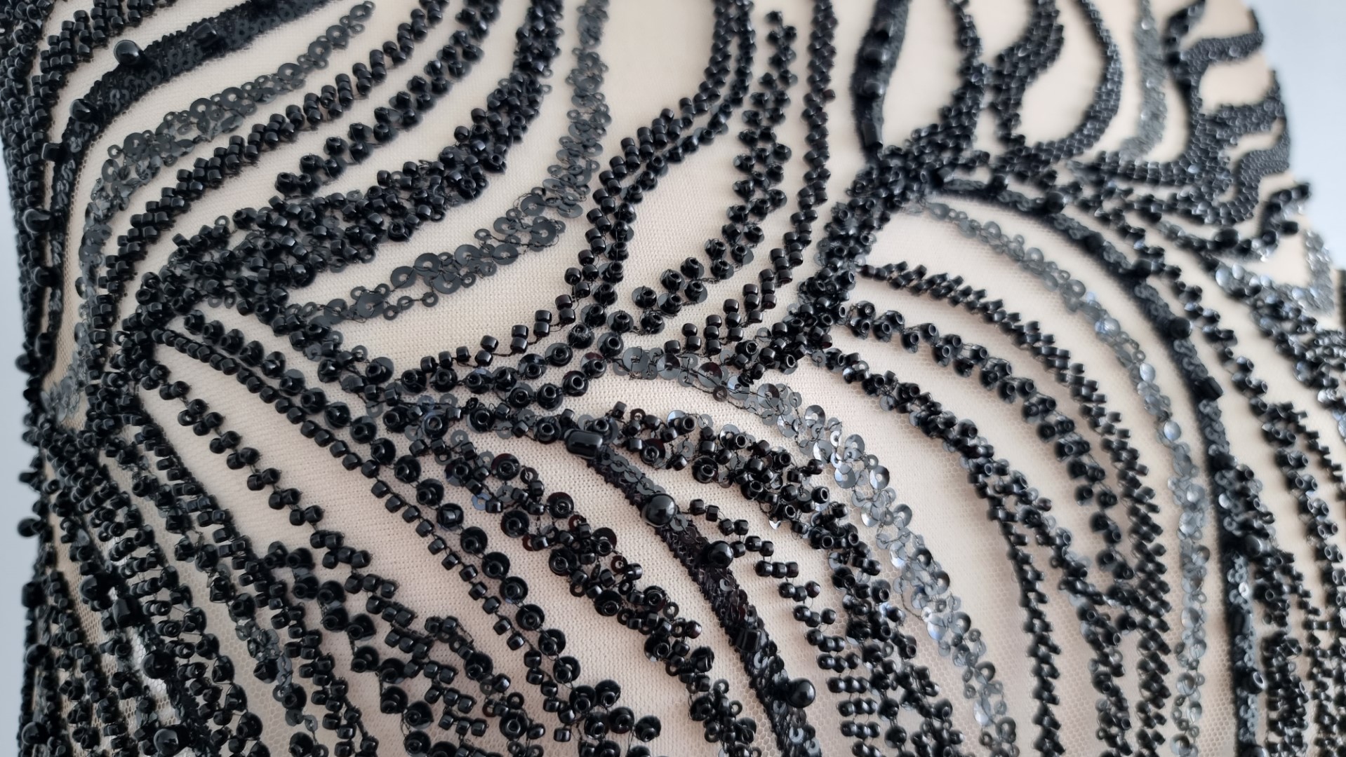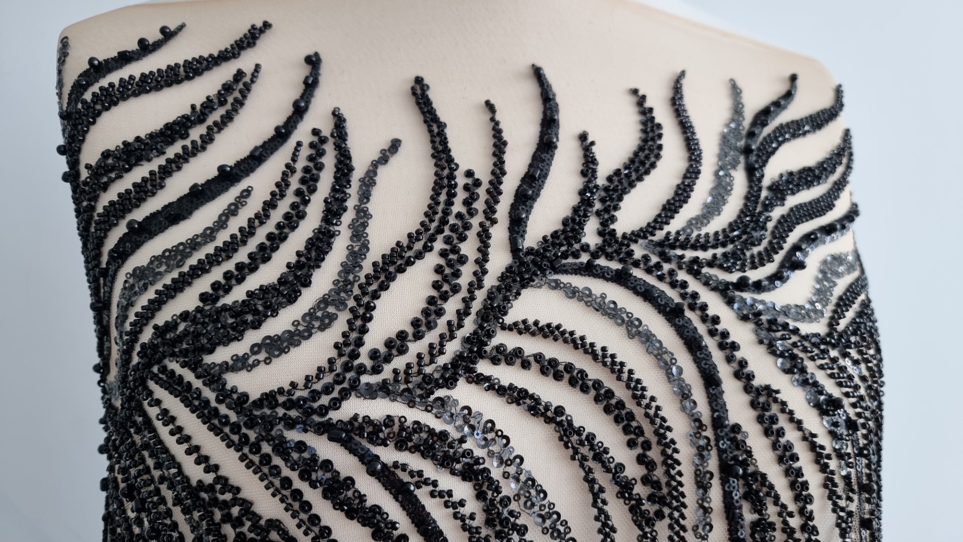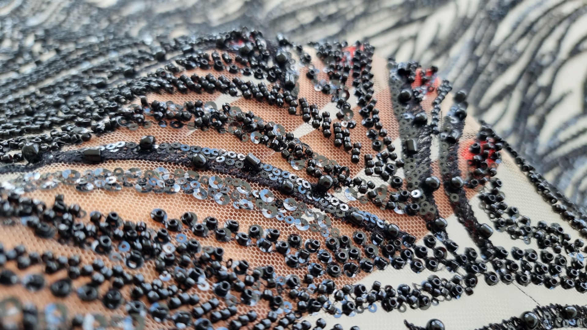 Broderie neagra accesorizata Gracious Beauty cu micropaiete de diferite dimensiuni si margele tubulare cusute pe tulle nude, usor elastic.