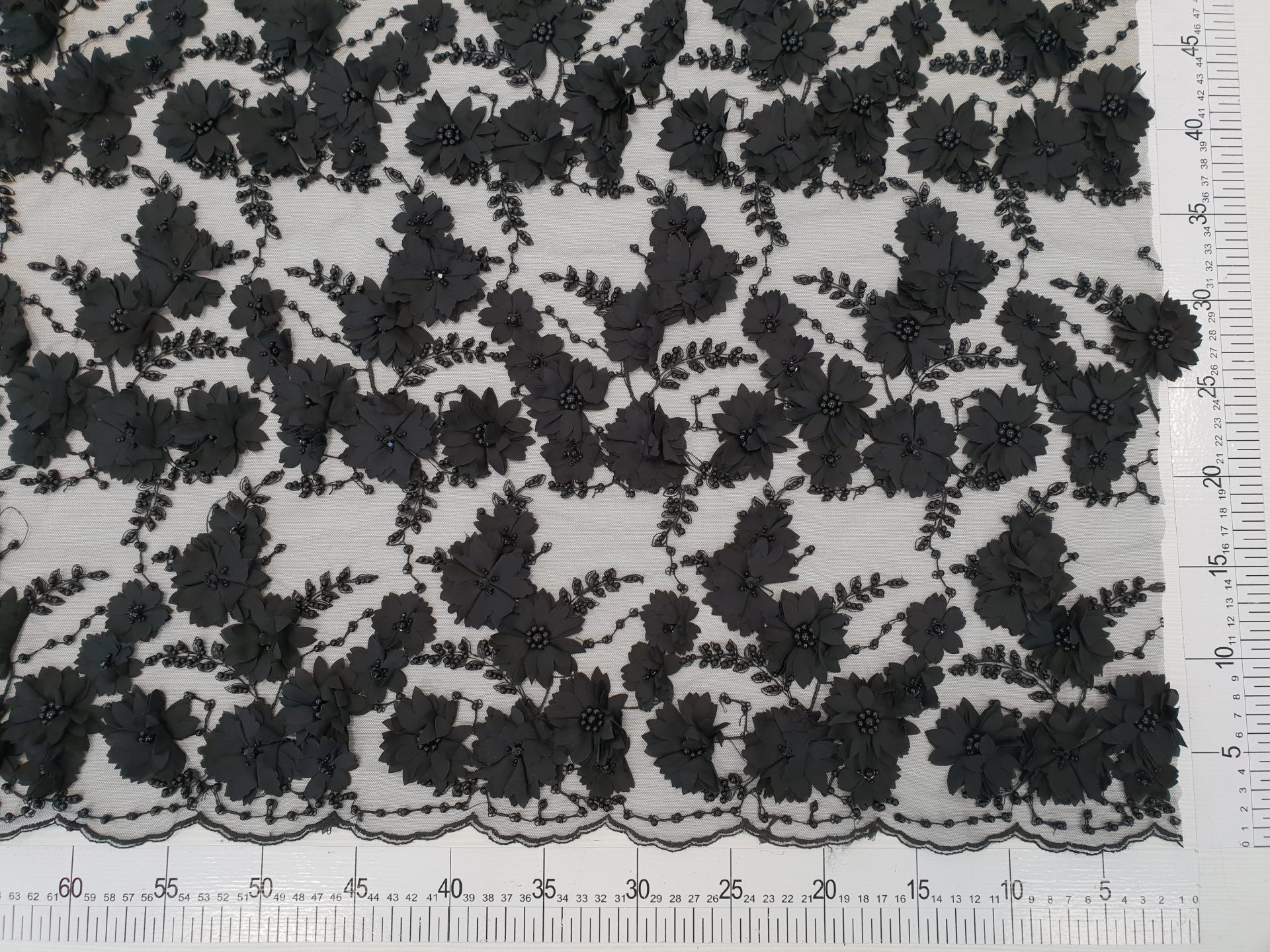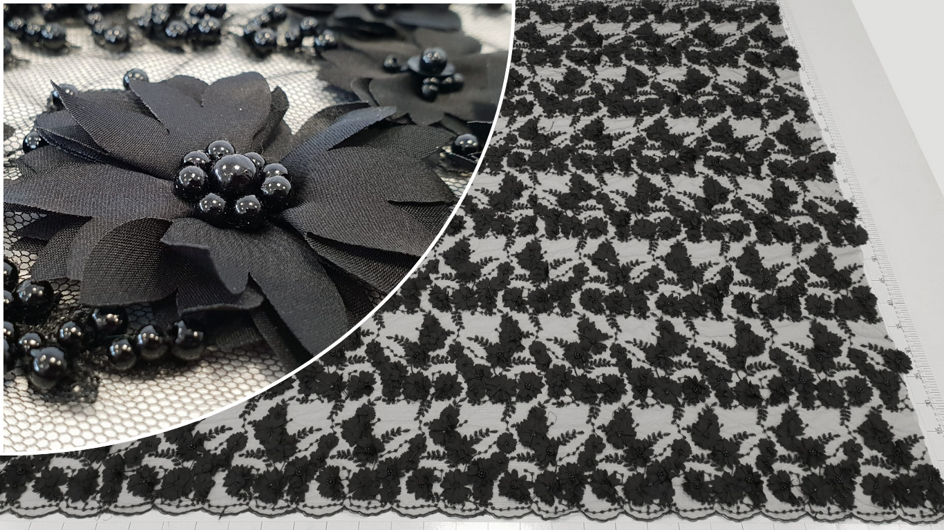 Broderie cu elemente florale 3D negre, accesorizata cu margele si cristale de aceeasi culoare.