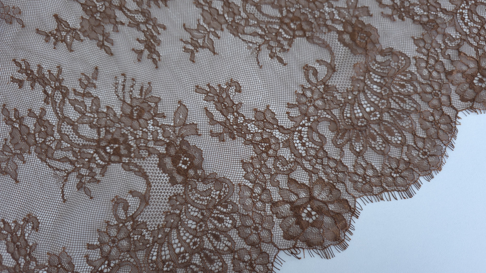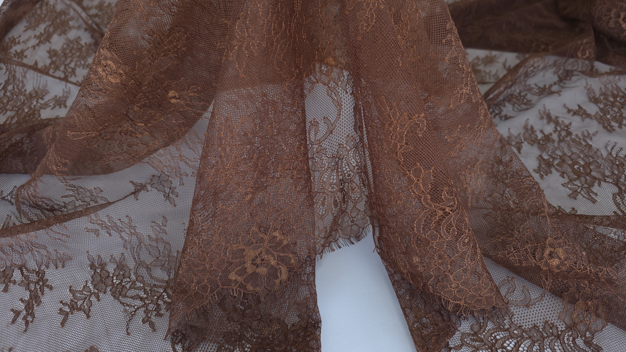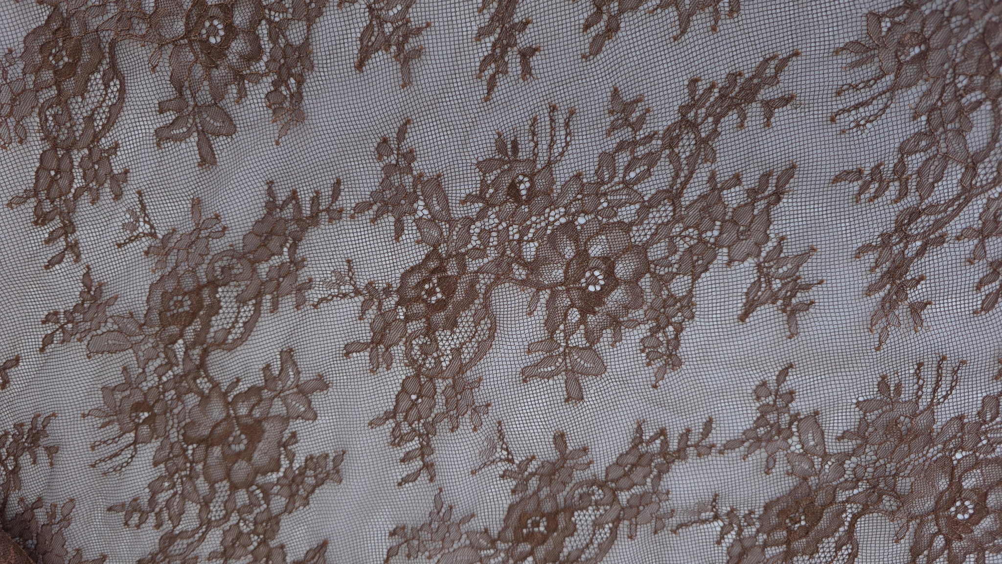 Dantela tip Chantilly maro cupon 300 cm este un material rafinat si suplu. Este definit de un joc vizual subtil de umbre si lumini. Astfel, acesta evidentiaza frumusetea detaliilor prin transparenta sa naturala.