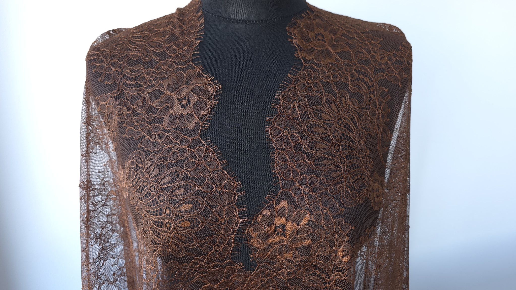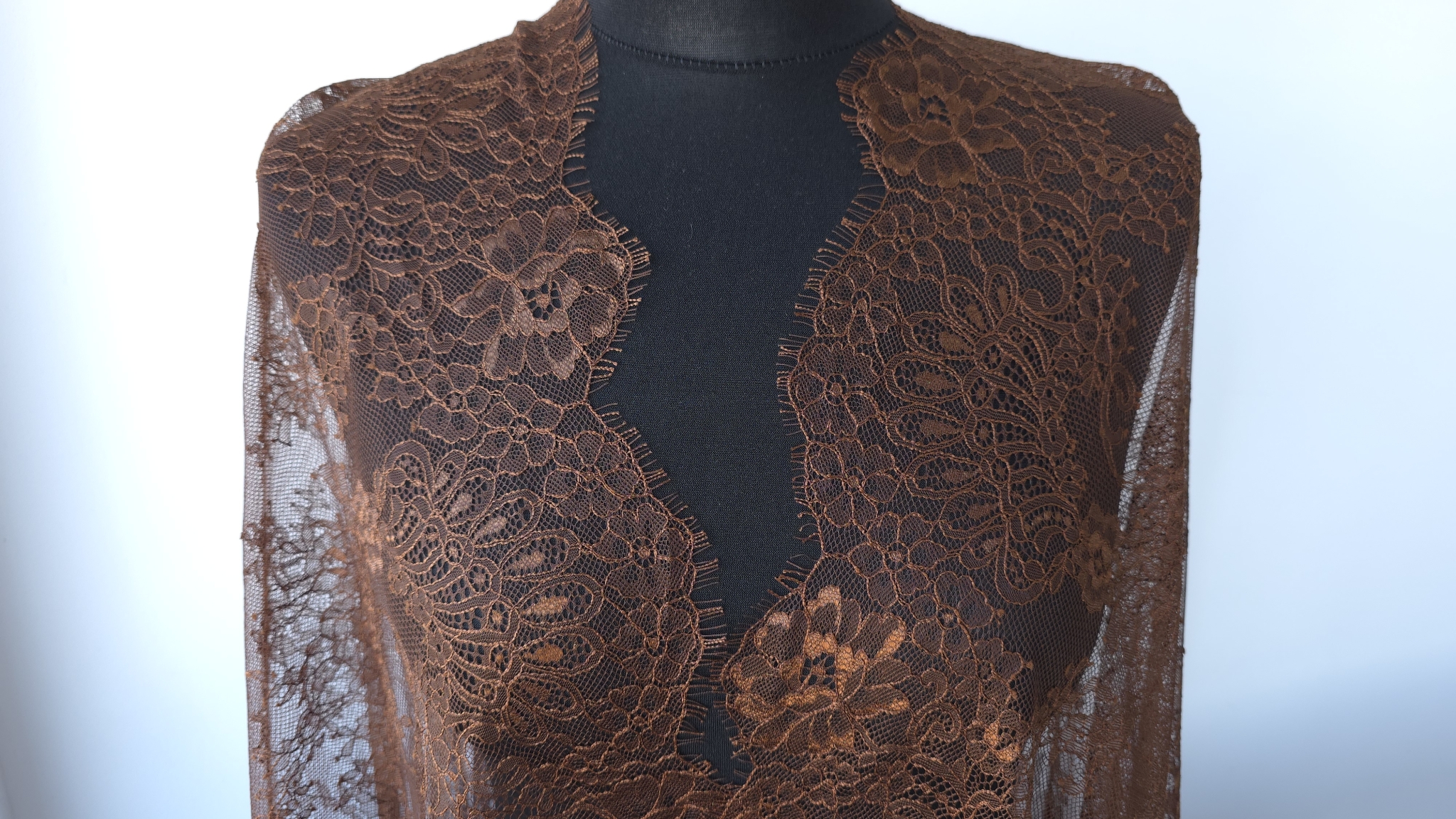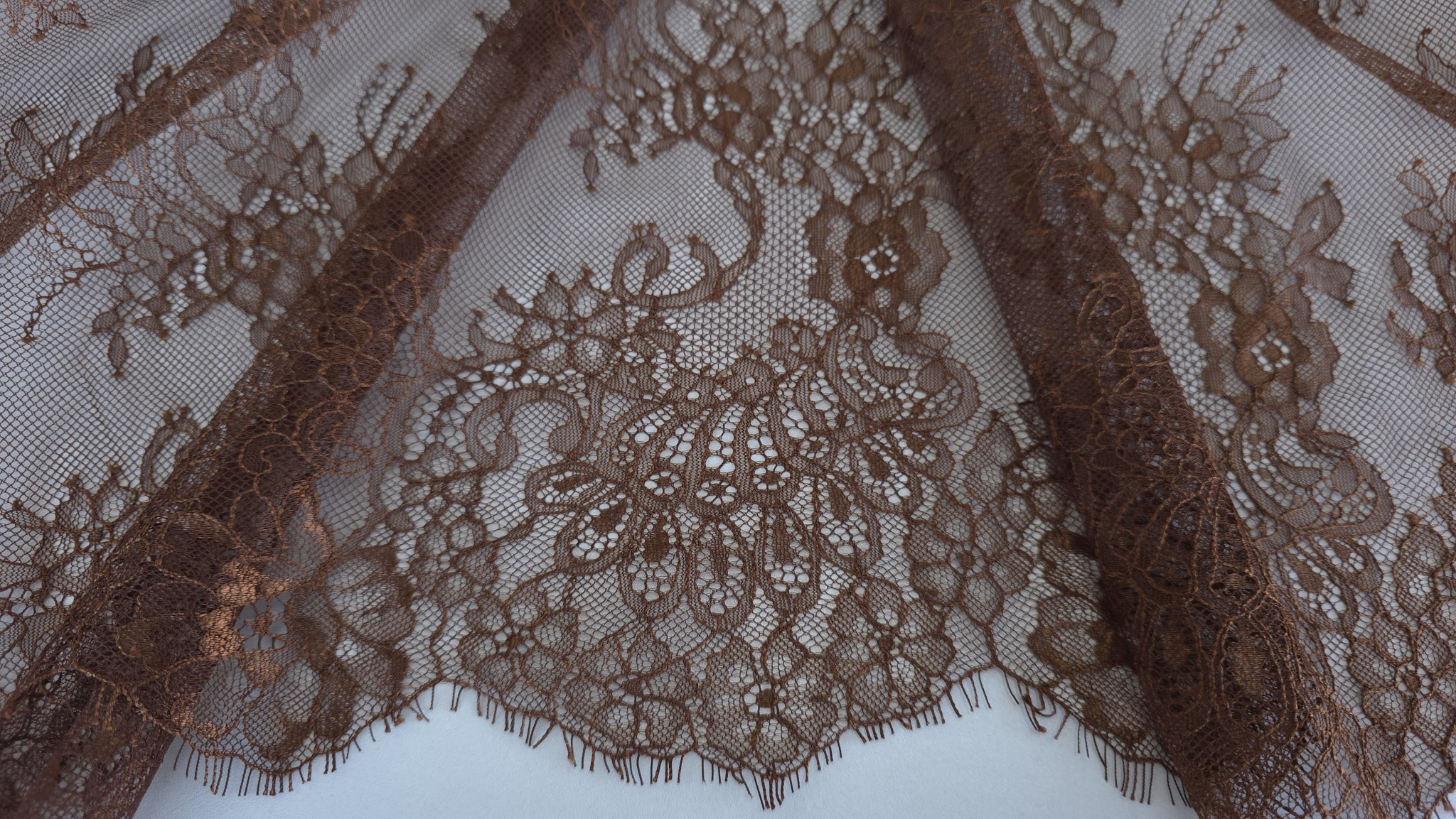 Ca dantela fina maro pentru rochii de seara, alegerea acestei nuante profunde ofera o alternativa calda la negrul clasic. Efectul vizual creat de o dantela transparenta maro permite folosirea ei in mod creativ peste o captuseala contrastanta. Totodata, se poate utiliza ton pe ton pentru o tinuta discreta si eleganta.