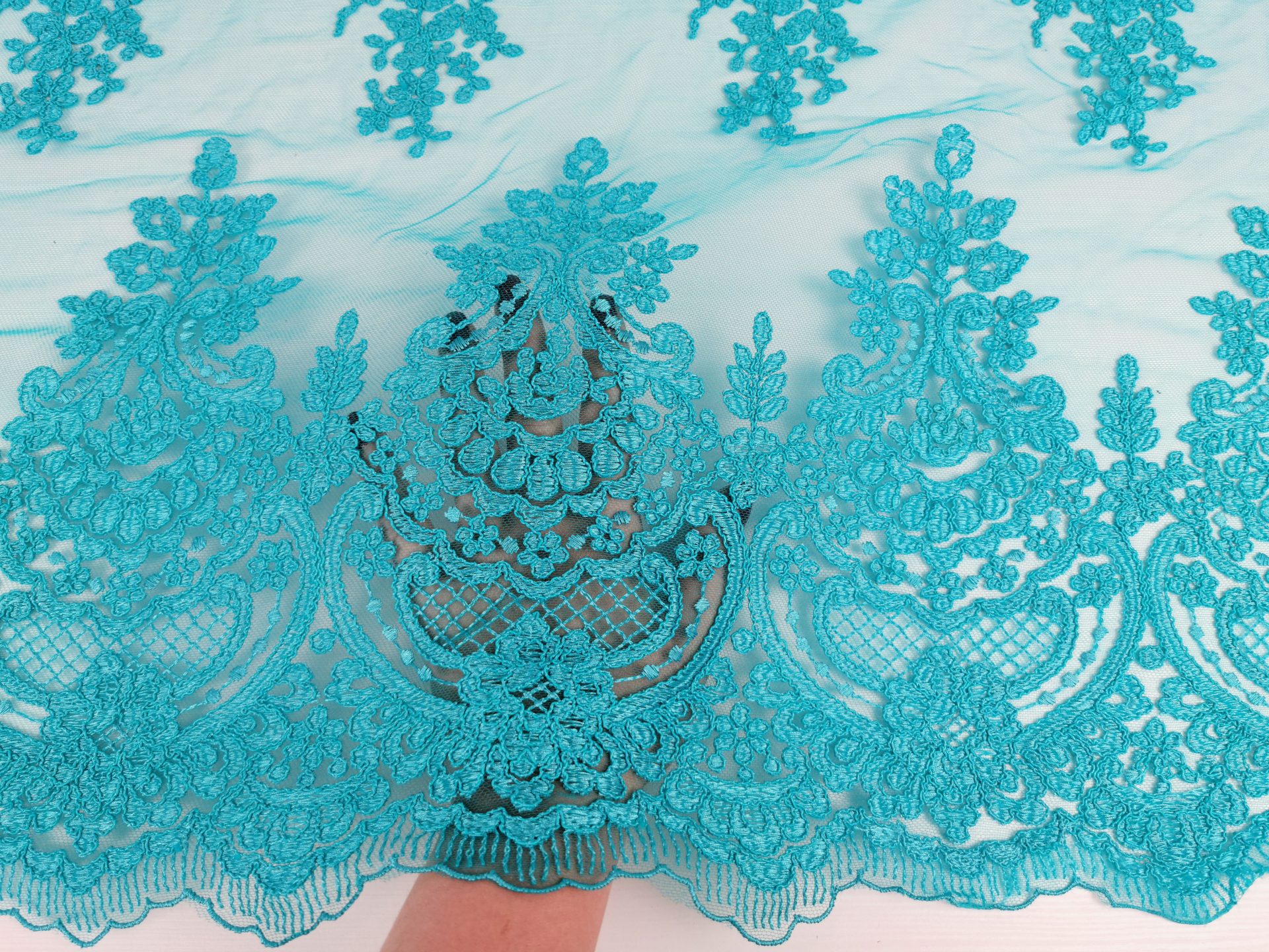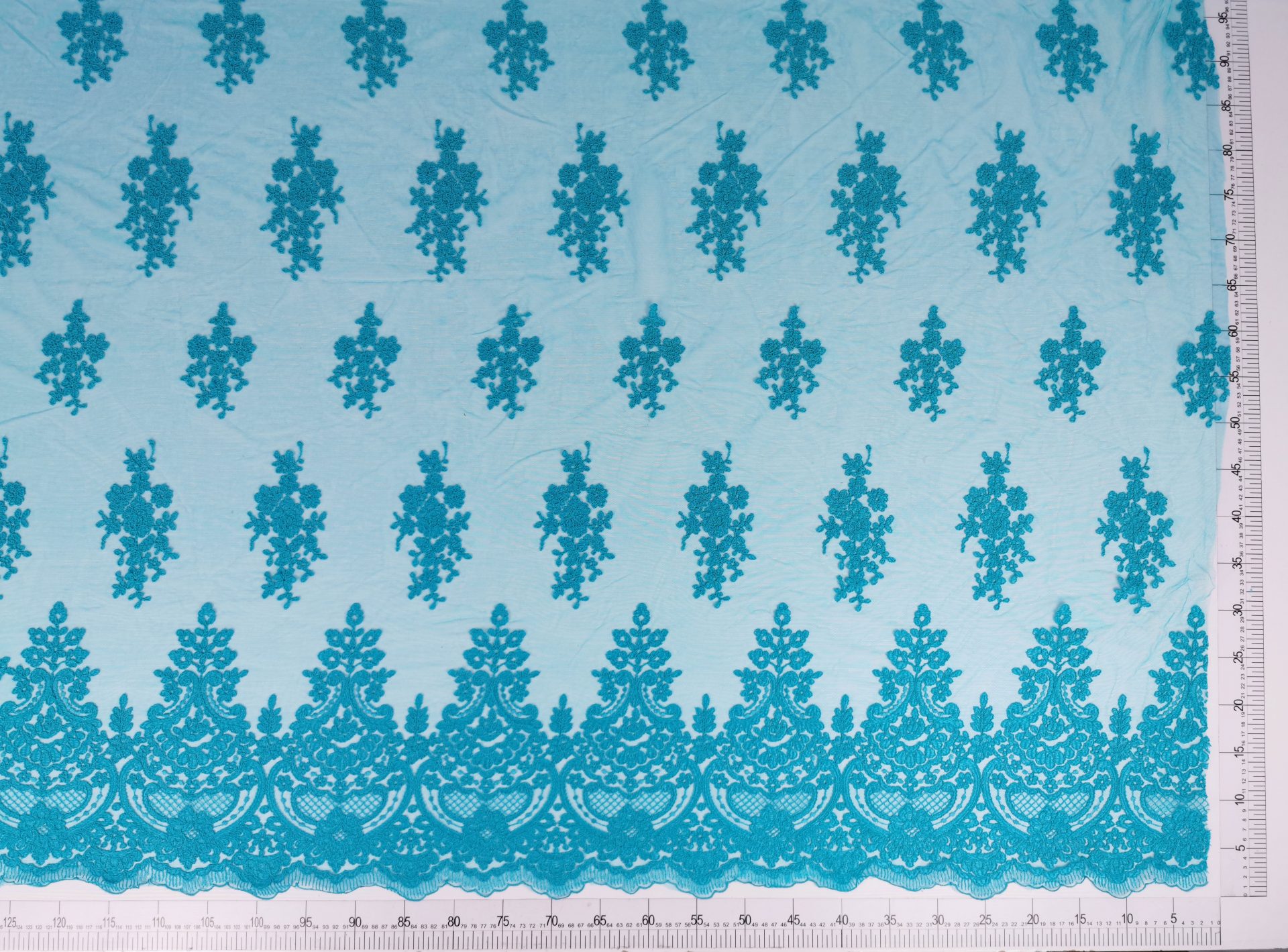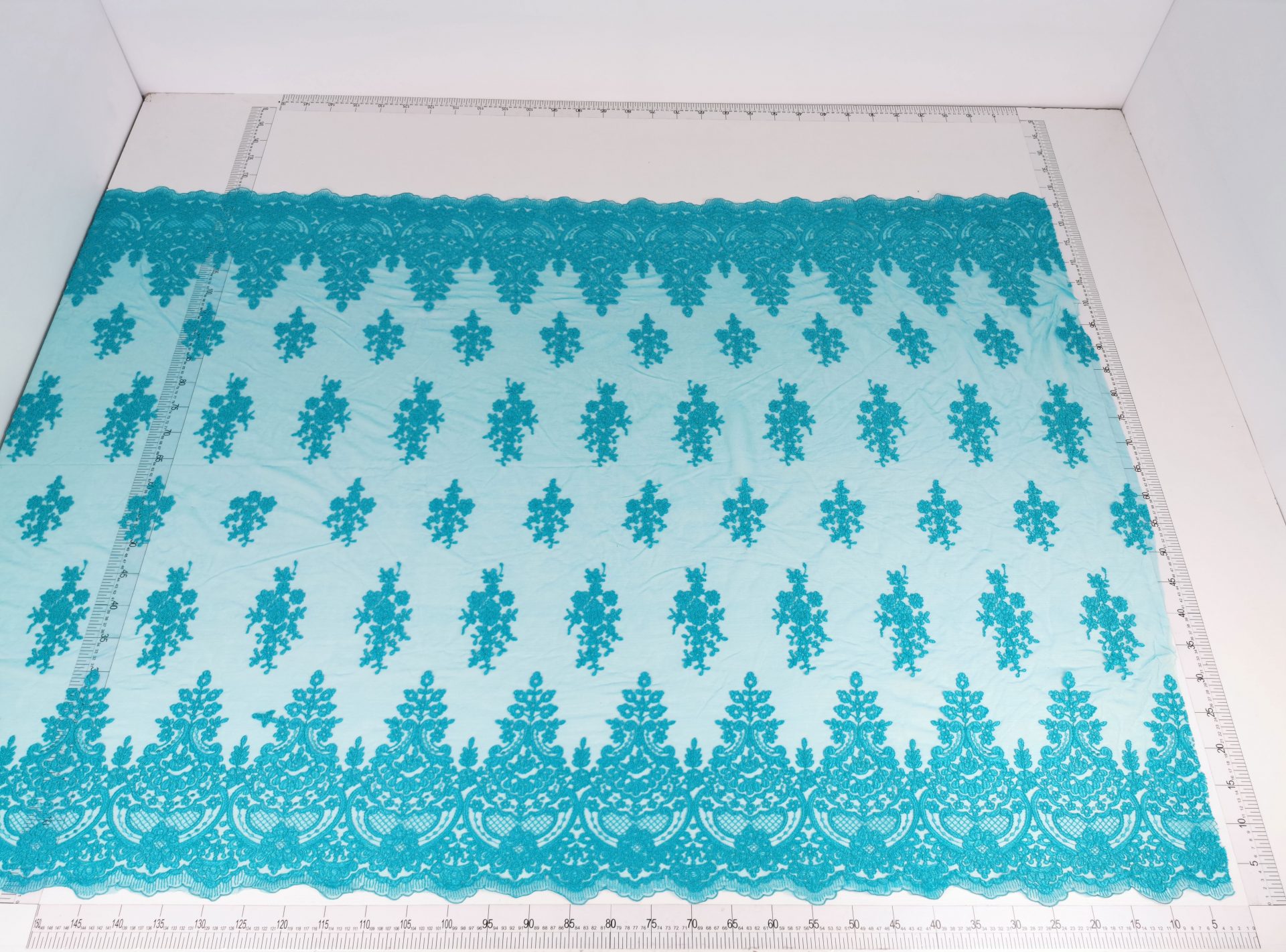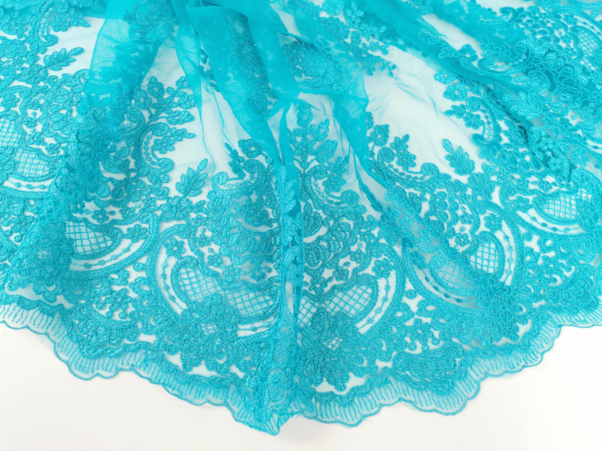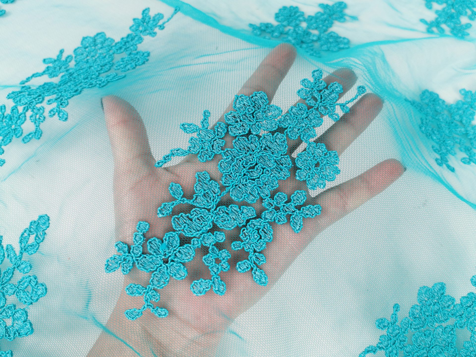 Dantela turquoise cu aspect siretat, pe suport din tul in ton cu dantela.